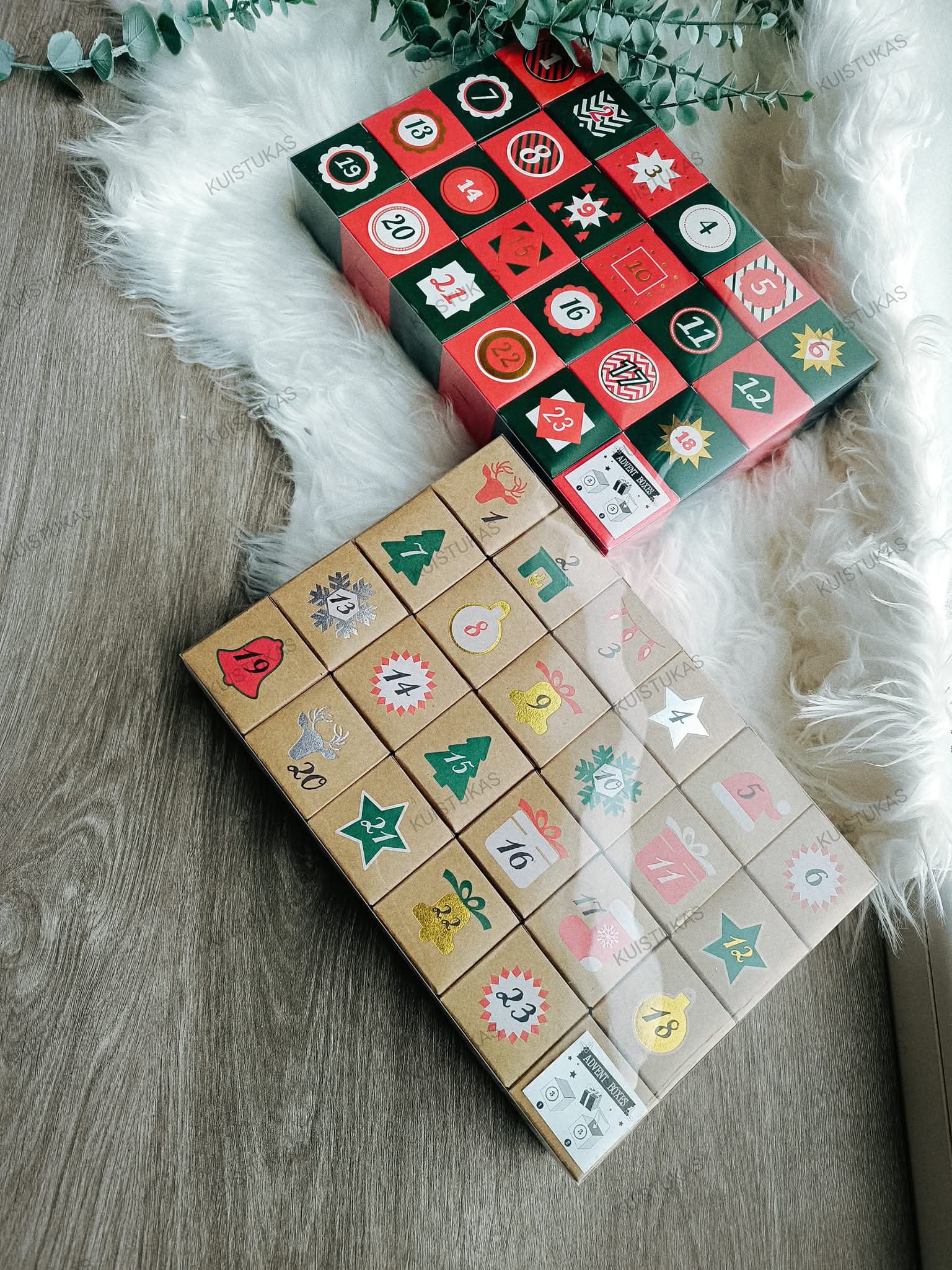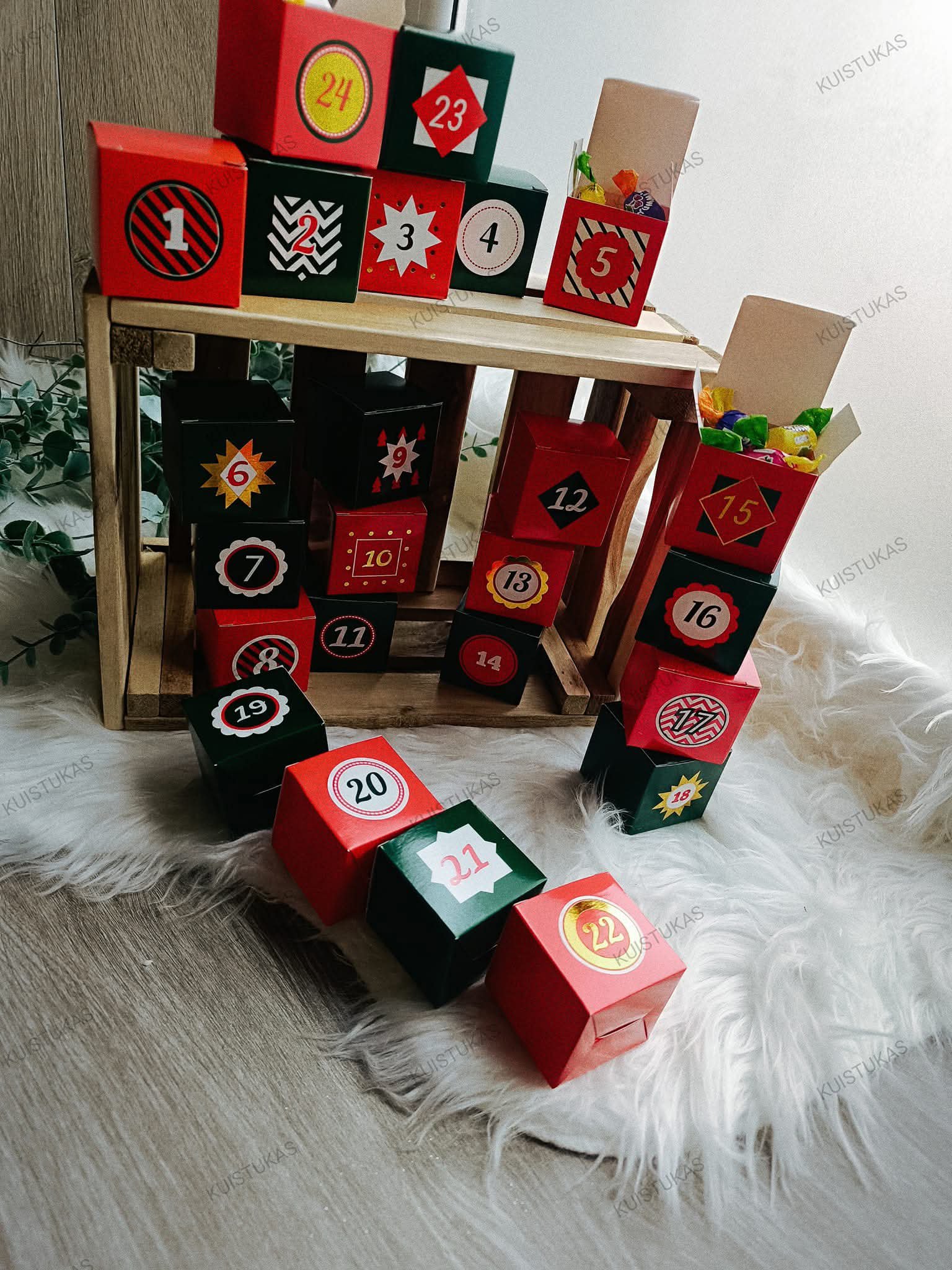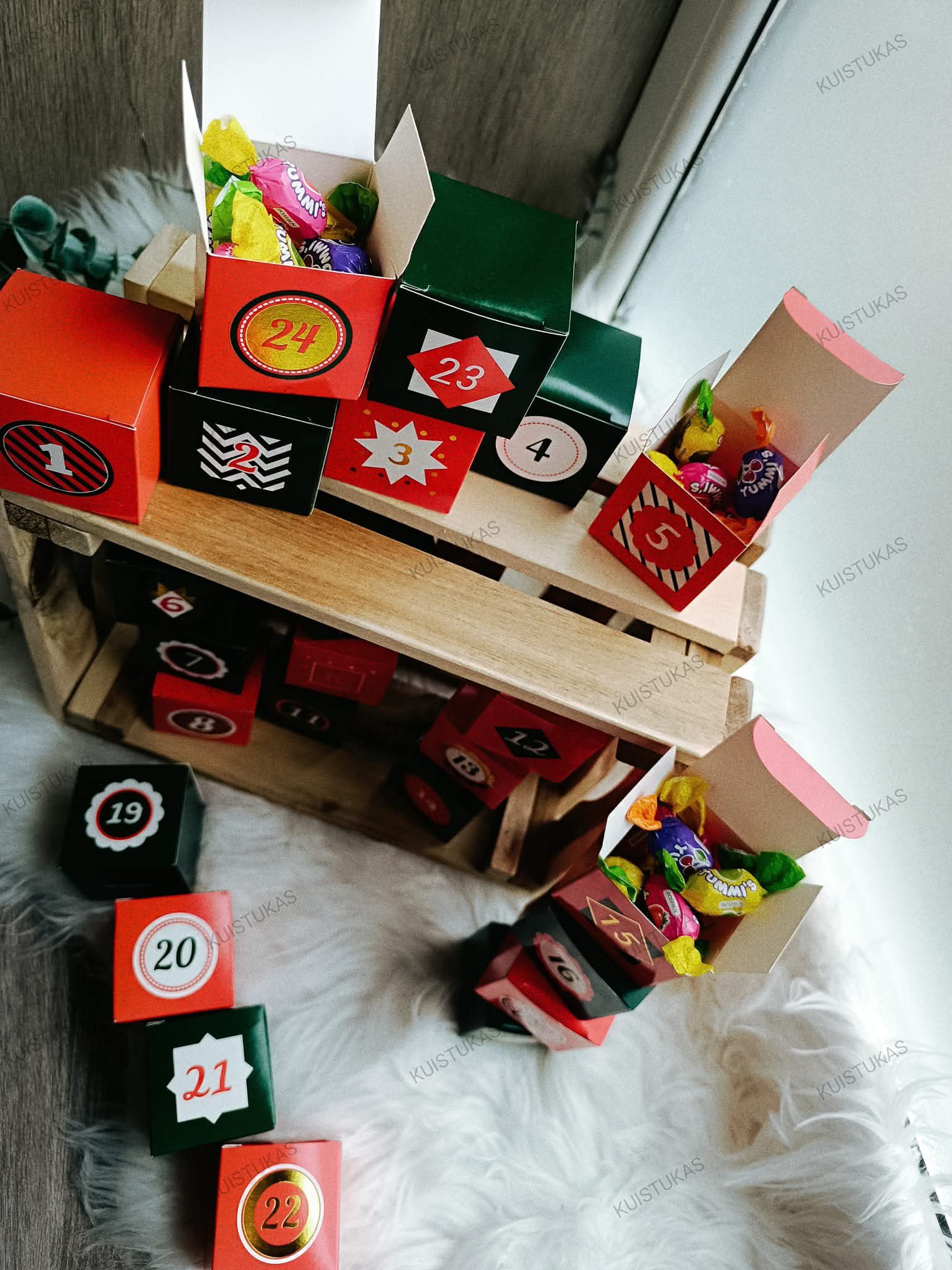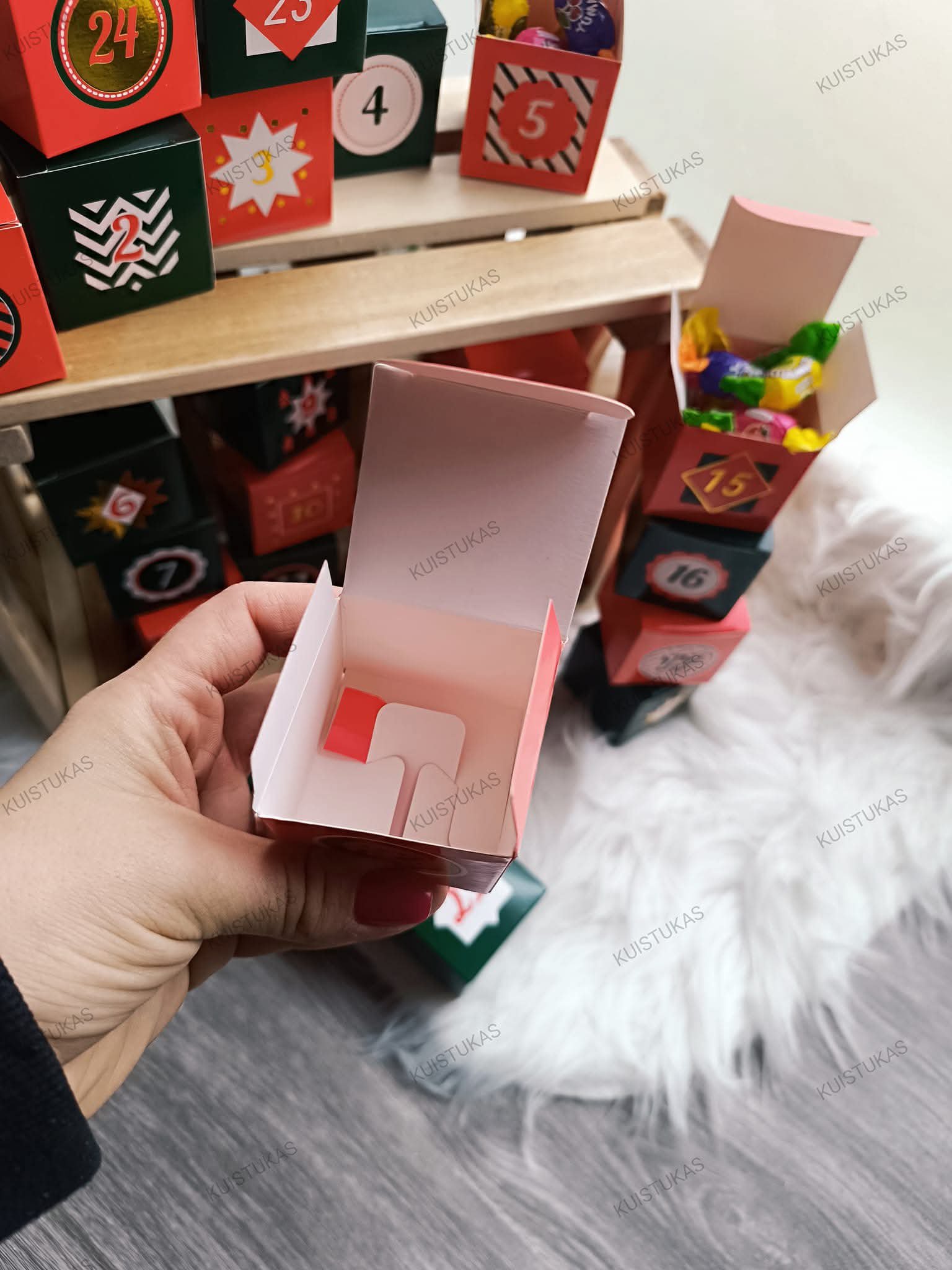 Skirtingai nei dažniausiai kalendoriai, šis modelis turi 24 tuščias dėžutes , kurias galite pripildyti savo pasirinktomis staigmenomis: saldainiais, sausainukais, aksesuarais, mini žaisliukais ar net mažomis dovanėlėmis.