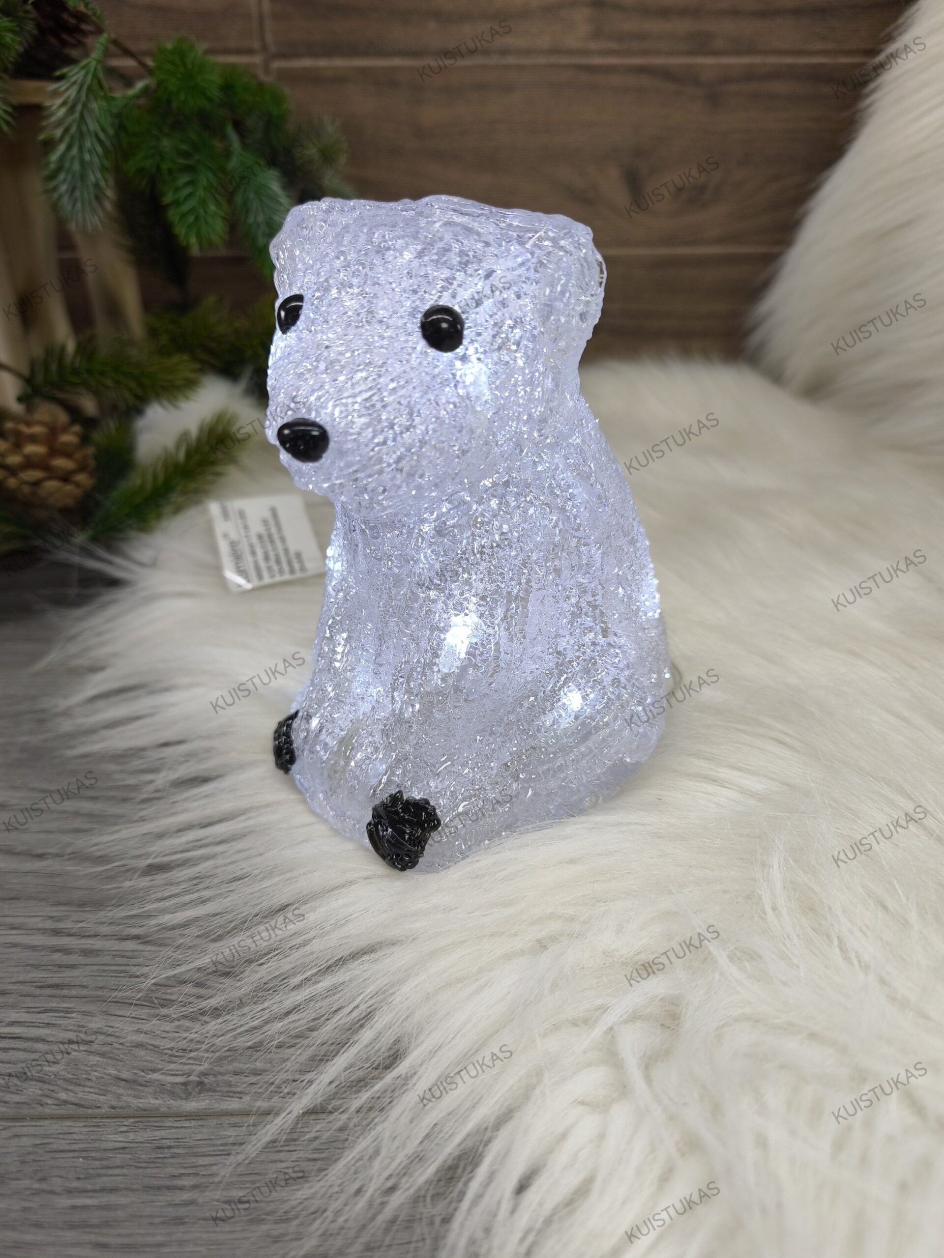 Šis dekoratyvinis meškiukas pagamintas iš skaidraus akrilo, kuris gražiai skleidžia šaltai baltą LED šviesą.