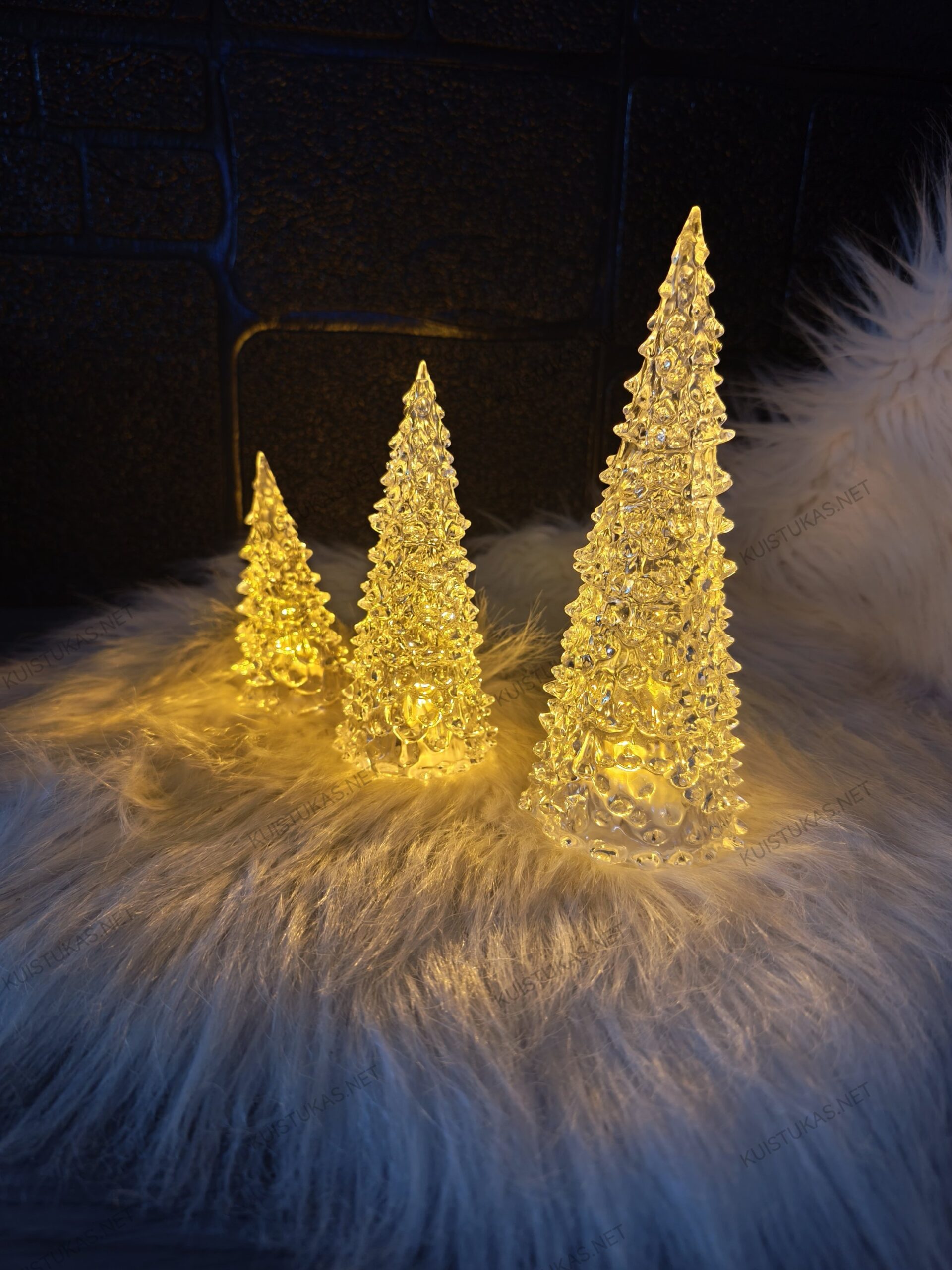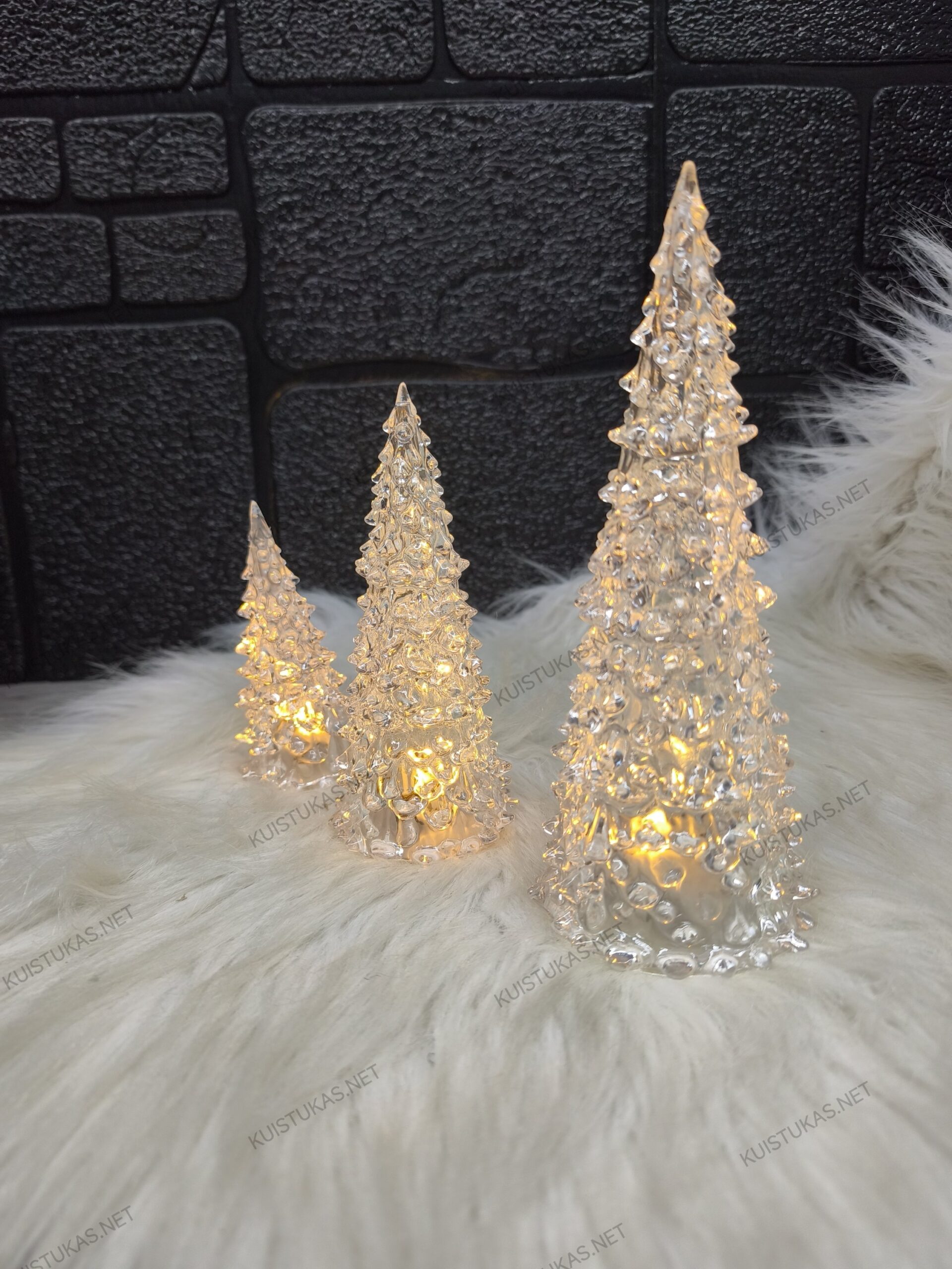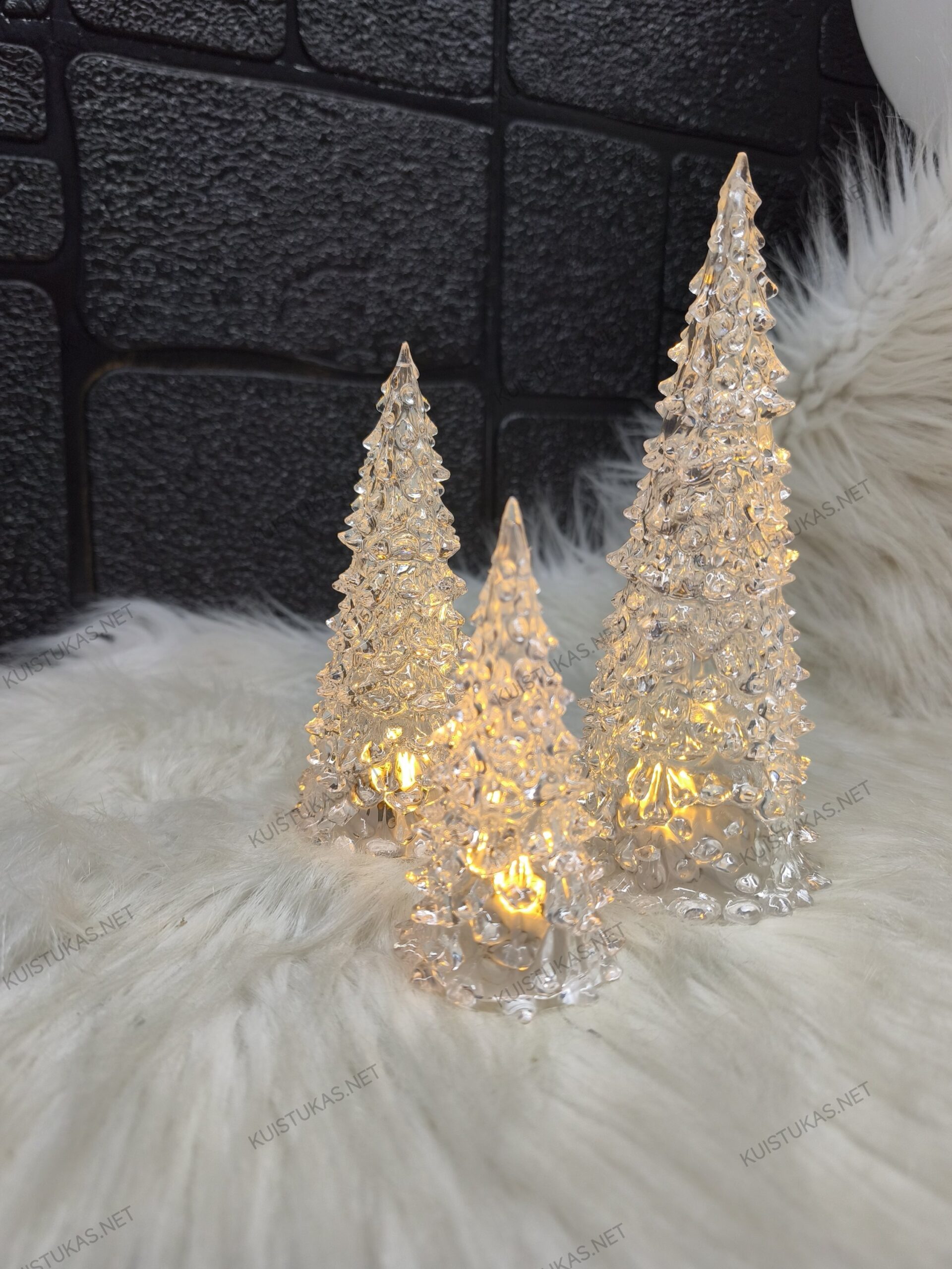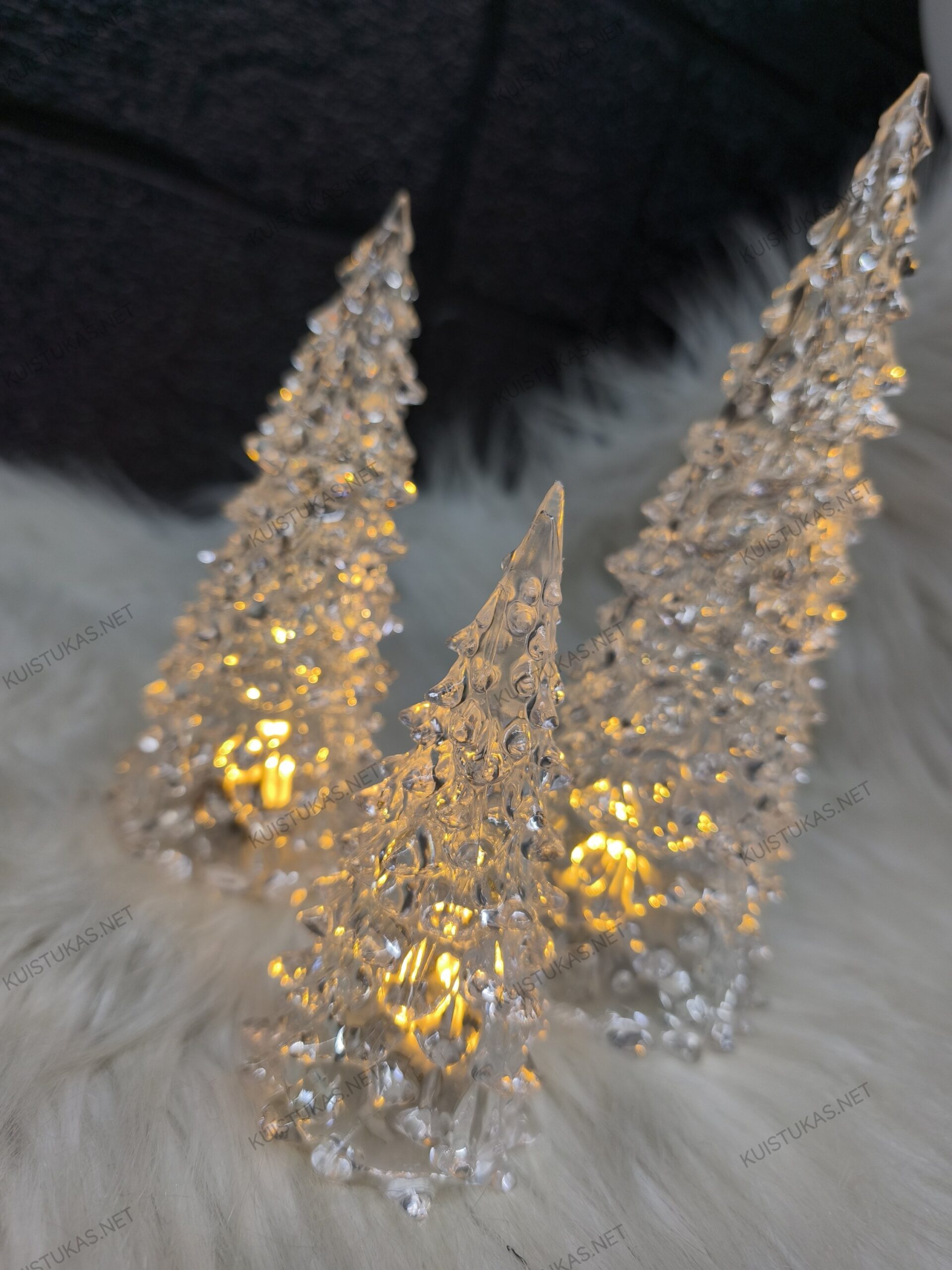 Eglutės pagamintos iš aukštos kokybės akrilo plastiko, kuris užtikrina skaidrumą ir šviesos sklidimo efektą.