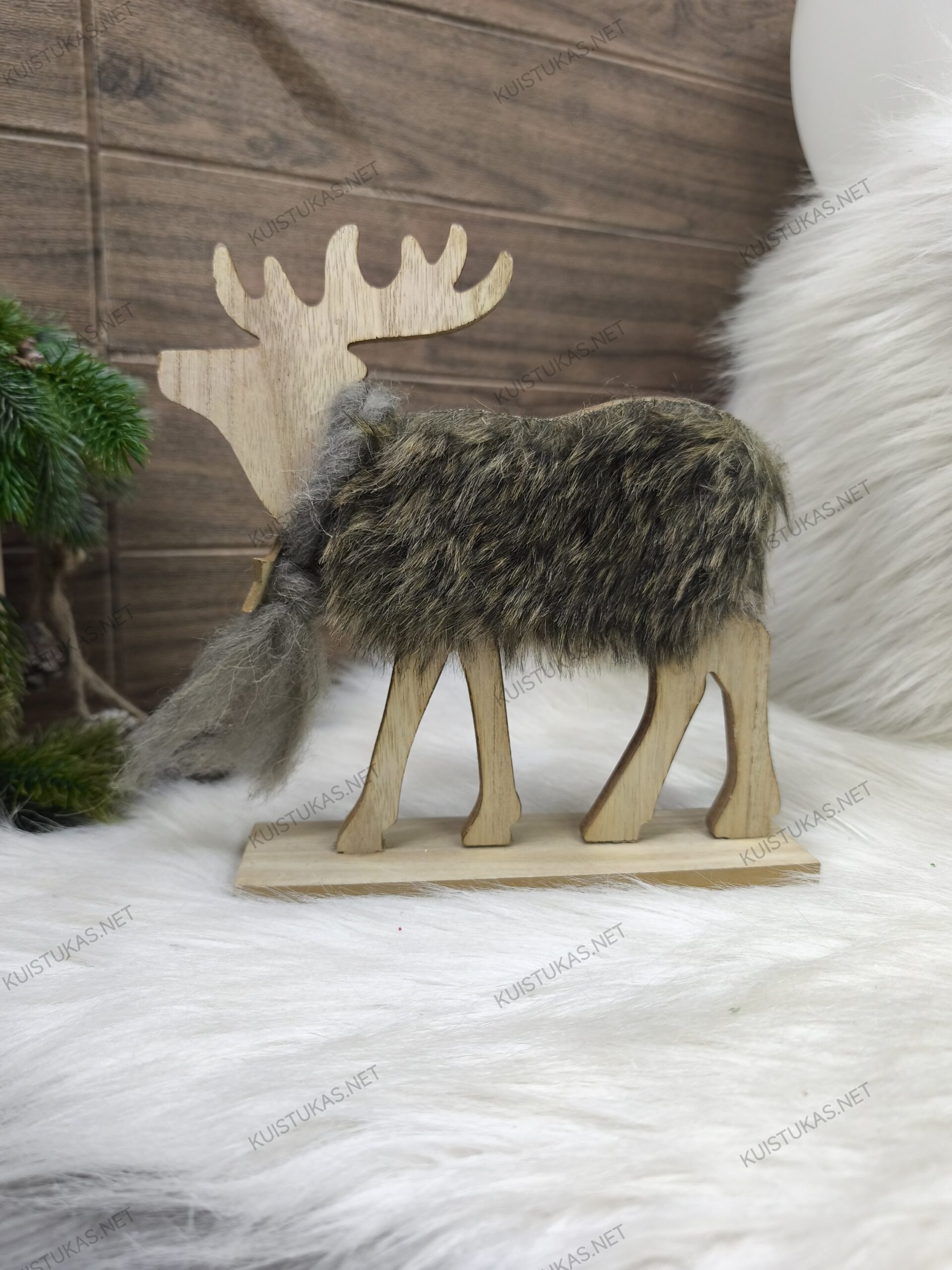 Ši išskirtinė dekoracija sukurta iš natūralios medienos ir dekoruota švelniu dirbtiniu kailiu, kuris suteikia šilumos ir tikroviškumo pojūtį.