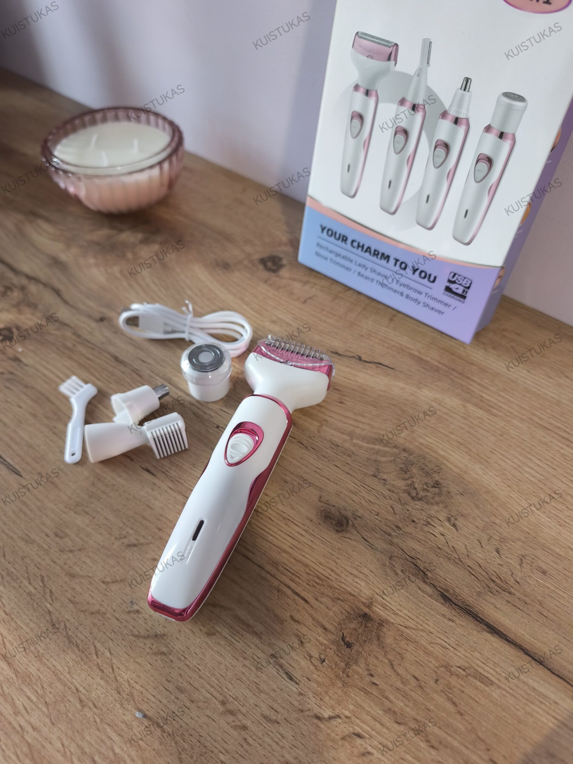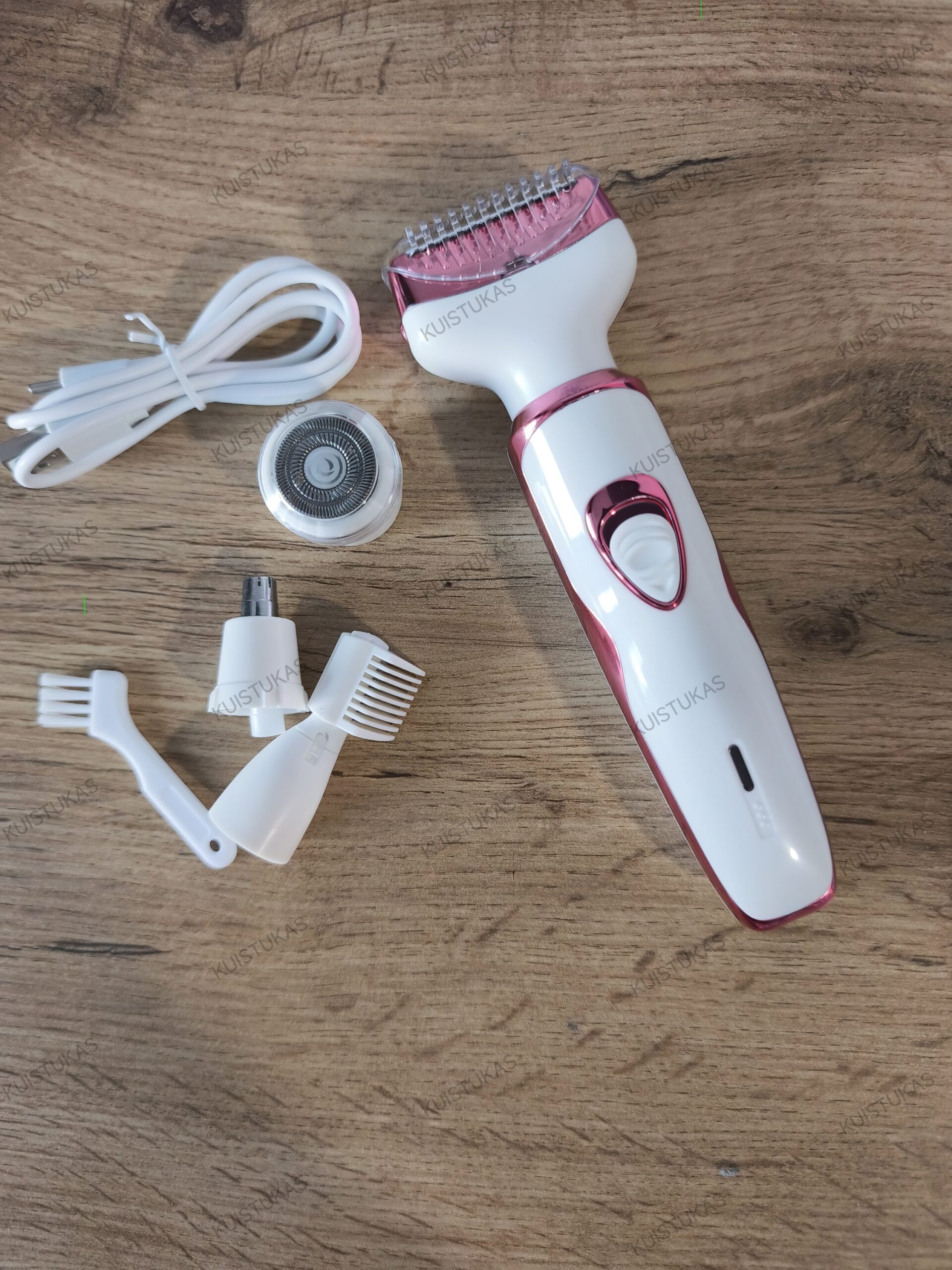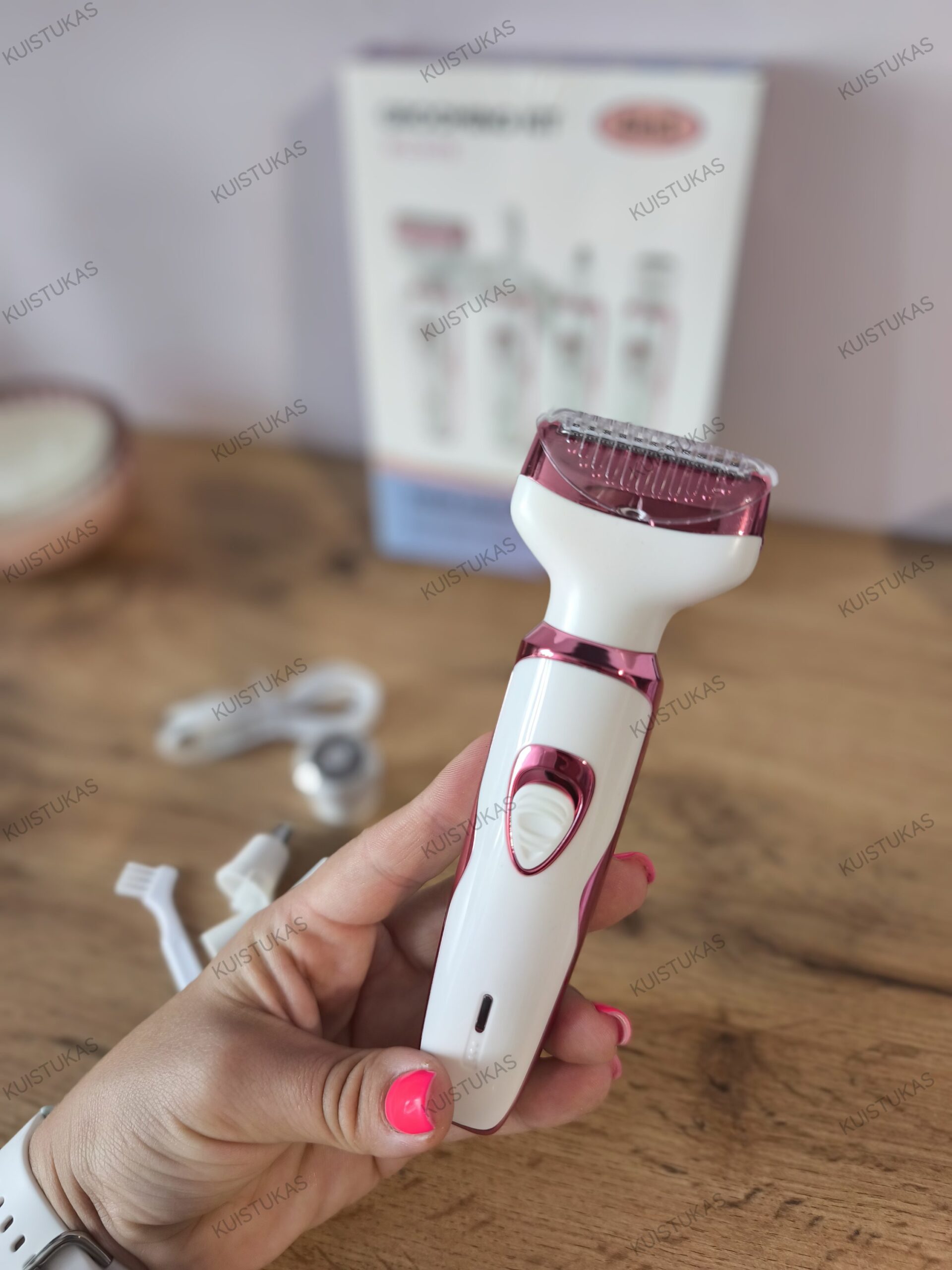 Keli keičiami antgaliai, pritaikyti skirtingoms zonoms (veidui, nosies sritims, bikini linijai ir kūnui);