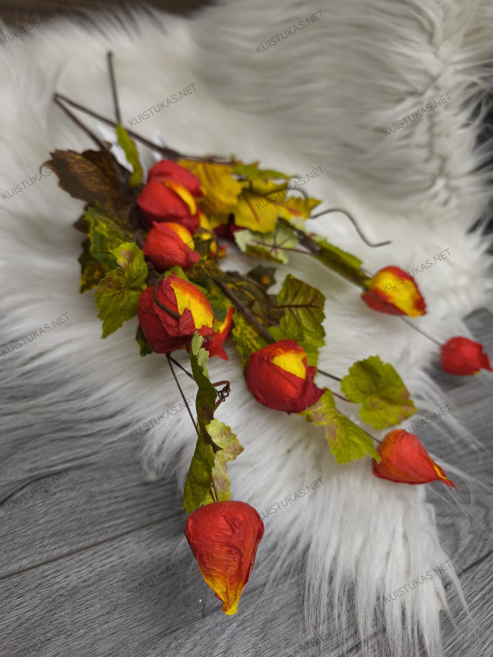 Ant ilgo stiebo išsidėstę ryškiai oranžiniai ir raudoni dumplūnės vaisiai, dar vadinami kiniškais žibintais, sukuria šiltą, jaukų ir šventišką įspūdį.