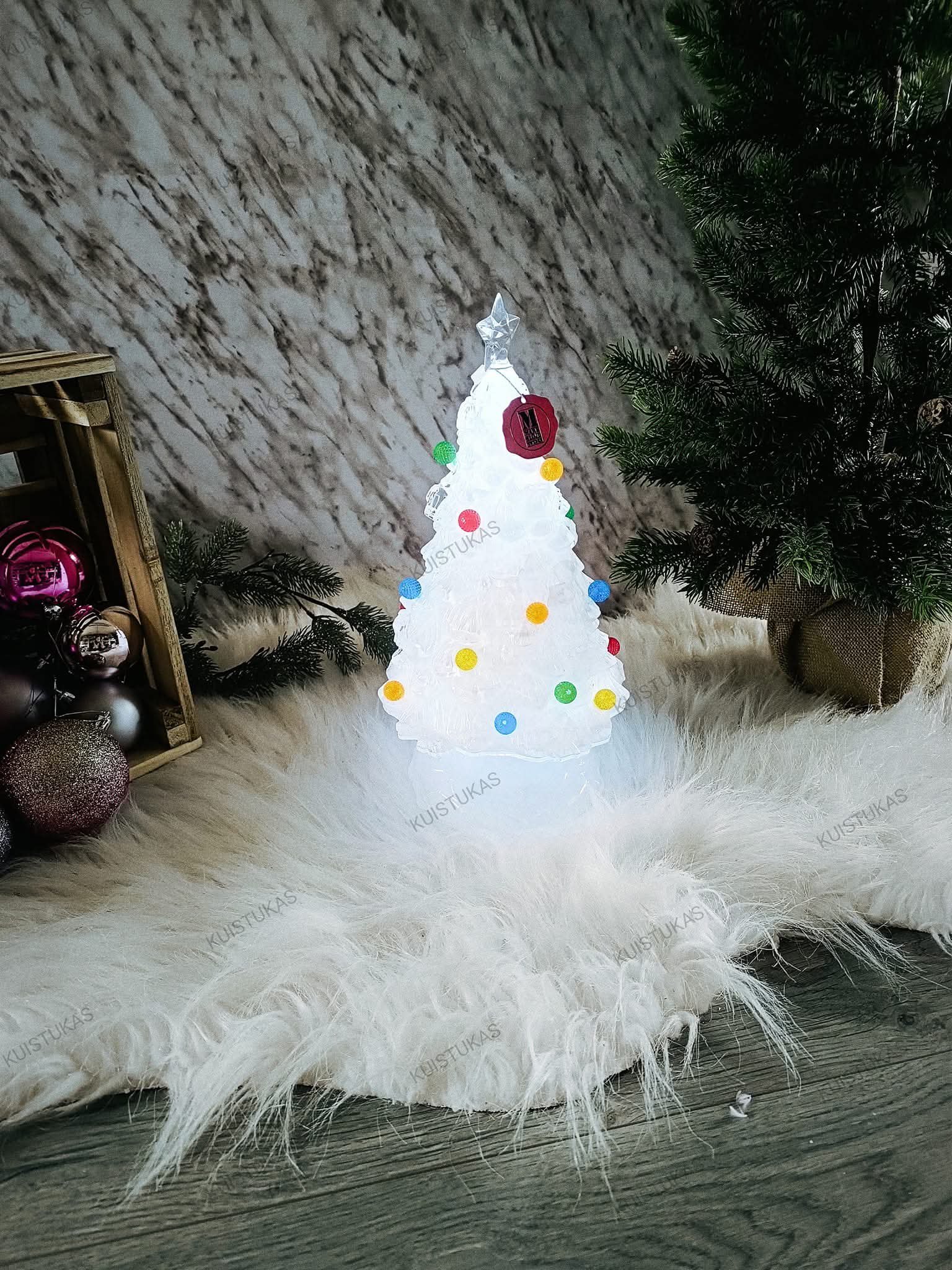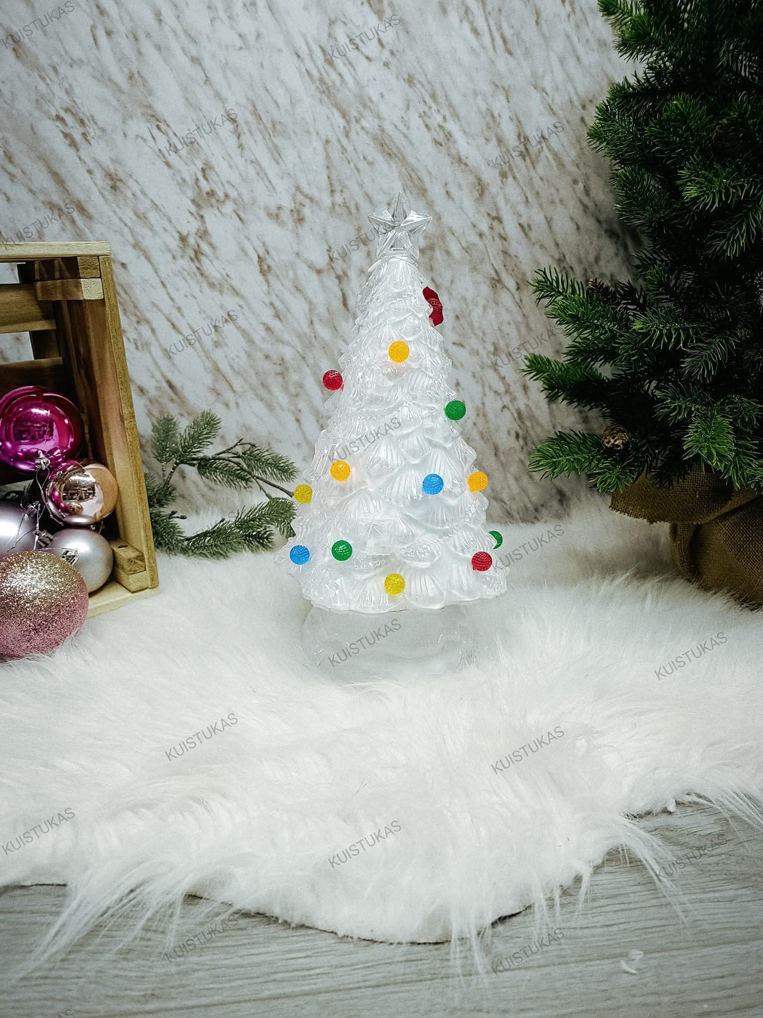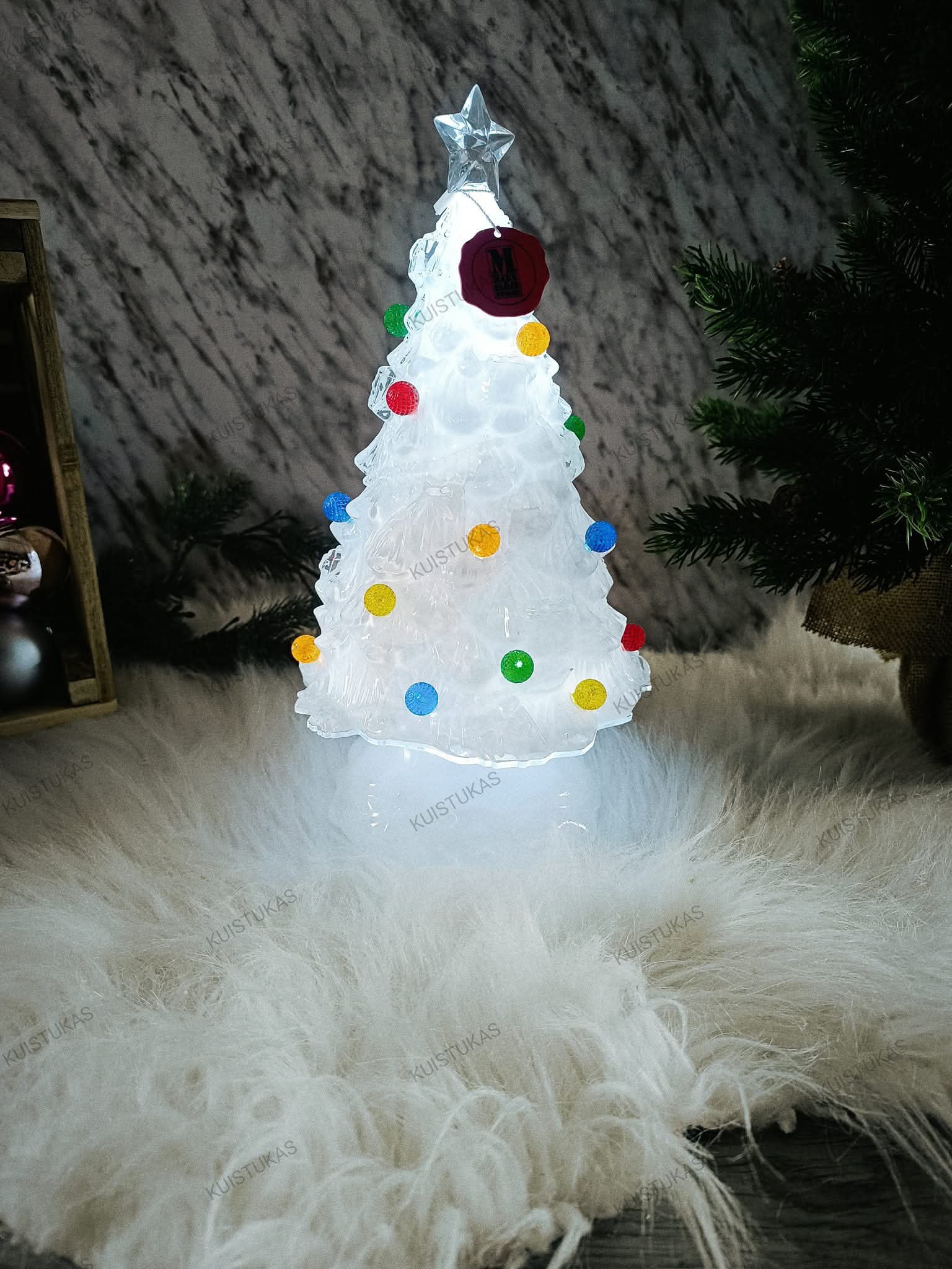 Ši eglutė pagaminta iš skaidraus akrilo, kuris leidžia šviesai sklisti tolygiai ir subtiliai.