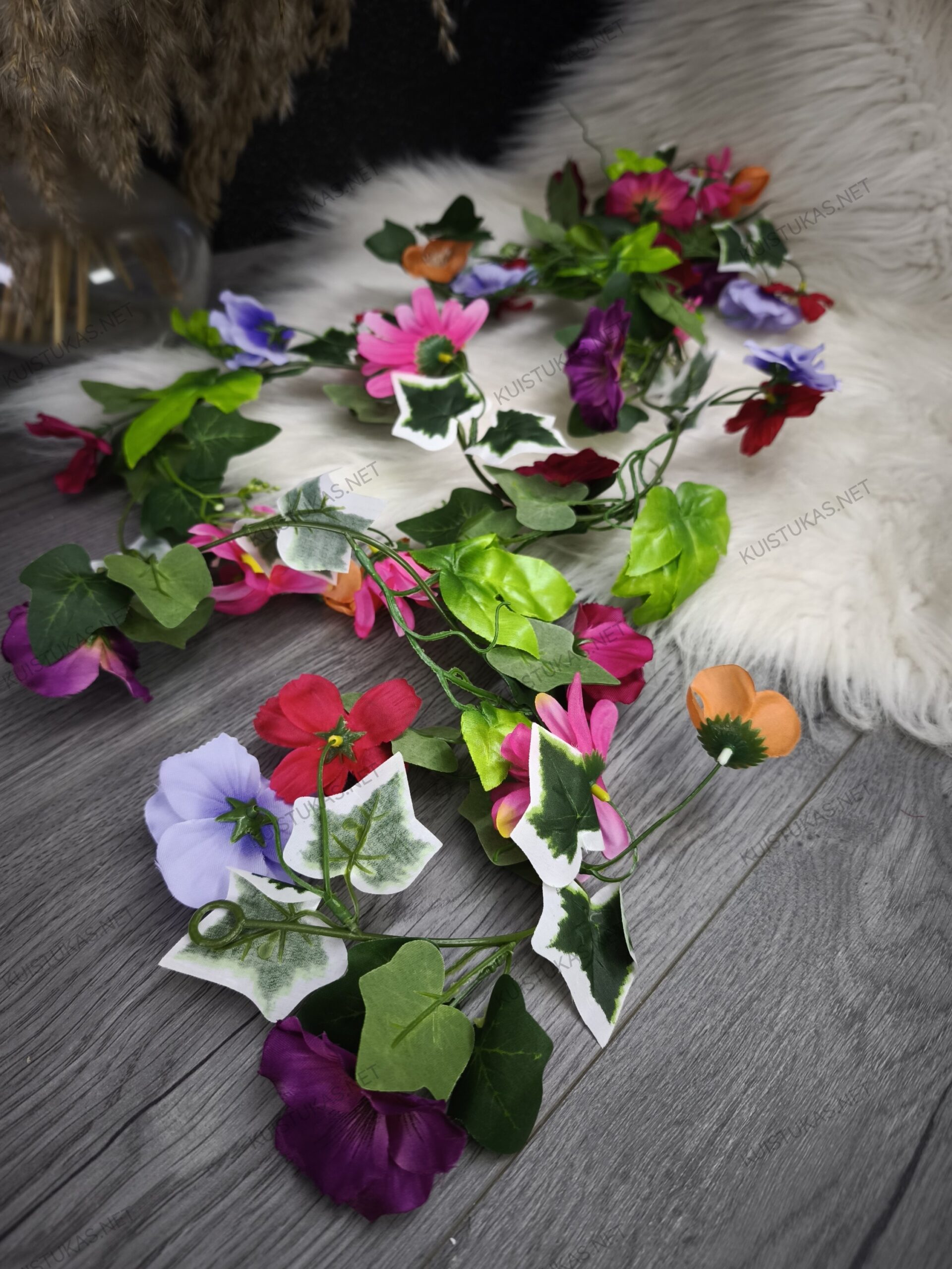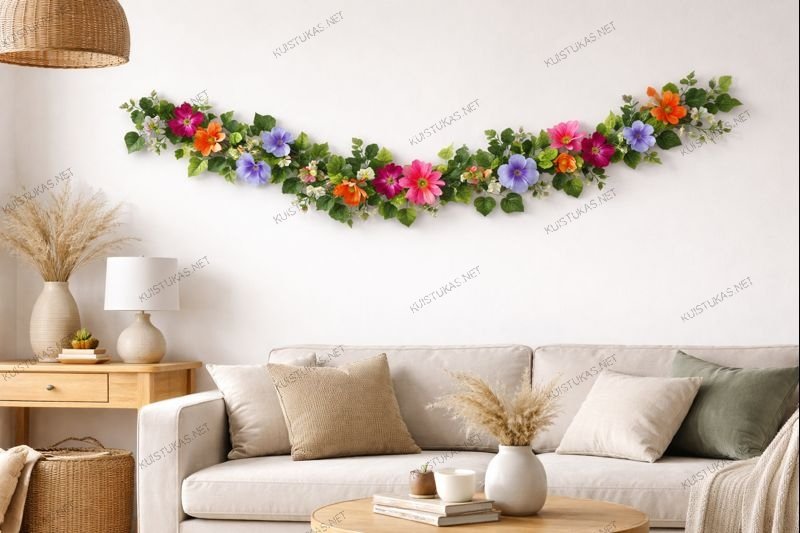 Dekoratyvinė gėlių girlianda – tai universalus ir stilingas sprendimas, norintiems savo aplinkai suteikti daugiau spalvų, jaukumo ir natūralaus žavesio.