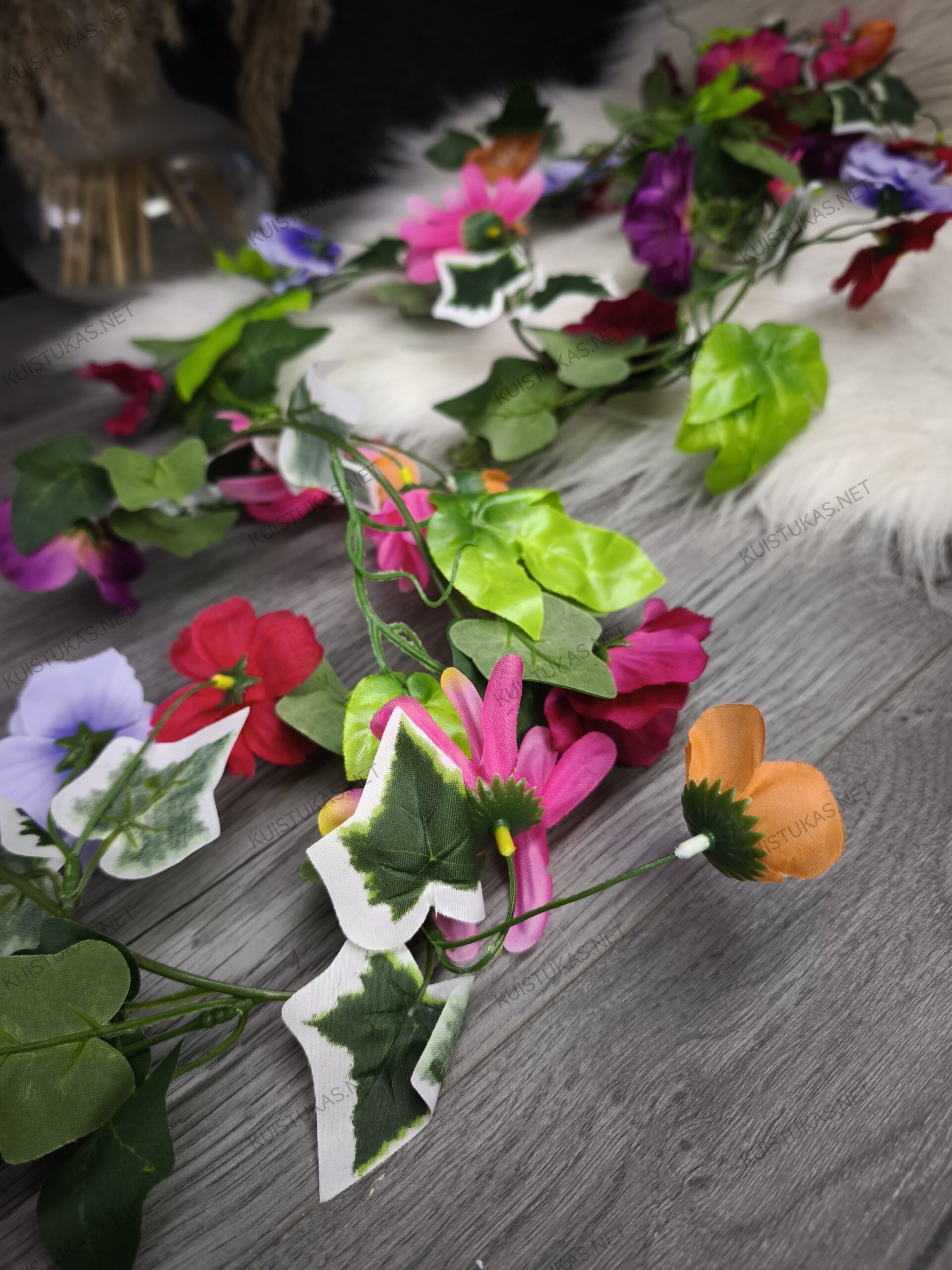 Ryškiaspalvės dirbtinės gėlės ir žali lapeliai atrodo gyvybingai bei estetiškai, todėl girlianda tampa puikia alternatyva natūraliems augalams.