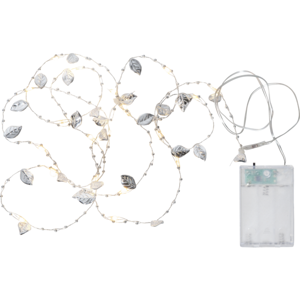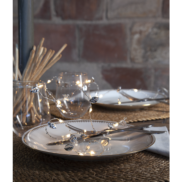 Jos šiltai balta šviesa ir sidabro spalvos lapelių dekoracijos suteikia šventinį spindesį, o plona vielutė leidžia girliandą lengvai pritaikyti bet kokiai erdvei.