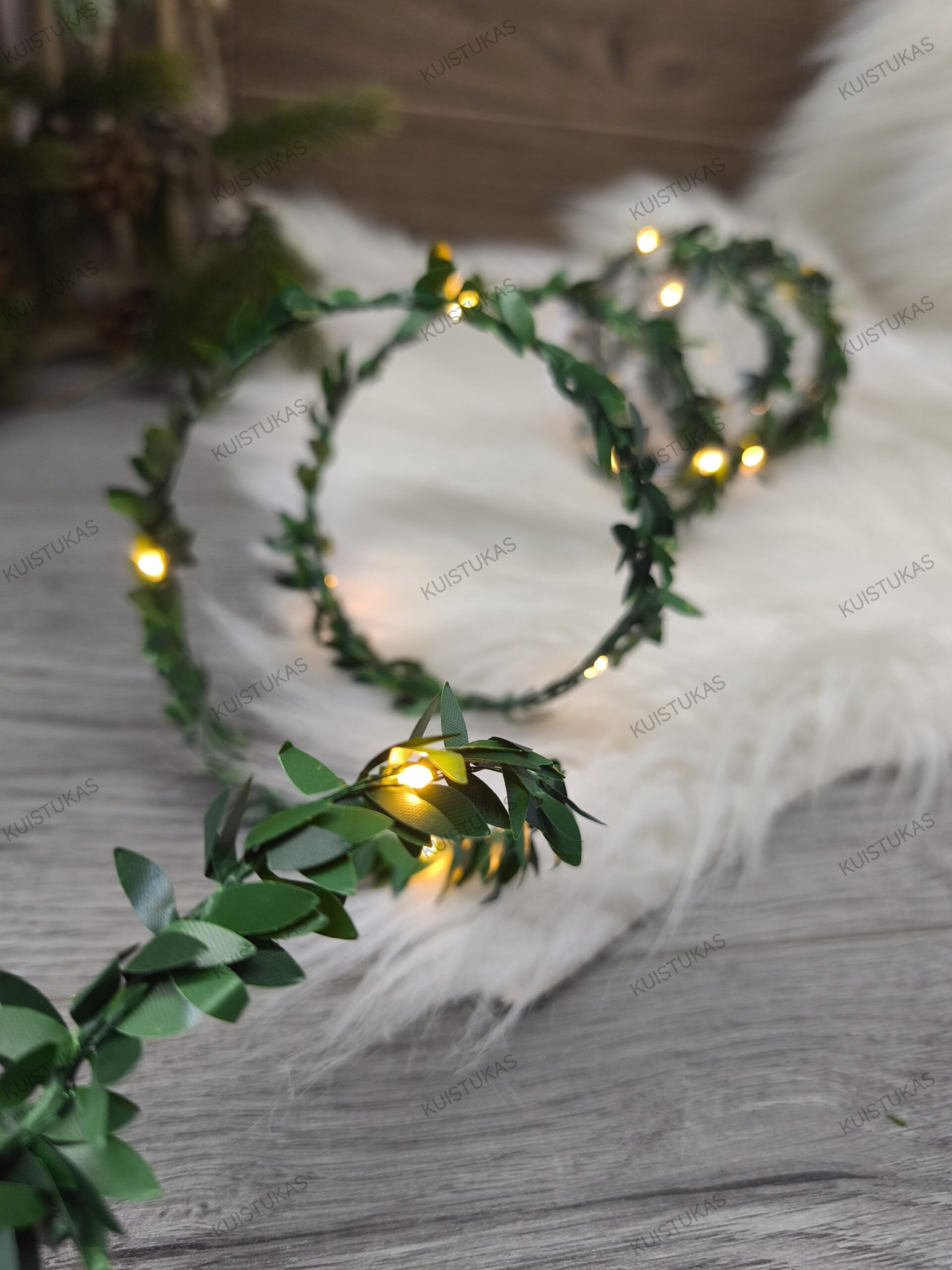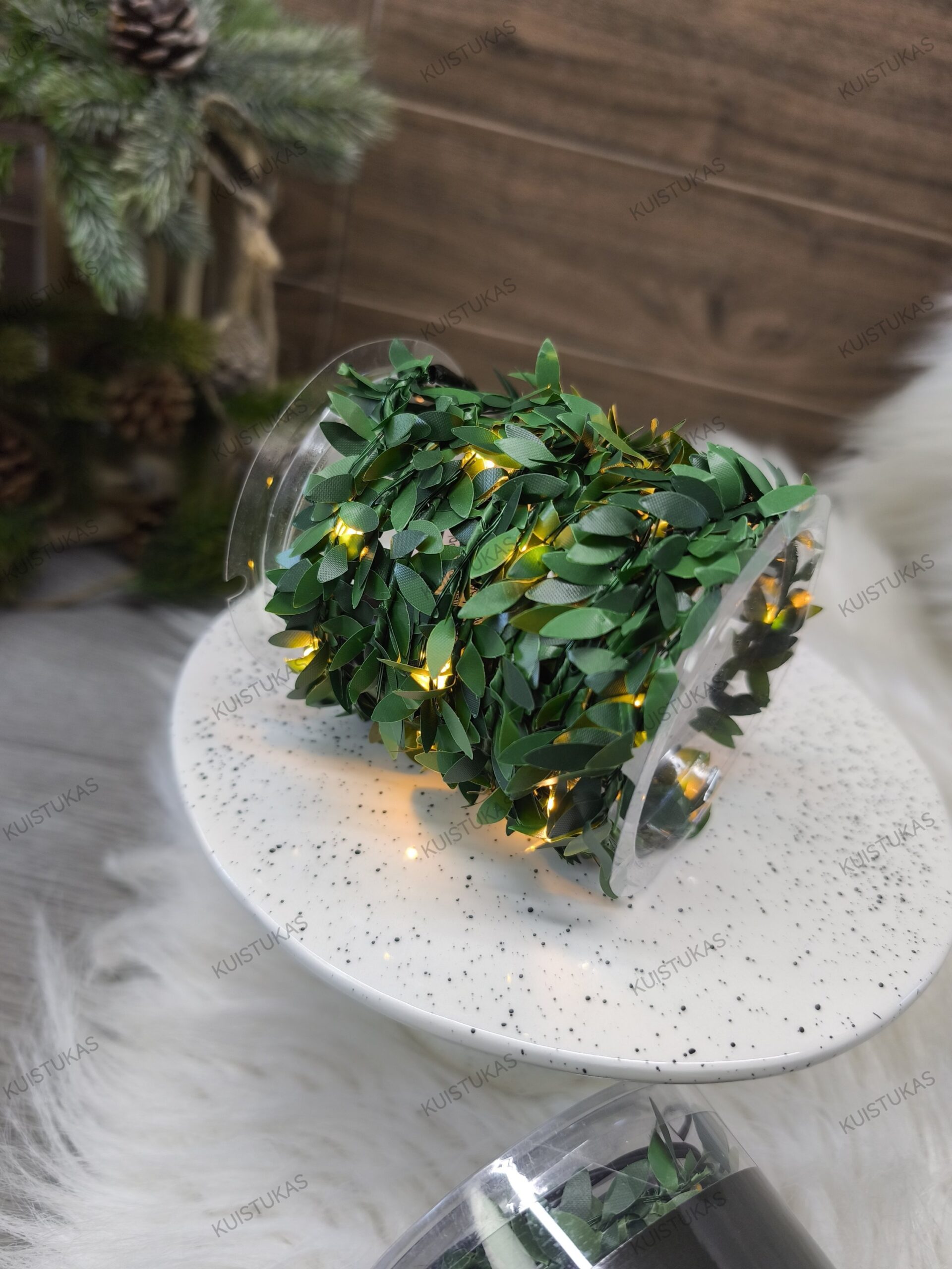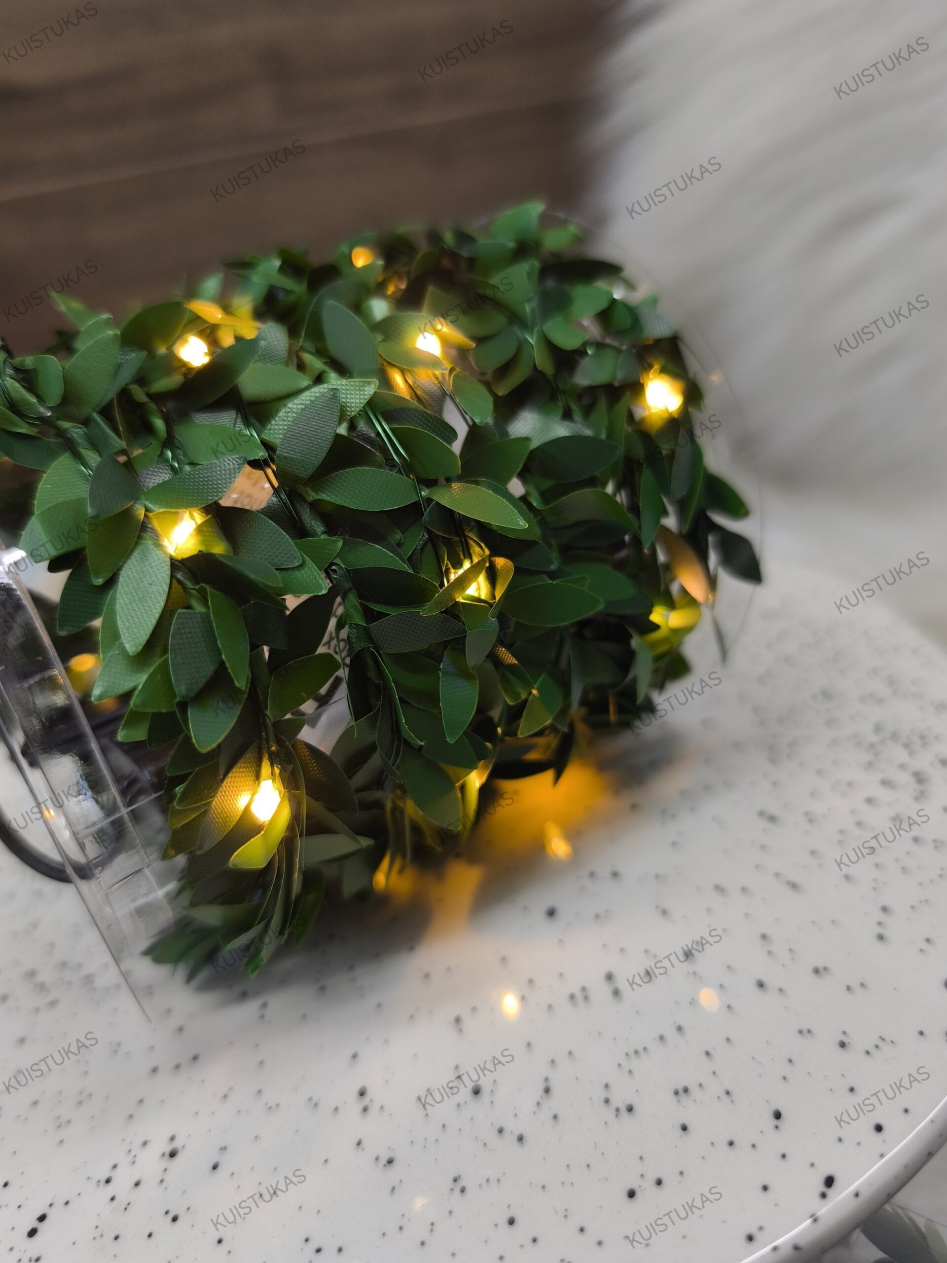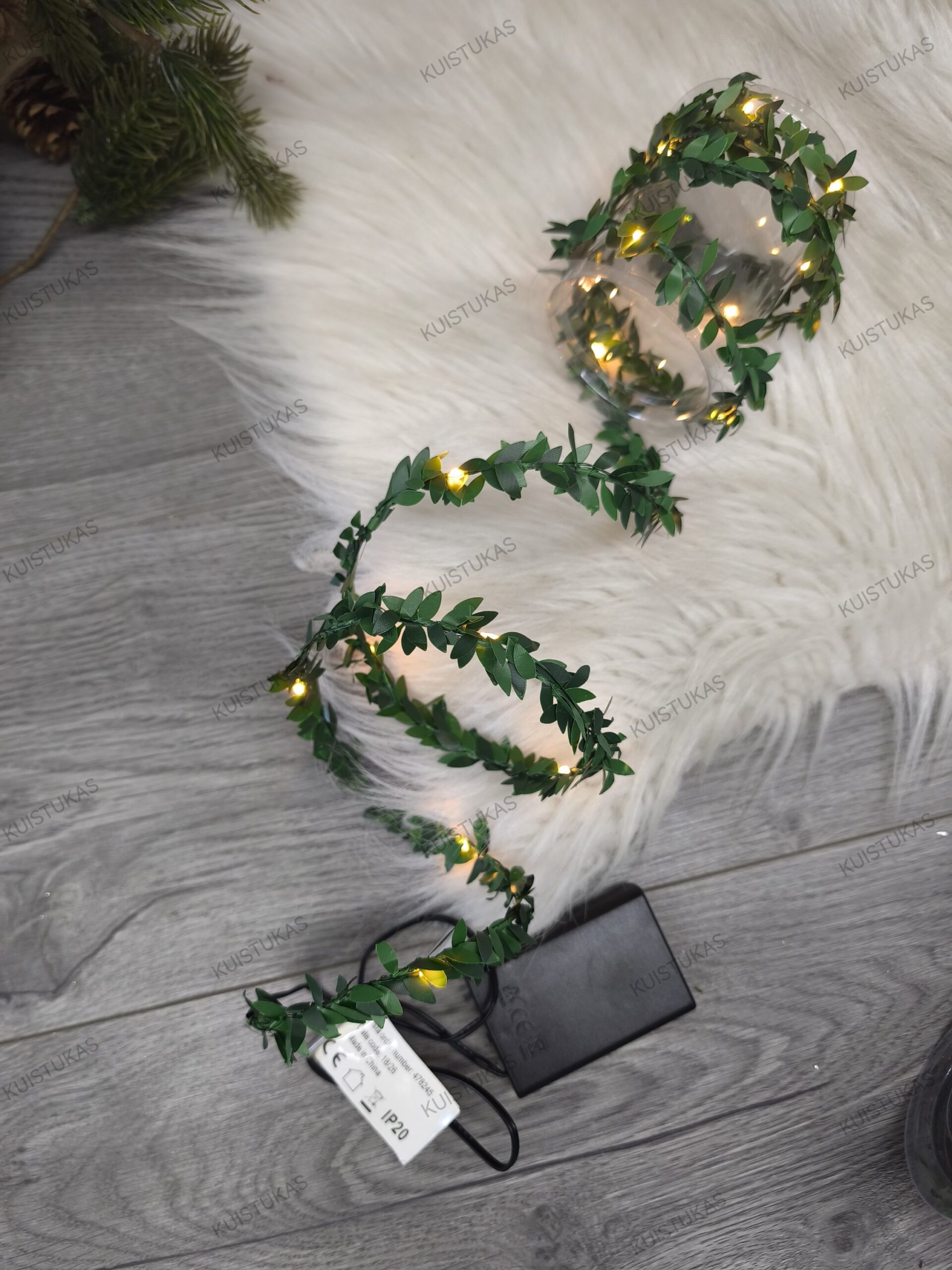 Žalumynų dekoras suteikia natūralumo įspūdį, o kartu su šiltai balta šviesa sukuria šventinį ir jaukų namų įvaizdį.