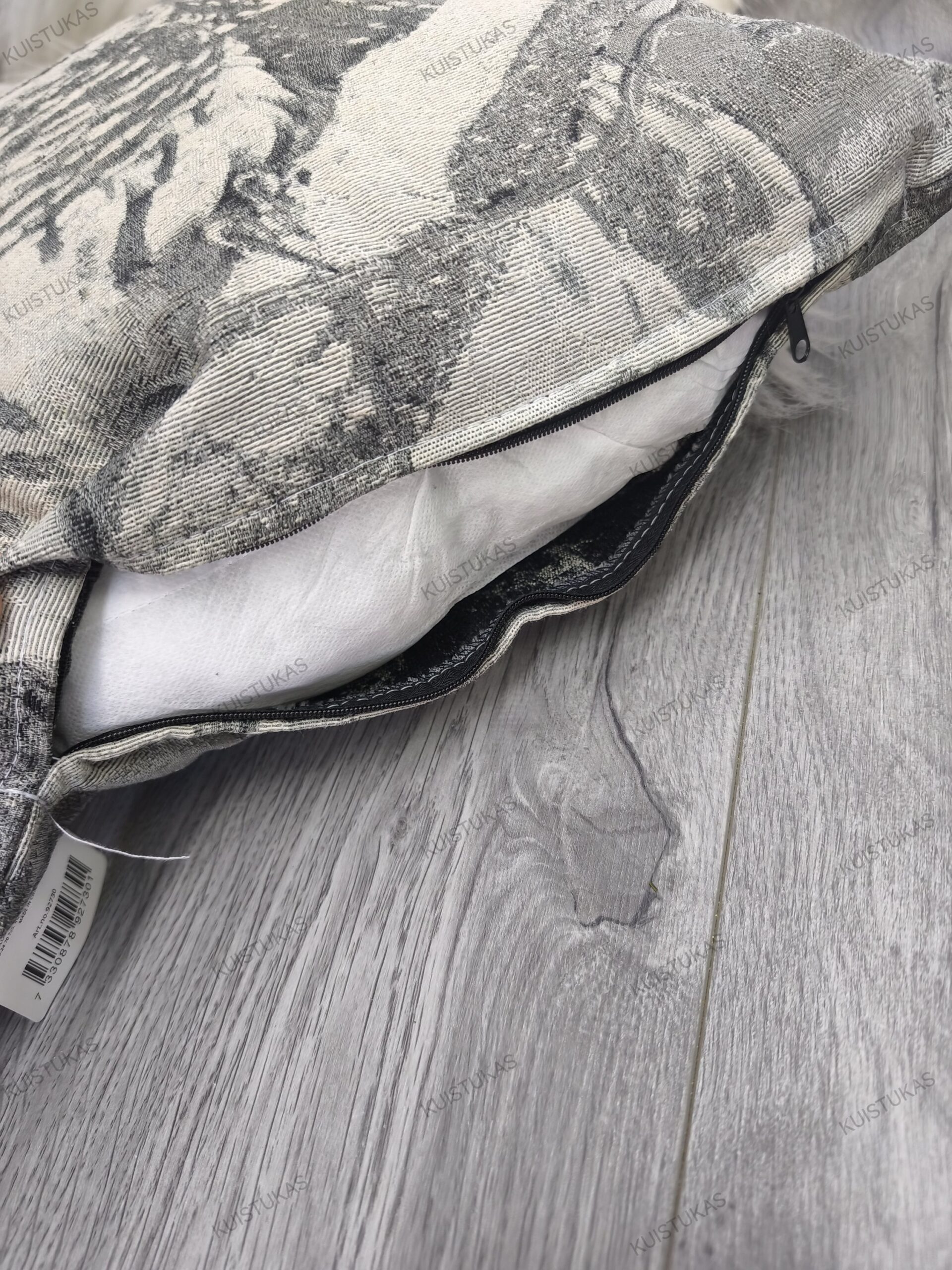Subtilus pilkų tonų derinys leidžia pagalvei lengvai įsilieti į bet kokią spalvinę gamą, o išskirtinis raštas pritraukia dėmesį ir tampa puikia interjero detale.