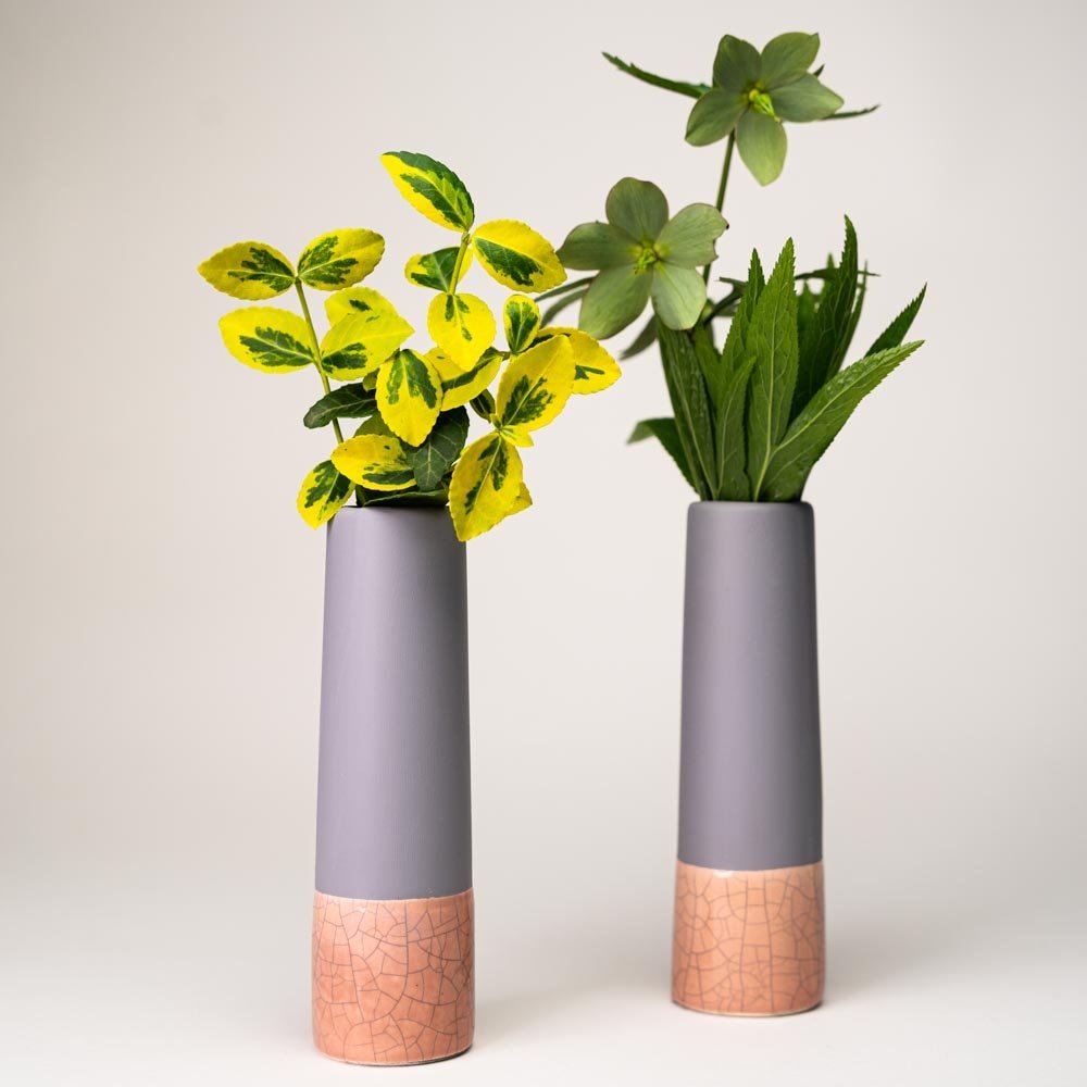 Šios dekoratyvinės keraminės vazelės išsiskiria elegantišku spalvų deriniu, kur matinė pilka viršutinė dalis harmoningai susilieja su blizgia marmuro imitacijos juostele persikinio atspalvio apačioje.