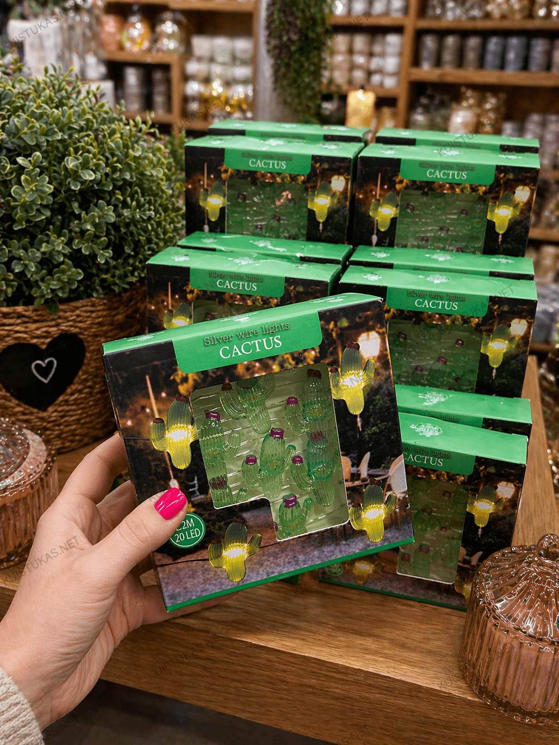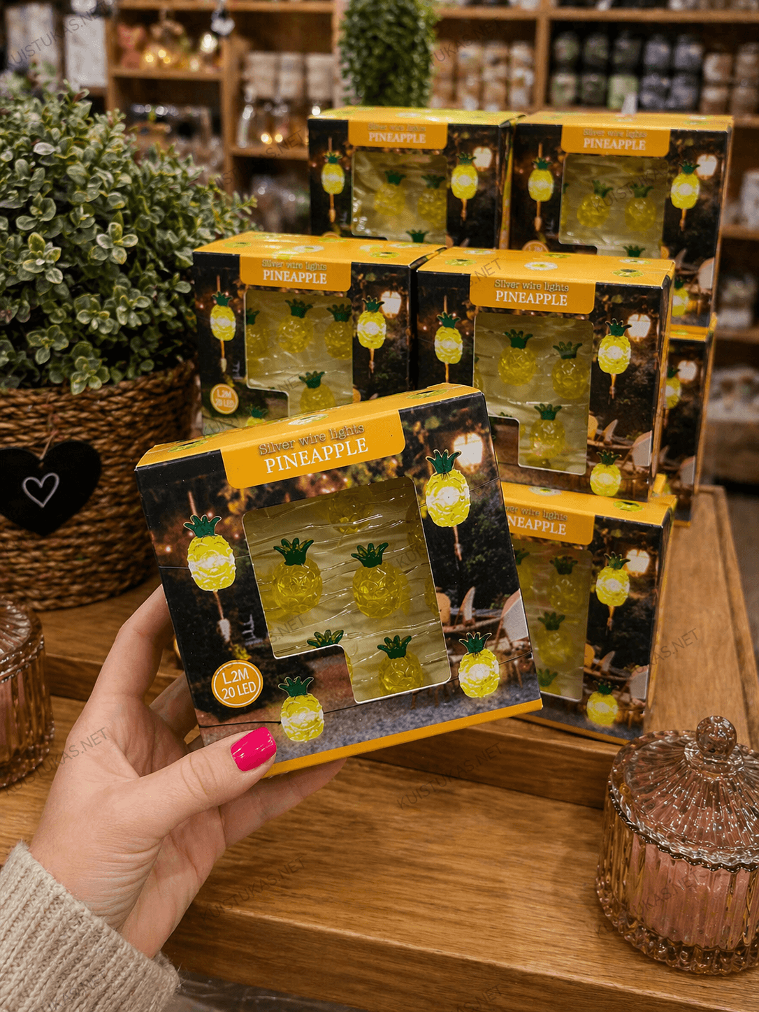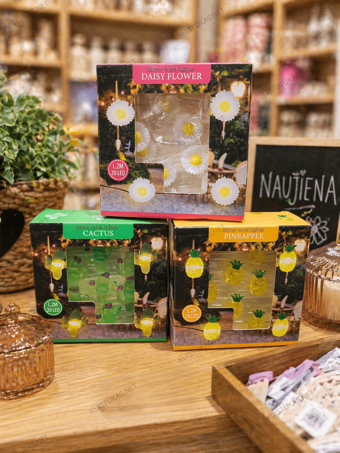 Galite rinktis iš trijų žaismingų dizainų: kaktuso, ananaso arba ramunių formos lempučių.