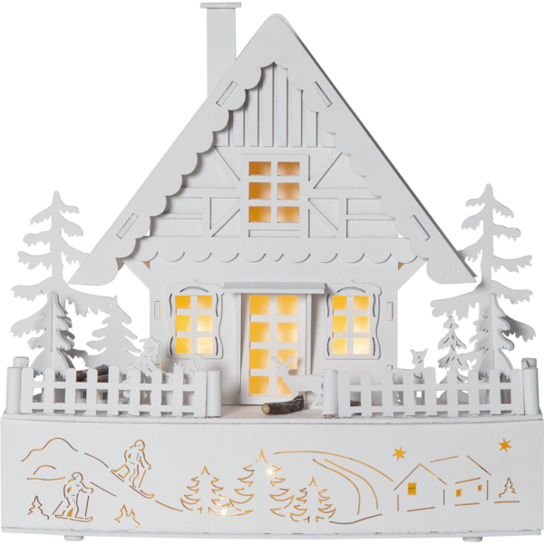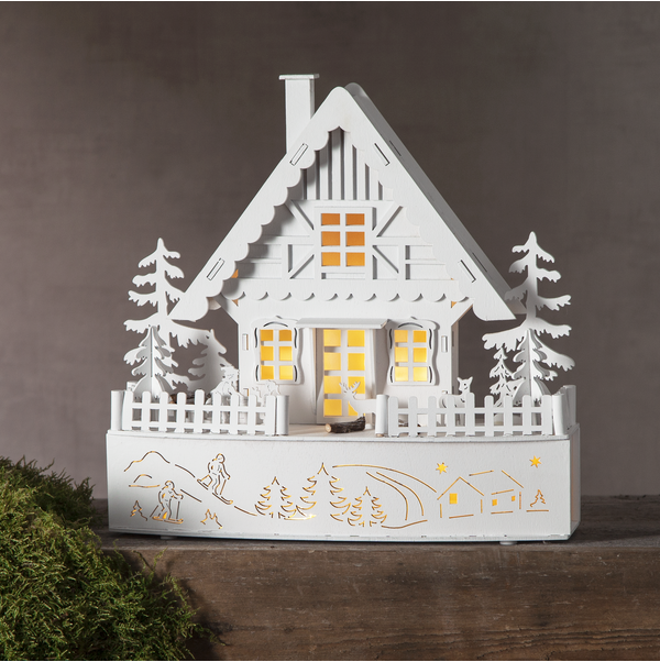 Sukurtas pjaustytu medžiu, šis dekoratyvinis namelis turi išilgai išraižytas detales, kurios atspindi ne tik žiemišką peizažą, bet ir mažas kasdienybės akimirkas, primenančias šventinę nuotaiką.