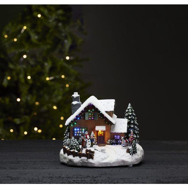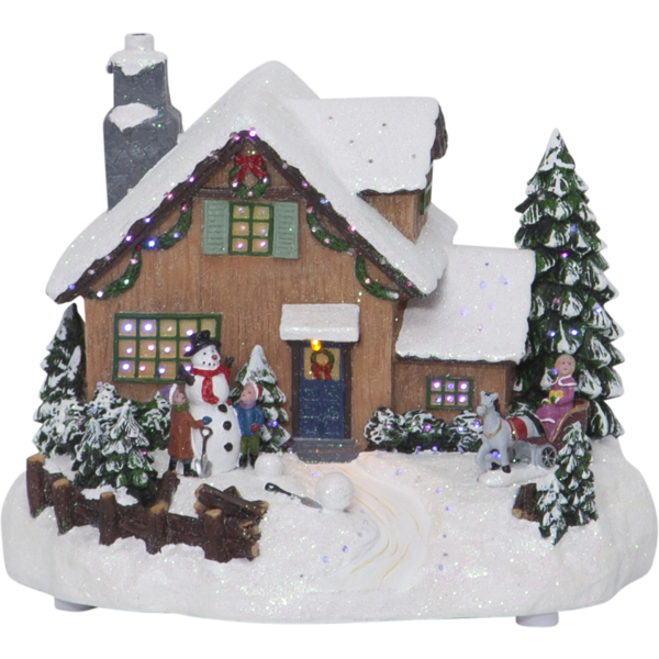 Namelis dekoruotas detaliomis žiemos scenomis: apsnigtu stogu, kalėdinėmis eglėmis, sniego seniu ir smagiai leidžiančiais laiką personažais.