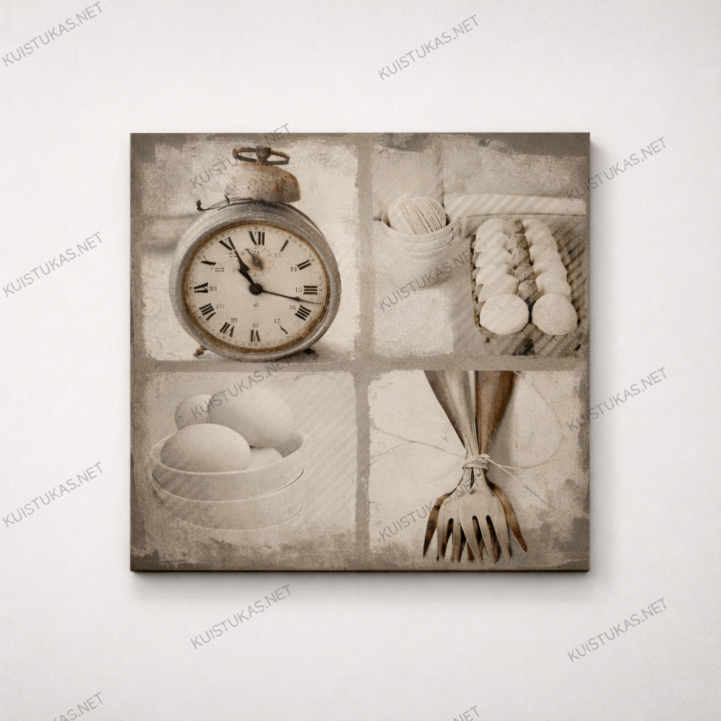 Paveikslas padalintas į keturias atskiras dalis, kurioje pavaizduoti virtuvės elementai, tokie kaip klasikinis žadintuvas, kiaušiniai ir virtuvės reikmenys.