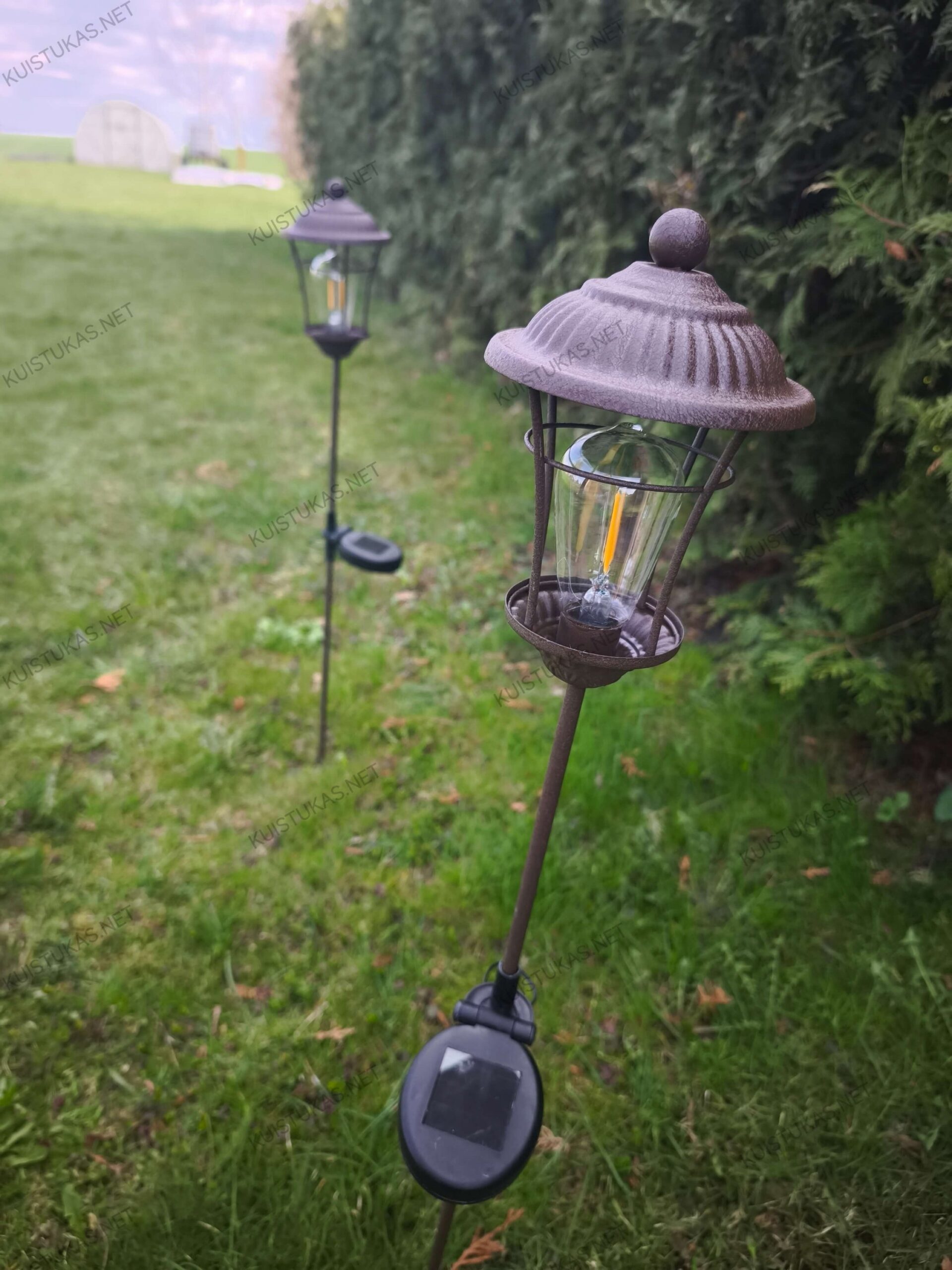 Klasikinio žibinto stiliaus saulės šviestuvas – jauki šviesa ir elegancija jūsų sodui be jokių laidų.