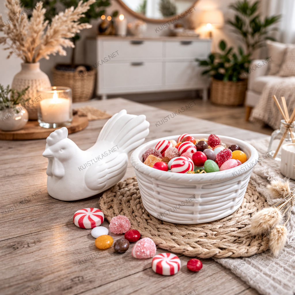 Unikalus dizainas su subtilia vištos figūra paverčia šį indą ne tik praktišku, bet ir dekoratyviniu akcentu, puikiai tinka įvairioms progoms, ypač Velykų laikotarpiu.