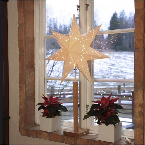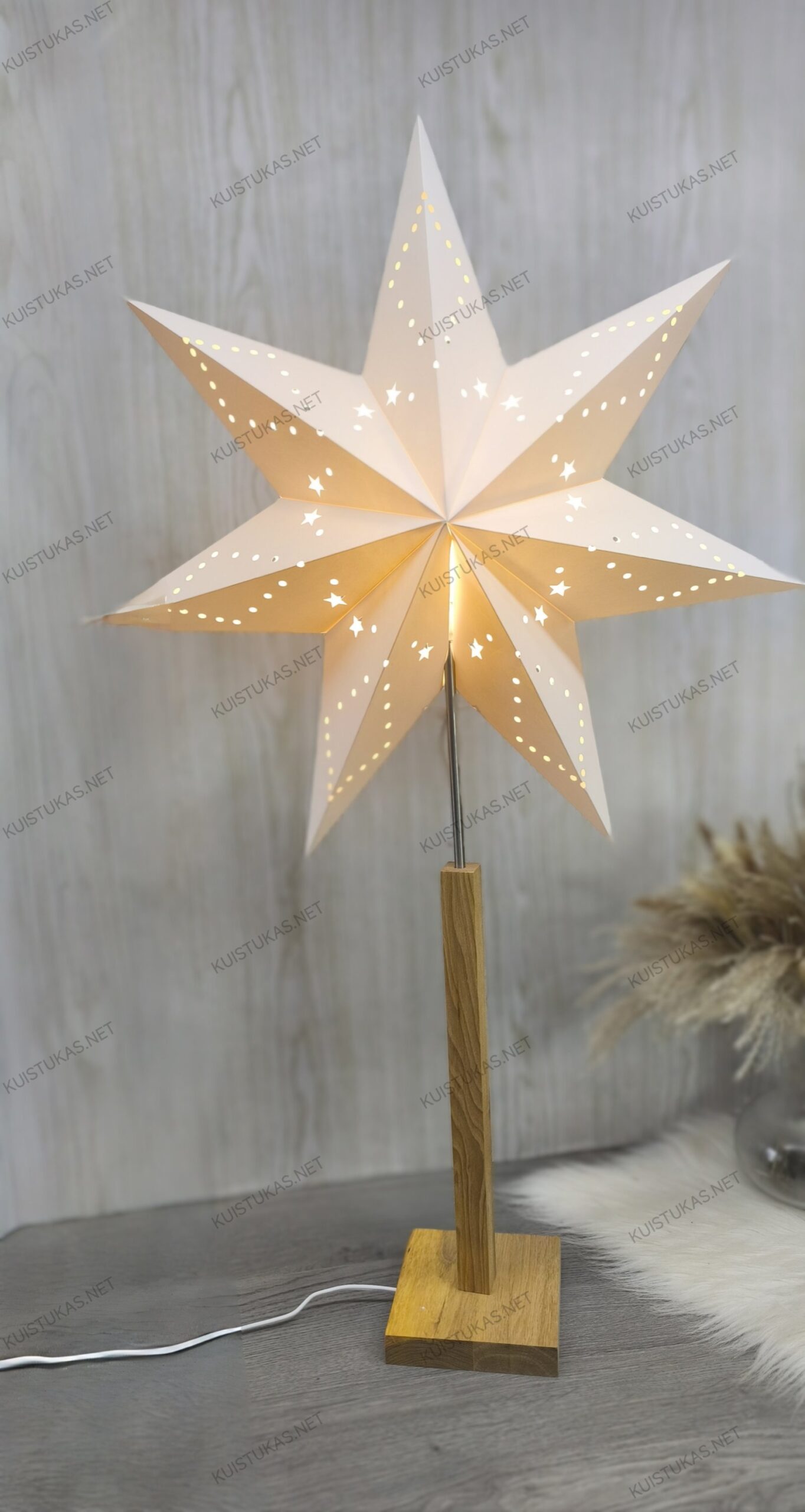 Šviestuvas išsiskiria mediniu pagrindu ir popierine žvaigžde, kuri švelniai skleidžia šviesą pro subtilias iškarpas, sukurdamas malonų, šiltą apšvietimą.