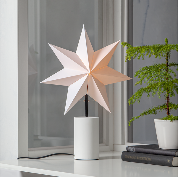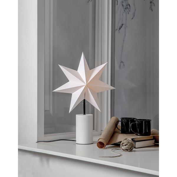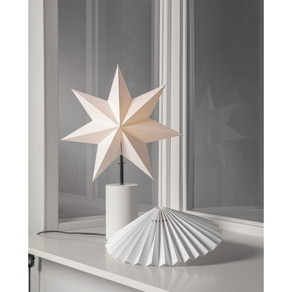 Žvaigždė ant kojelės, balta popierinė žvaigždė + klostuotas gaubtas.