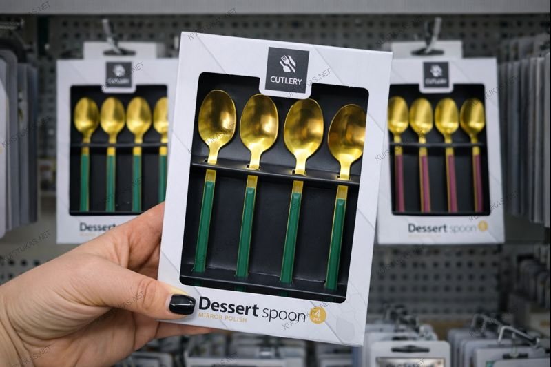 Šis rinkinys išsiskiria elegantišku veidrodiniu paviršiumi, auksinės spalvos šaukštelių galvutėmis bei išraiškingomis rankenomis, kurios gali būti žalios, juodos arba bordo spalvos.