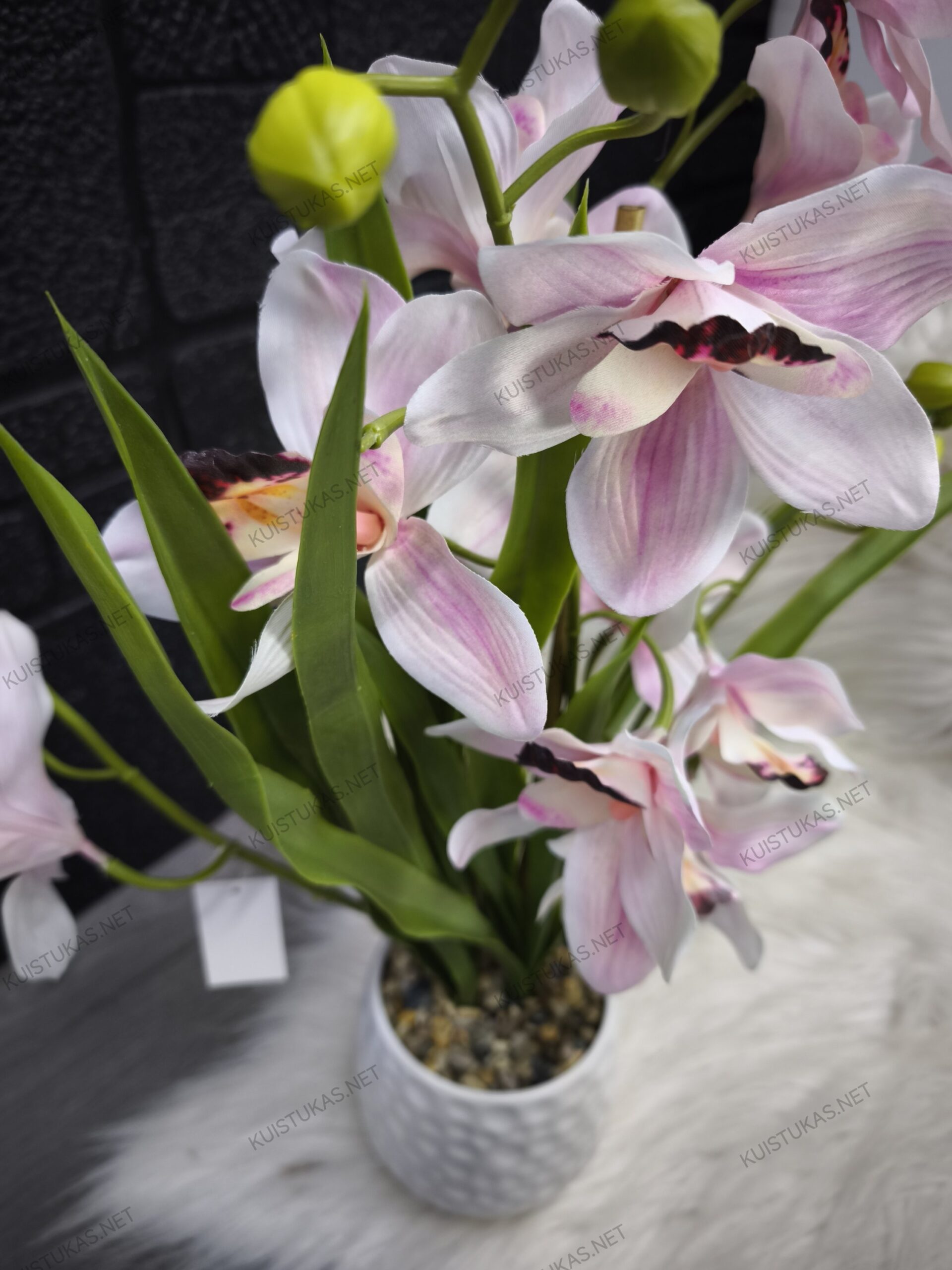 Realistiškos žiedų formos, subtilūs spalvų perėjimai ir žali lapai sukuria įspūdį, kad tai gyva, ką tik pražydusi orchidėja.