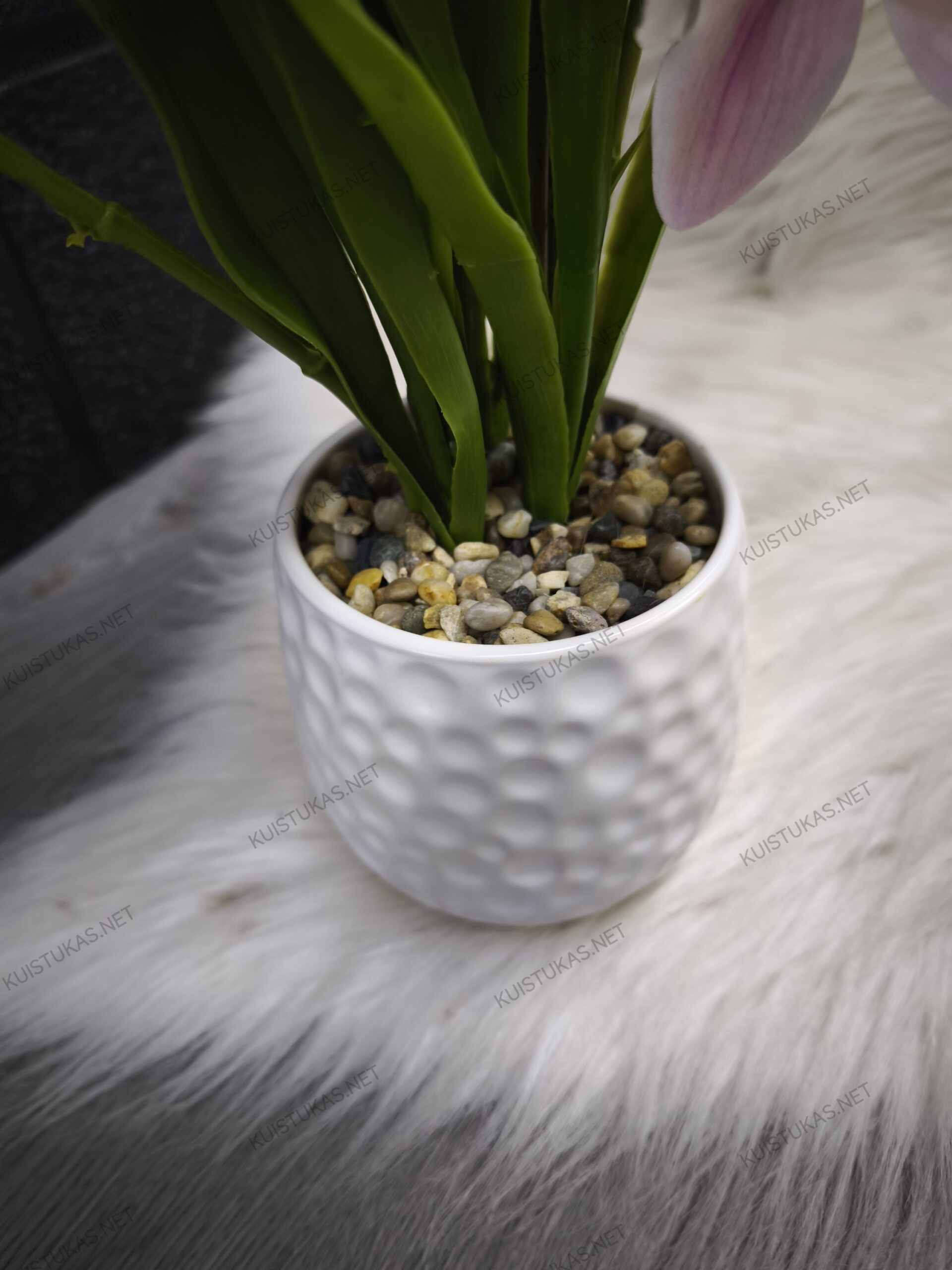 Gėlė parduodama kartu su dekoratyviniu keraminiu vazonu, kuris papildytas mini akmenėliais.