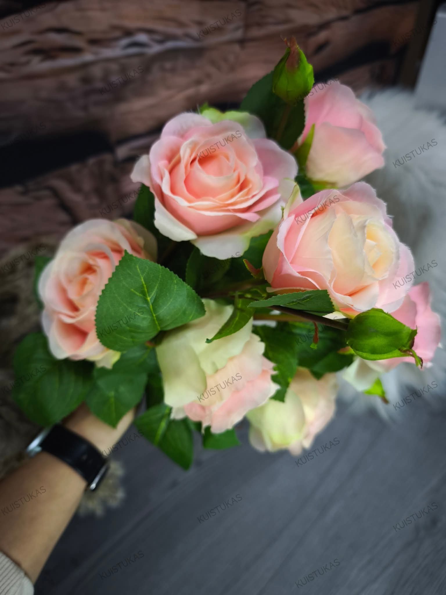 Švelniai rausvi ir kreminiai žiedlapiai sukuria harmoningą spalvų derinį, puikiai tinka tiek klasikiniam, tiek moderniam interjerui.