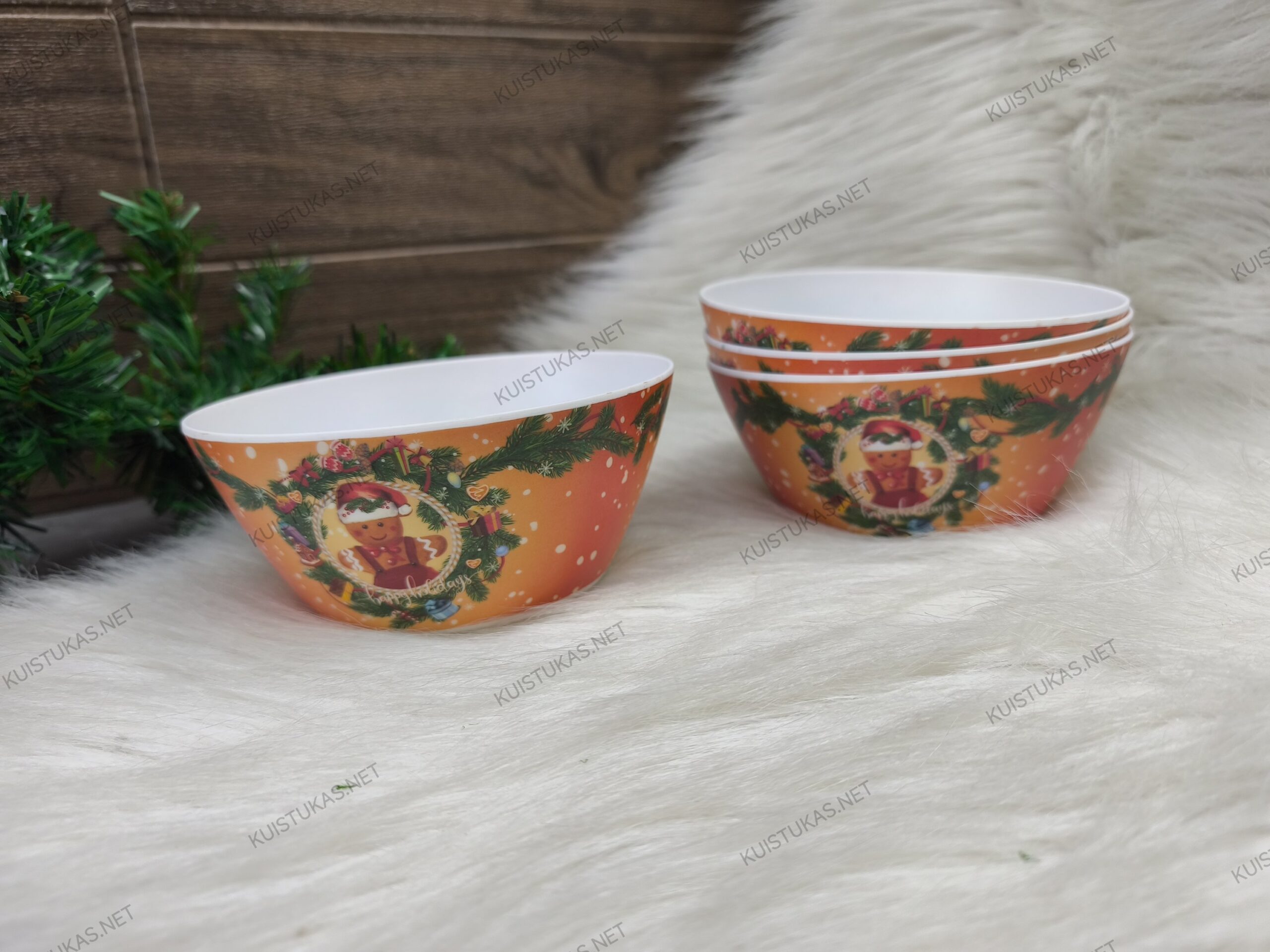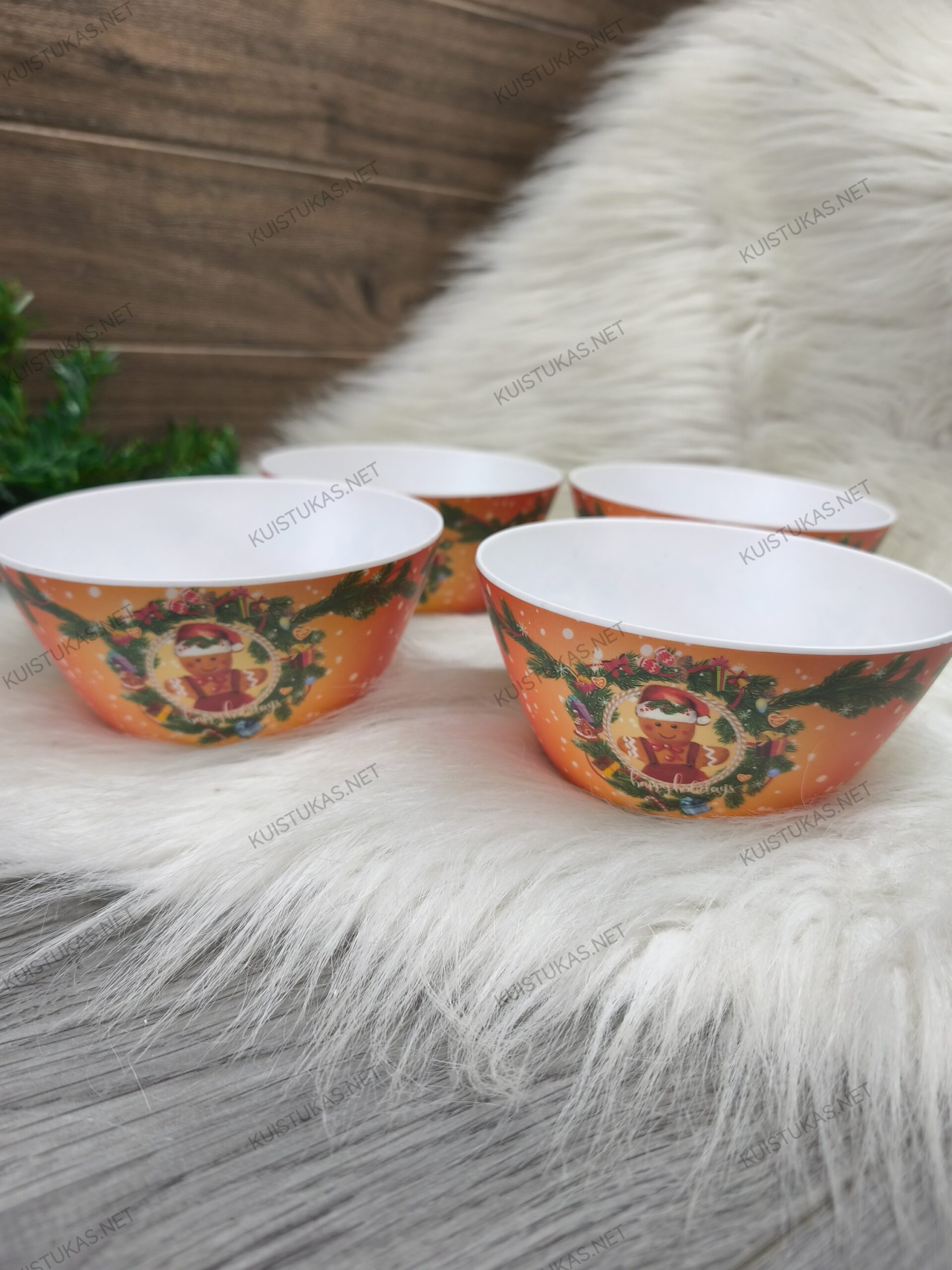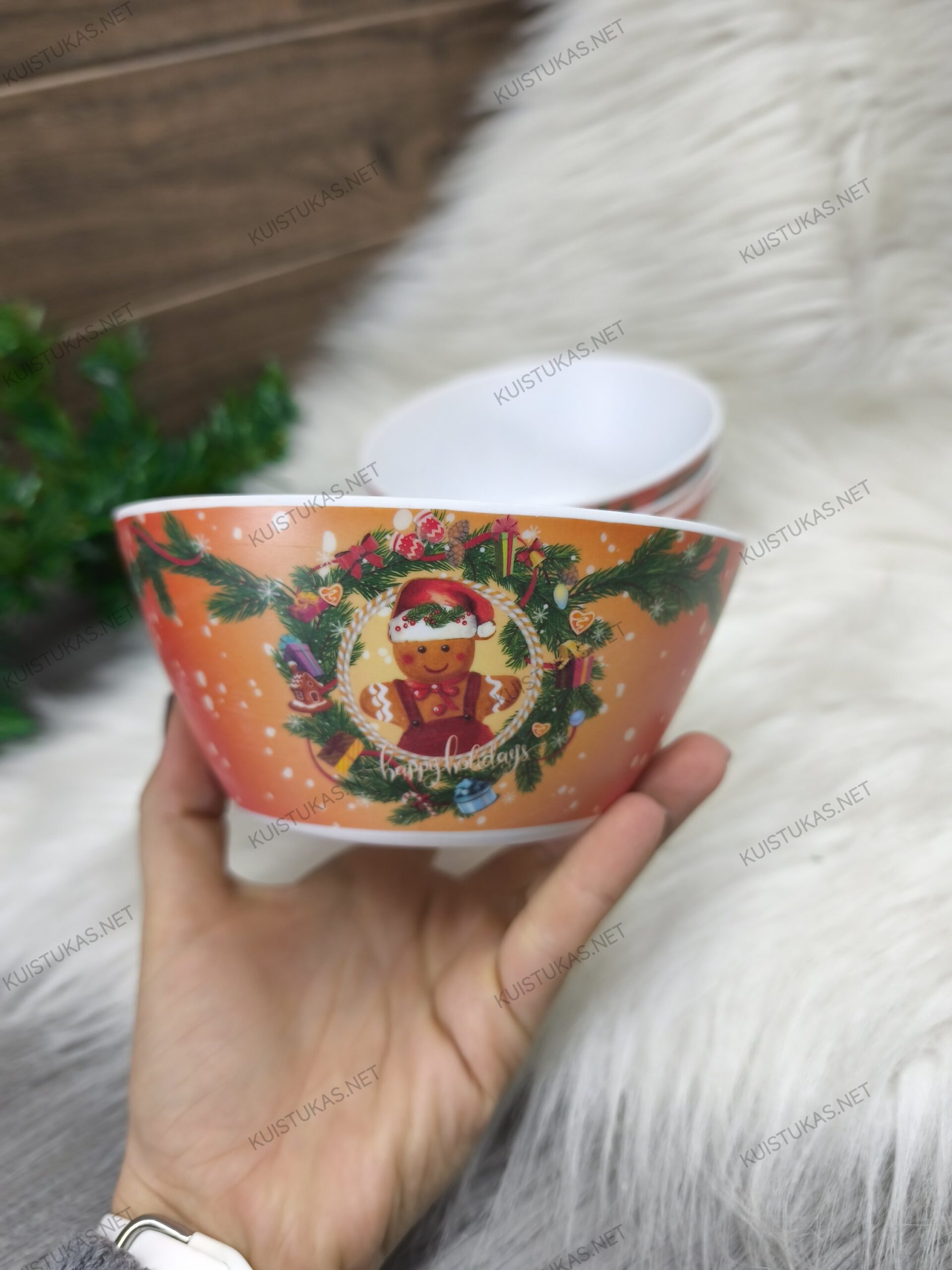 Šie dubenėliai dekoruoti šventiniu imbierinių sausainių ir Kalėdų senelio motyvu, o šiltos oranžinės spalvos fonas sukuria jaukią ir džiaugsmingą atmosferą.