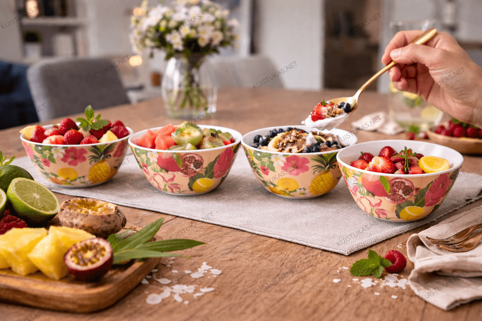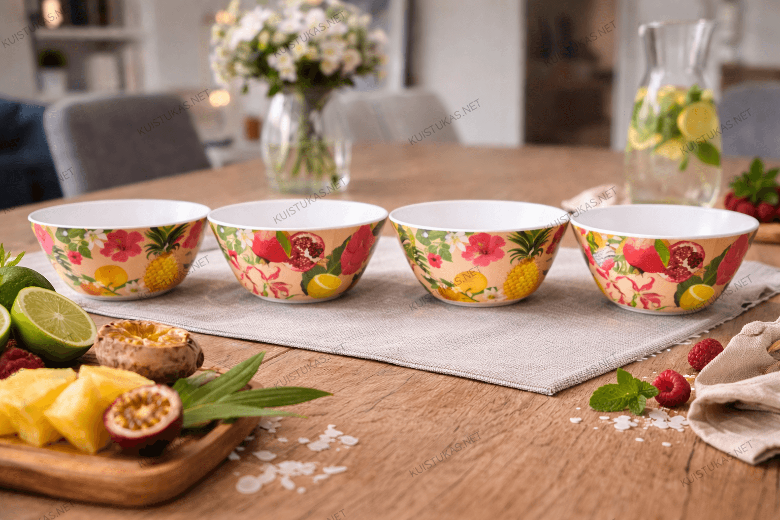 Dubenėliai dekoruoti tropinių vaisių motyvu – čia atsiskleidžia citrinos, kiviai, granatai, drakonvaisiai ir apelsinai.