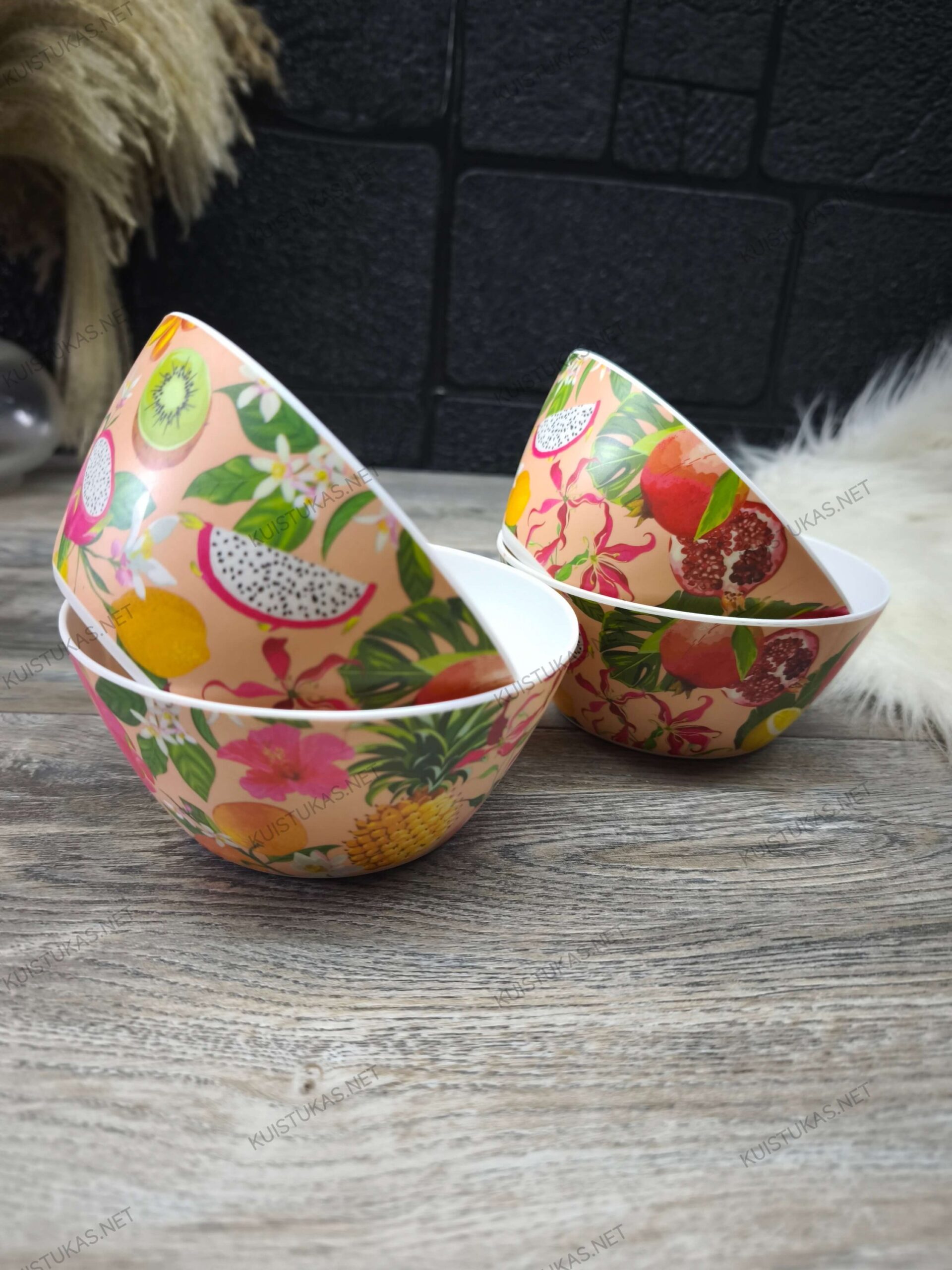 Dubenėliai dekoruoti tropinių vaisių motyvu (Citrina, kivis, granatas, drakonvaisiai, apelsinai).
