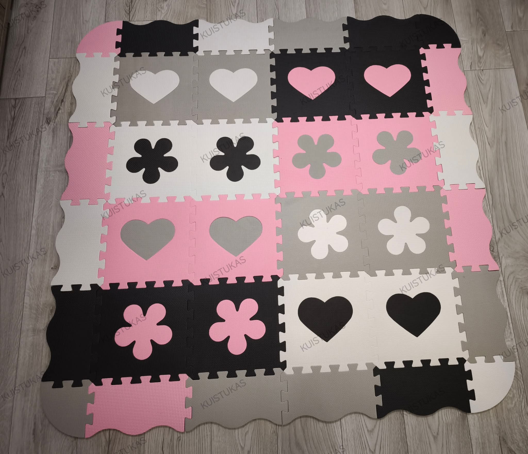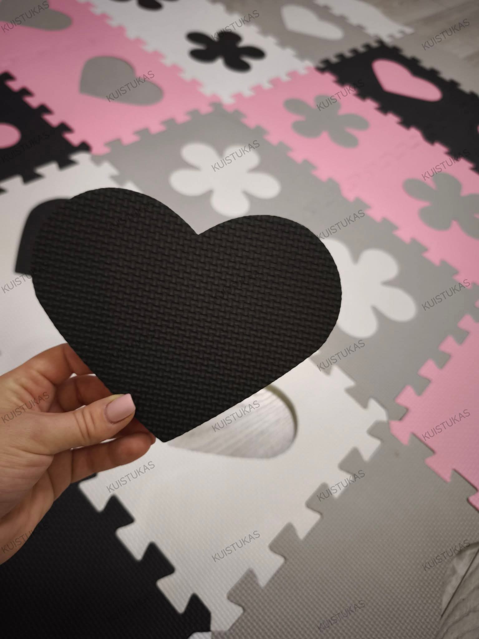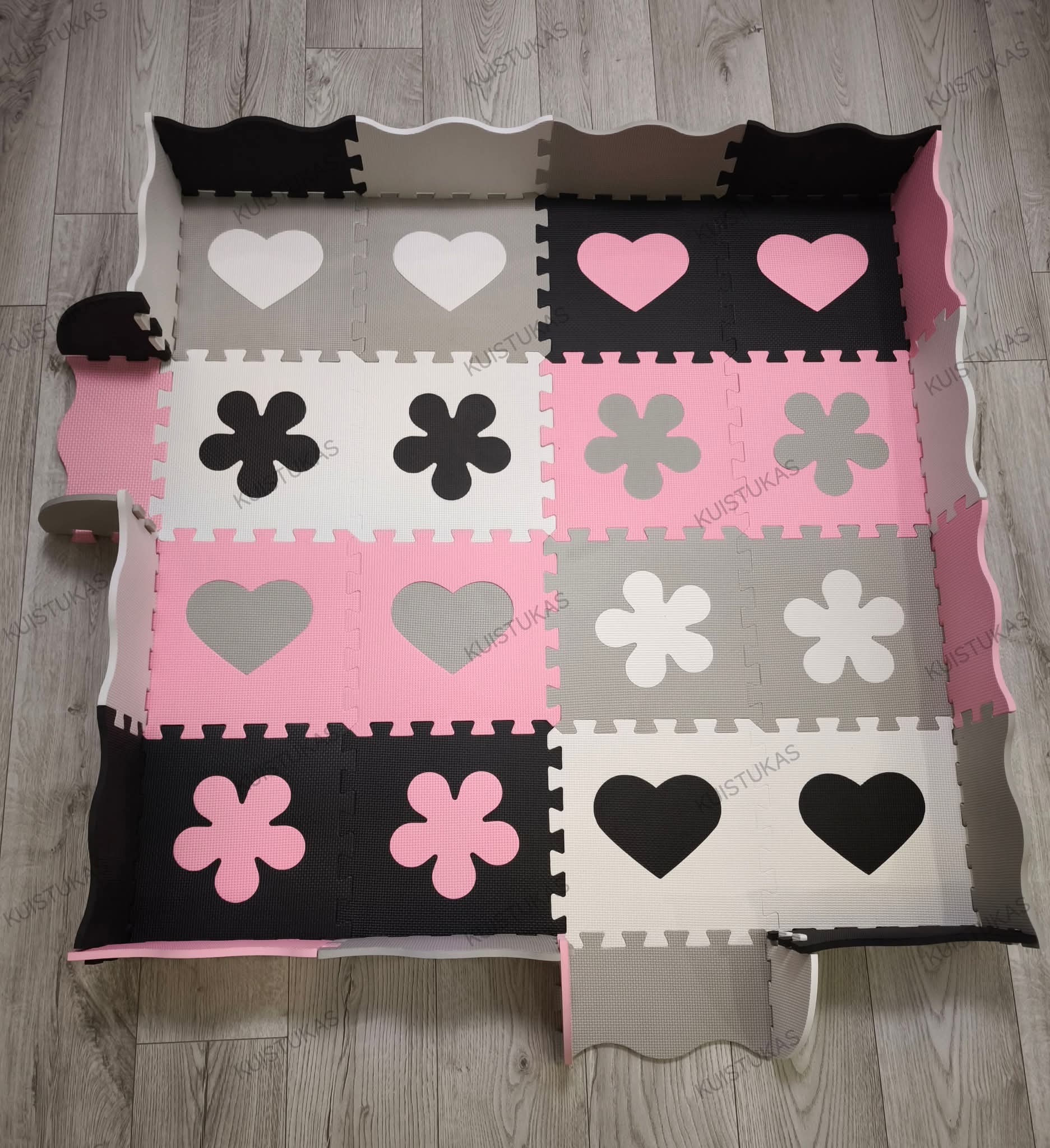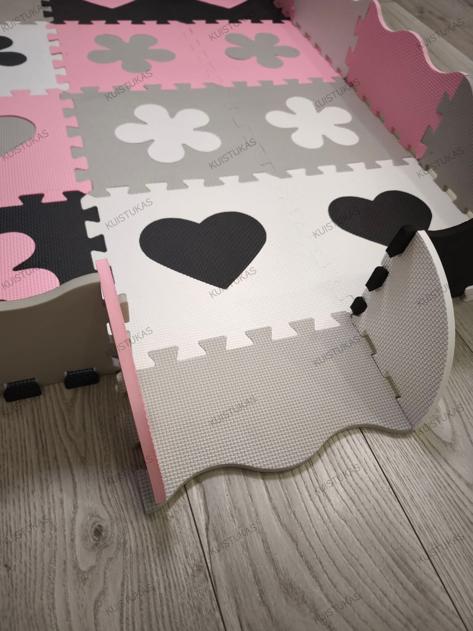 Galimybė pasidaryti maniežą, neslidus pagrindas, atsparus vandeniui, izoliuoja vaiką nuo šaltų grindų, 3D pastatymo galimybė.
