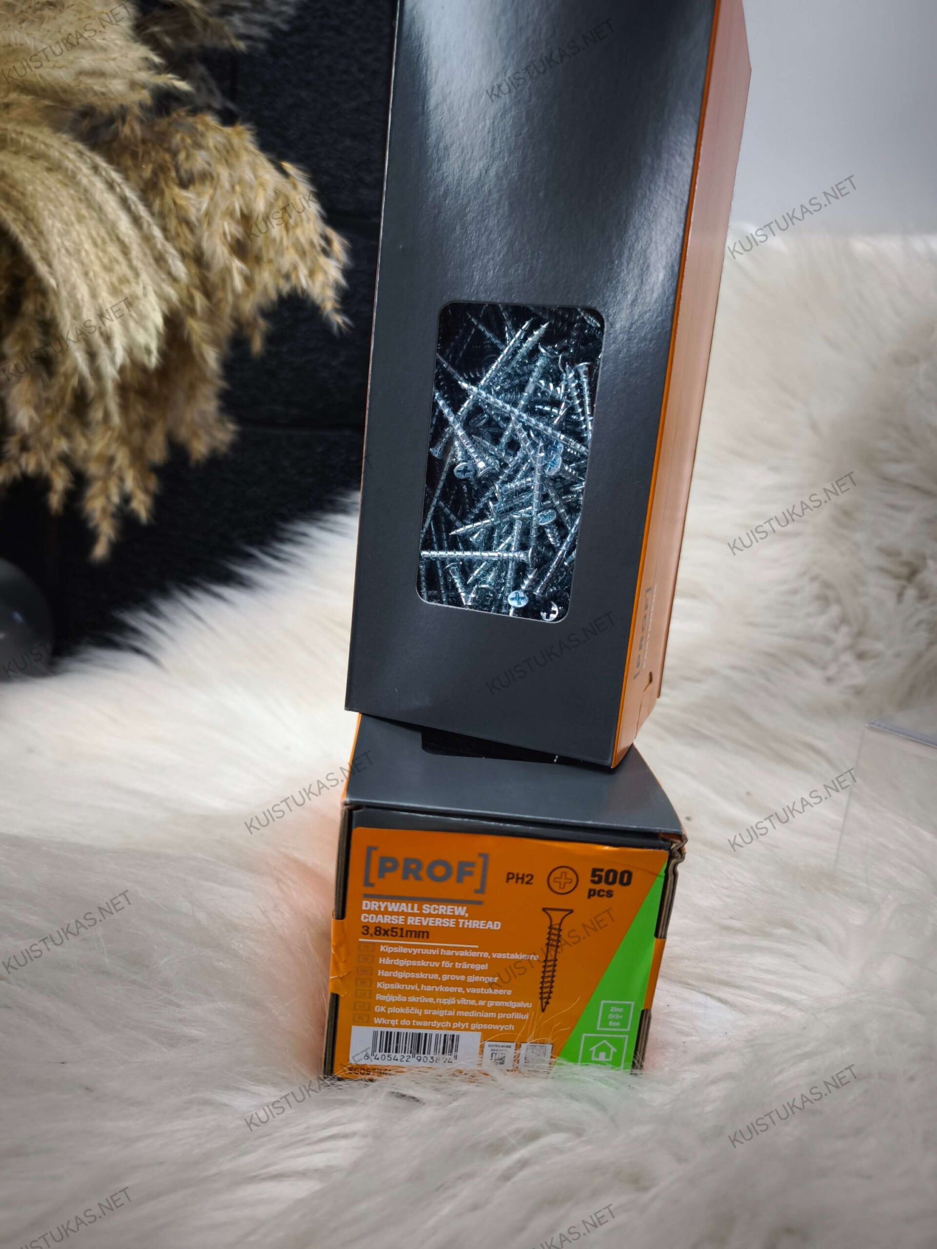Gipso kartono sraigtai „Prof“ 3,8×51 mm – patikimas pasirinkimas gipso kartono plokščių tvirtinimui prie medinių konstrukcijų.