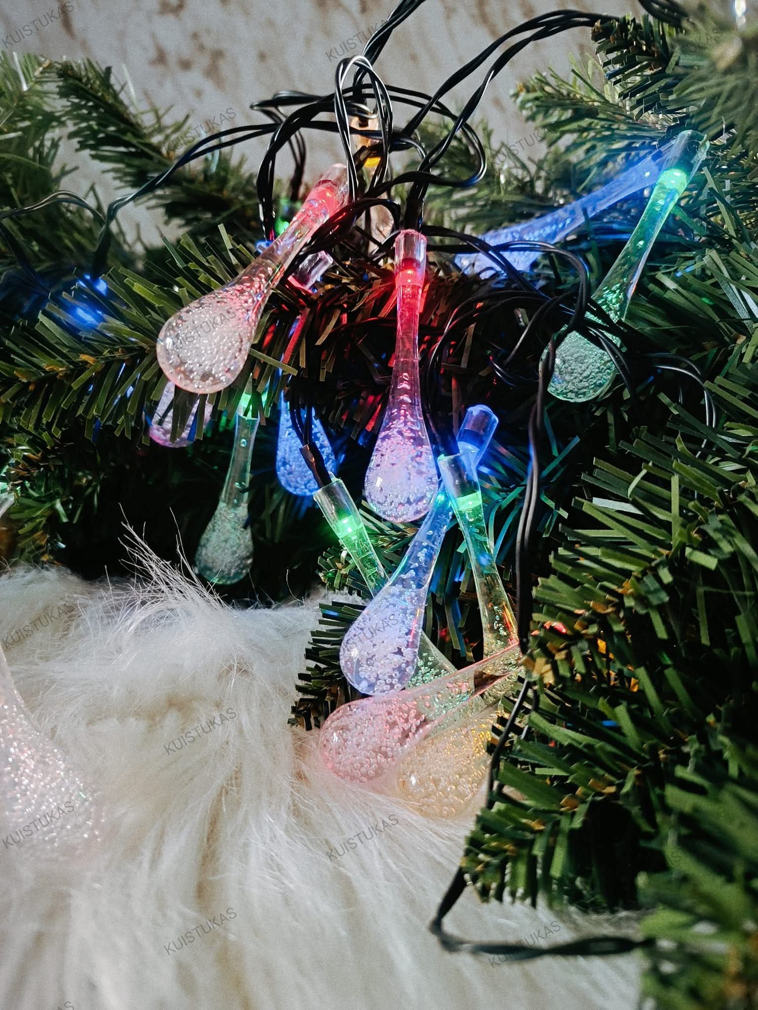 Girliandą sudaro 20 LED lempučių, įkomponuotų į lašelių formos korpusus, kurie sukuria magišką švytėjimą.