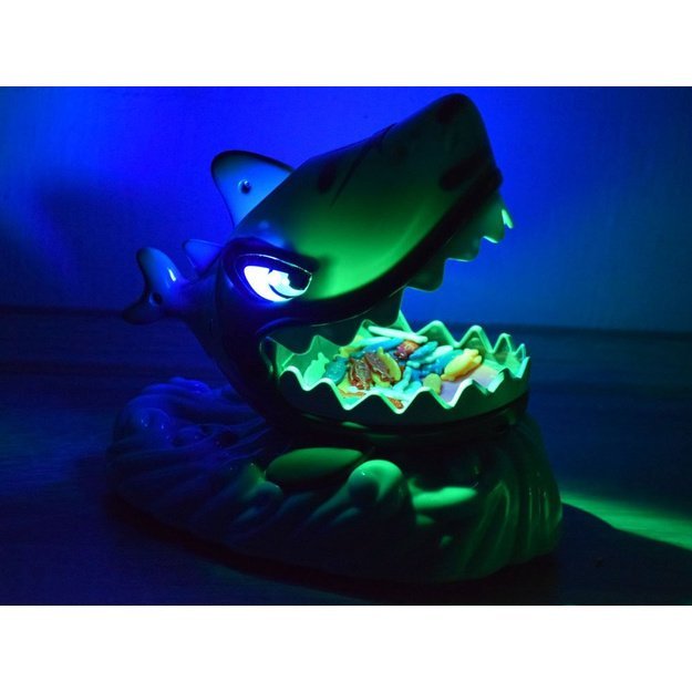 Rinkinyje rasite viską, ko reikia įspūdingam žaidimui: rykliuką su šviečiančiomis akimis ir burna, žuvytes bei žaidimo korteles.