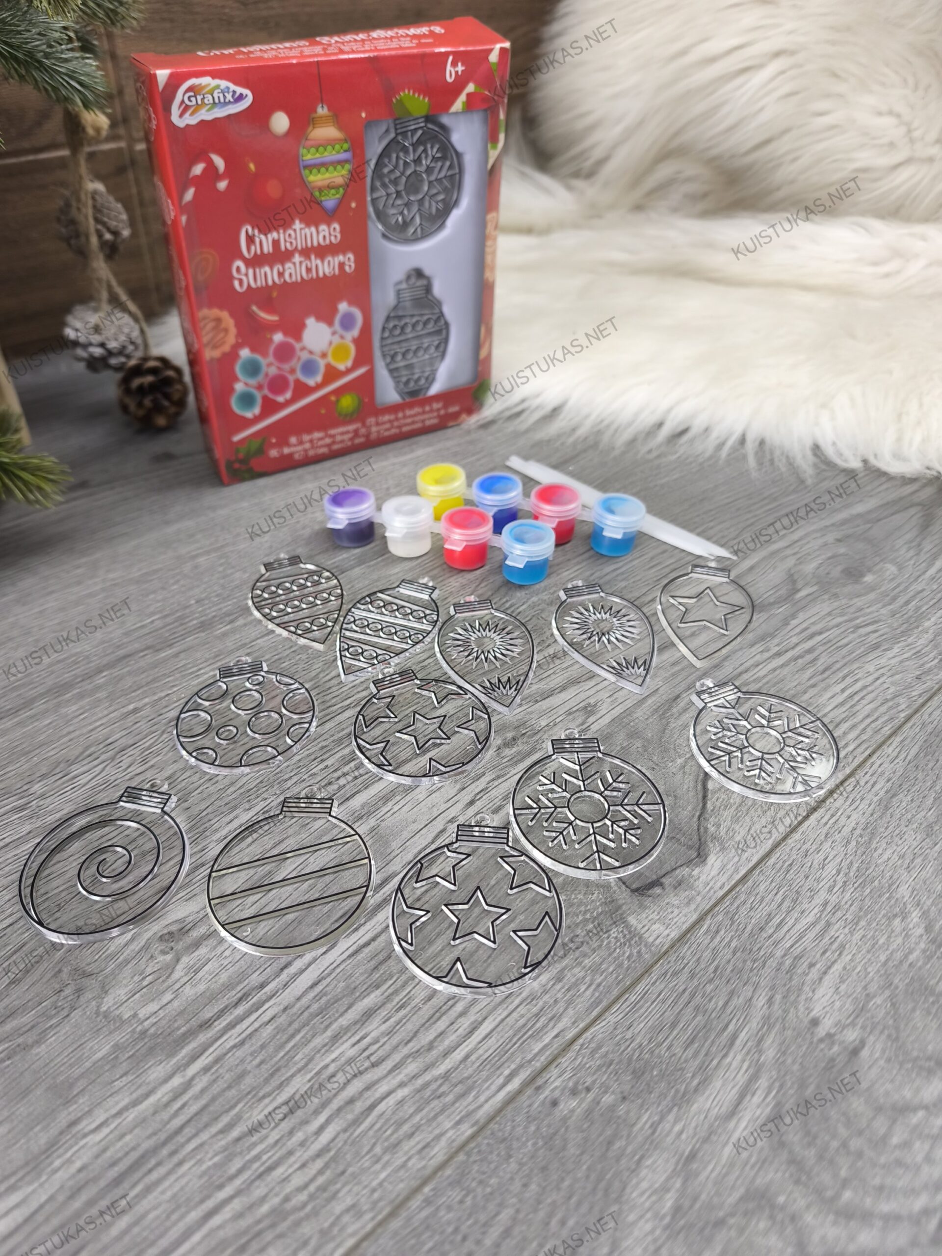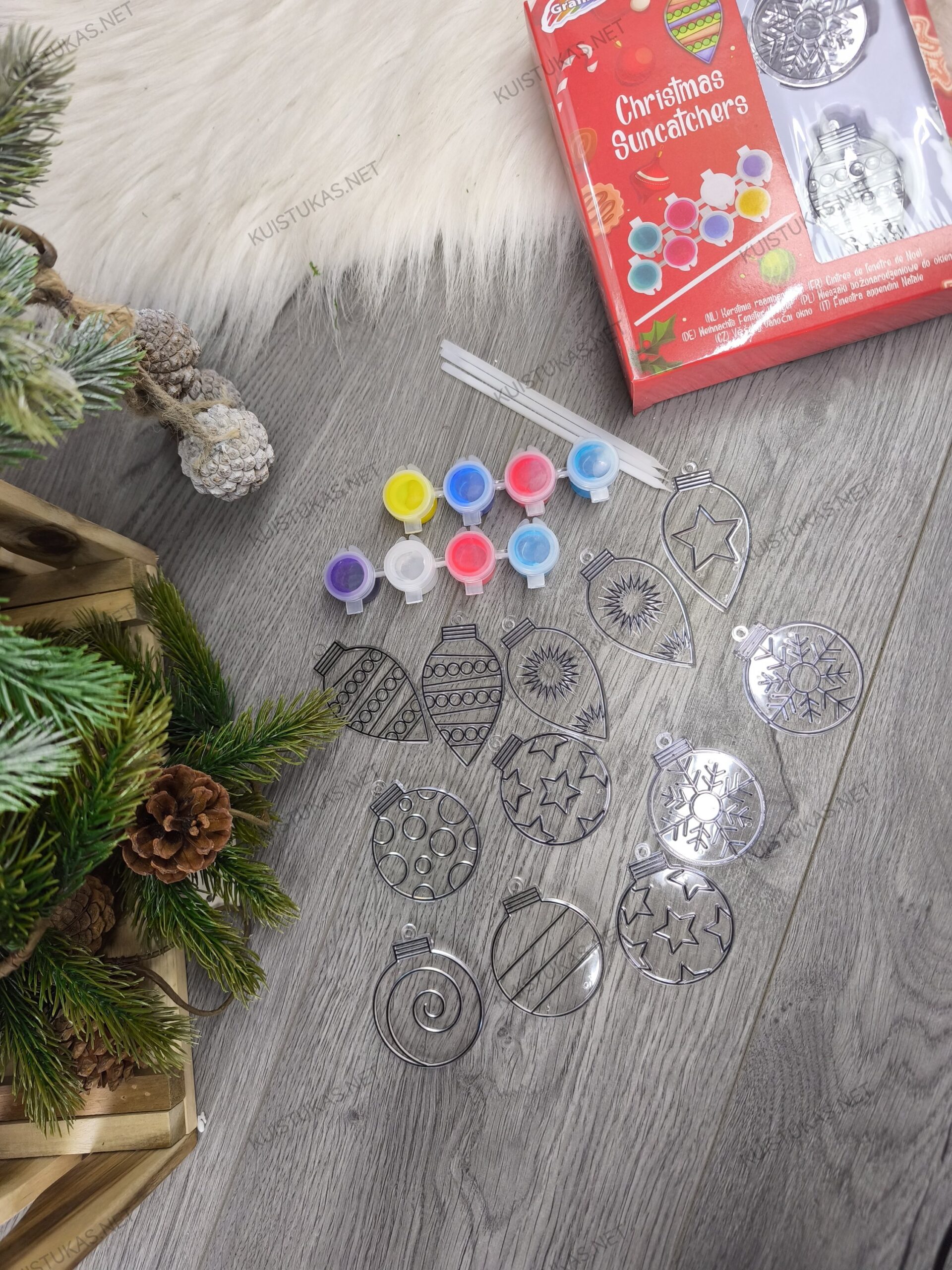 Rinkinyje rasite 8vienetus dažų indelių, treji pagaliukai bei 12vnt dekoruoti tinkamų žaisliukų.