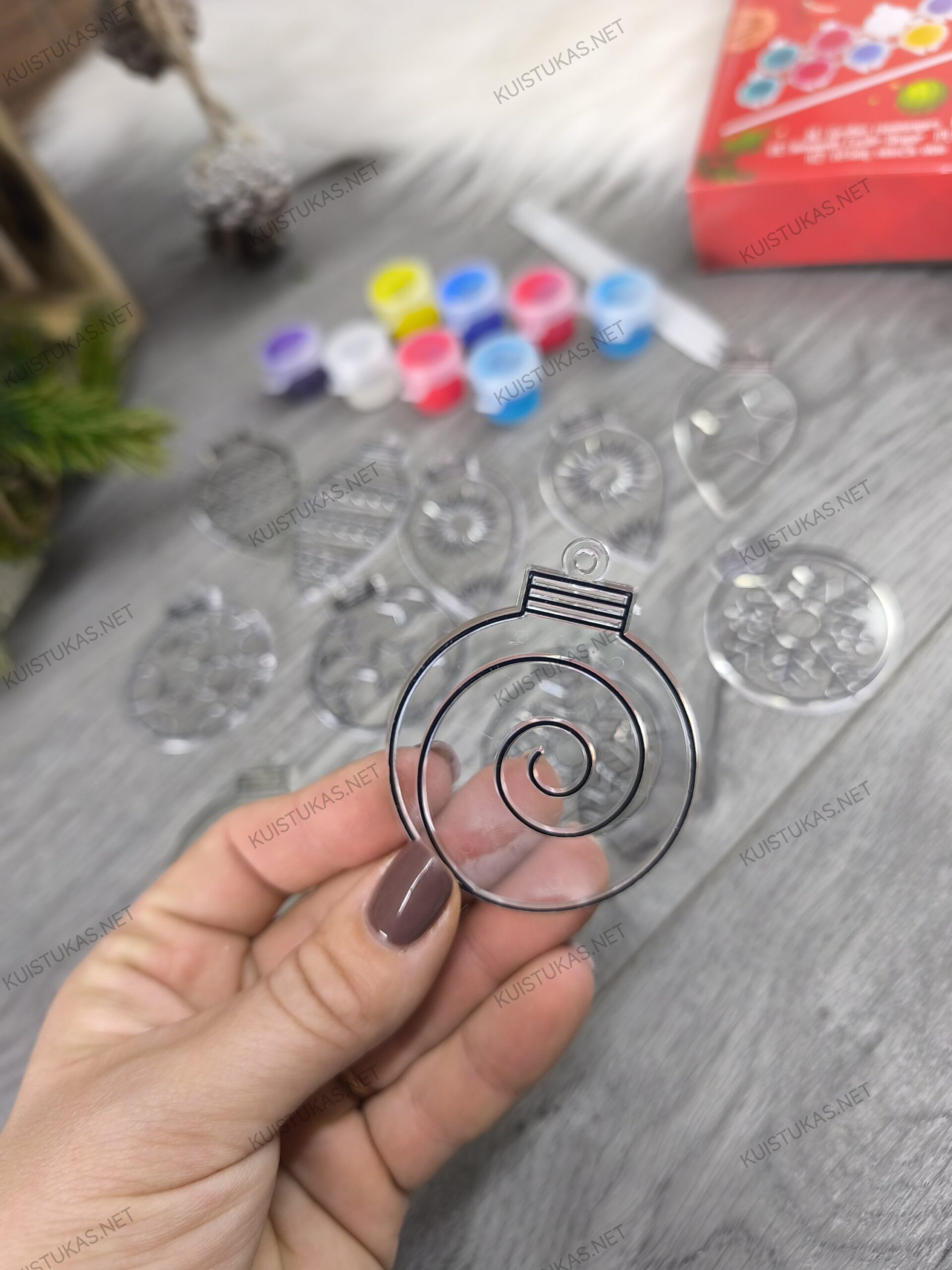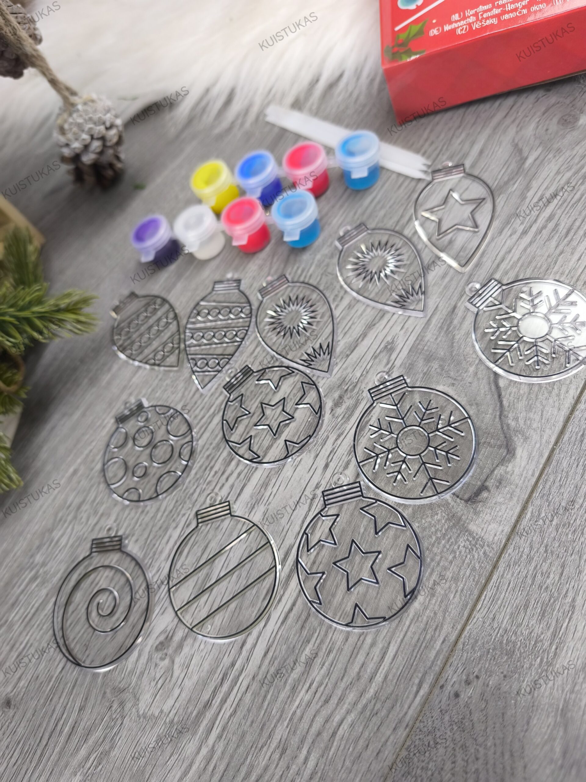 12 skaidrių plastiko žaisliukų su įvairiais ornamentais (žvaigždės, snaigės, apskritimai ir kt.);