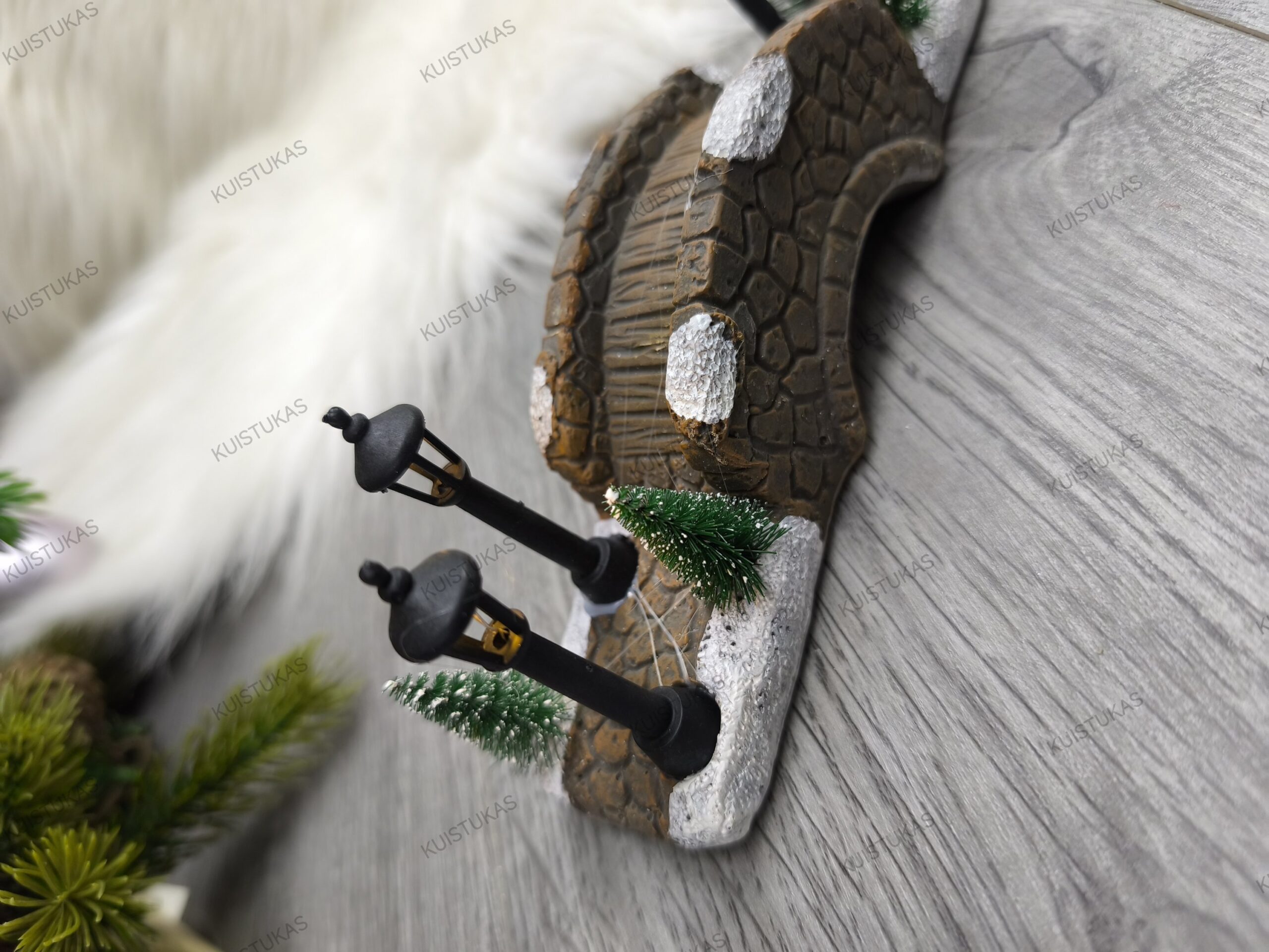 Dekoracijoje integruotos smulkios detalės – akmeninio tilto imitacija, apsnigtos eglutės ir keturi elegantiški stulpiniai žibintai su šiltai baltomis LED lemputėmis.