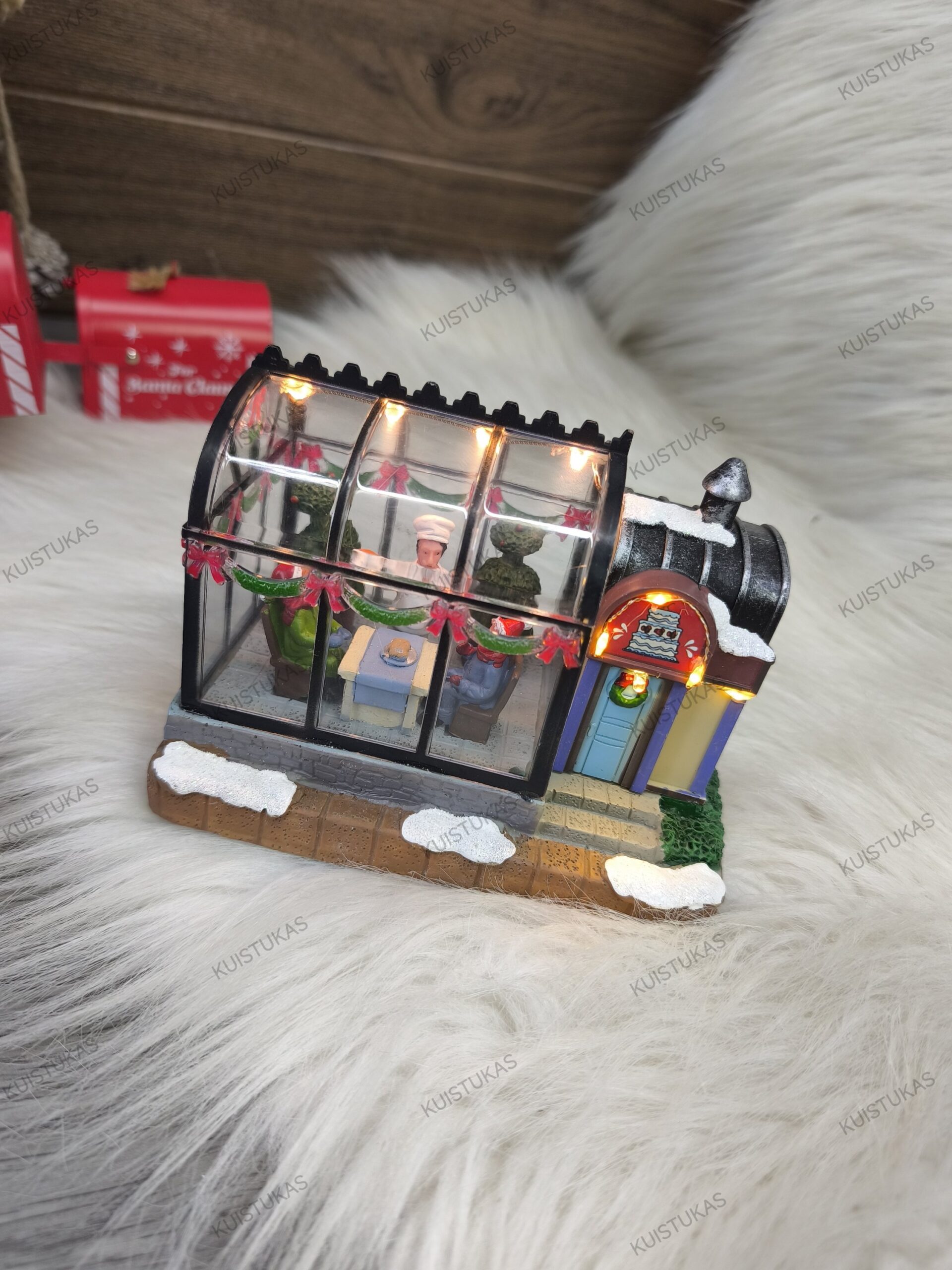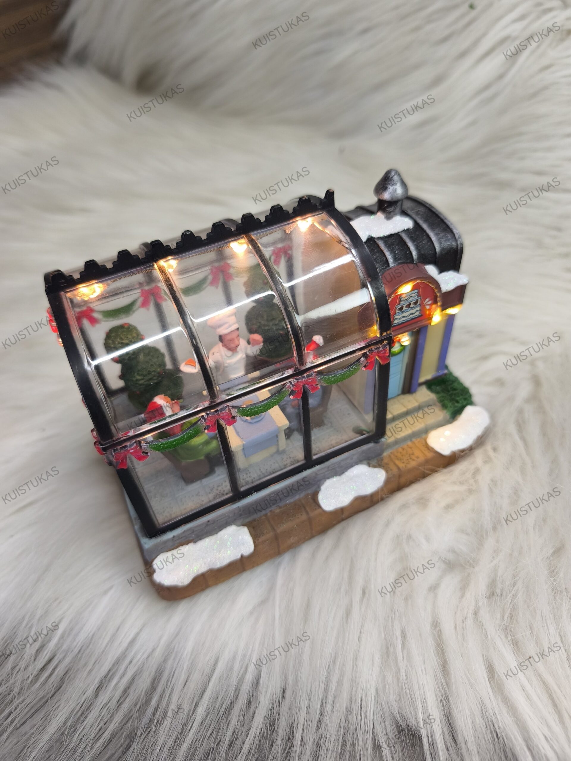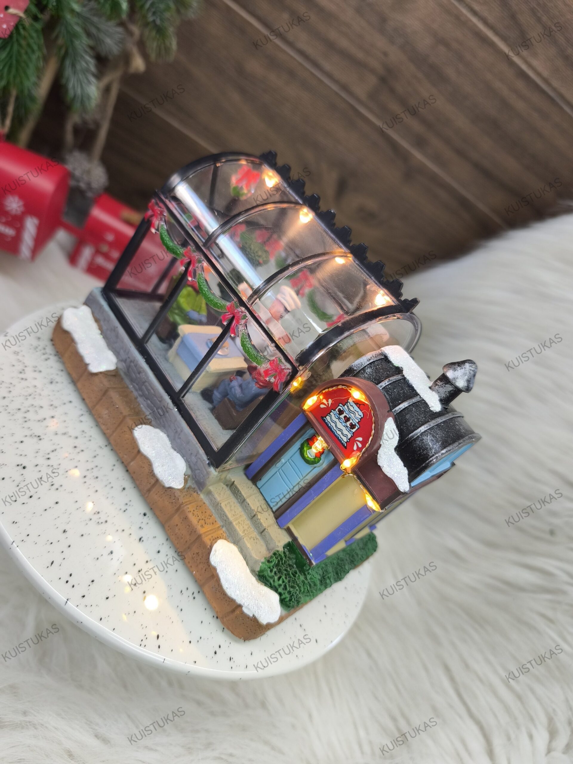 Dėl savo dizaino jis puikiai dera prie kitų kalėdinių miestelių elementų – tiltelių, karuselių, traukinių ar kitų dekoracijų.
