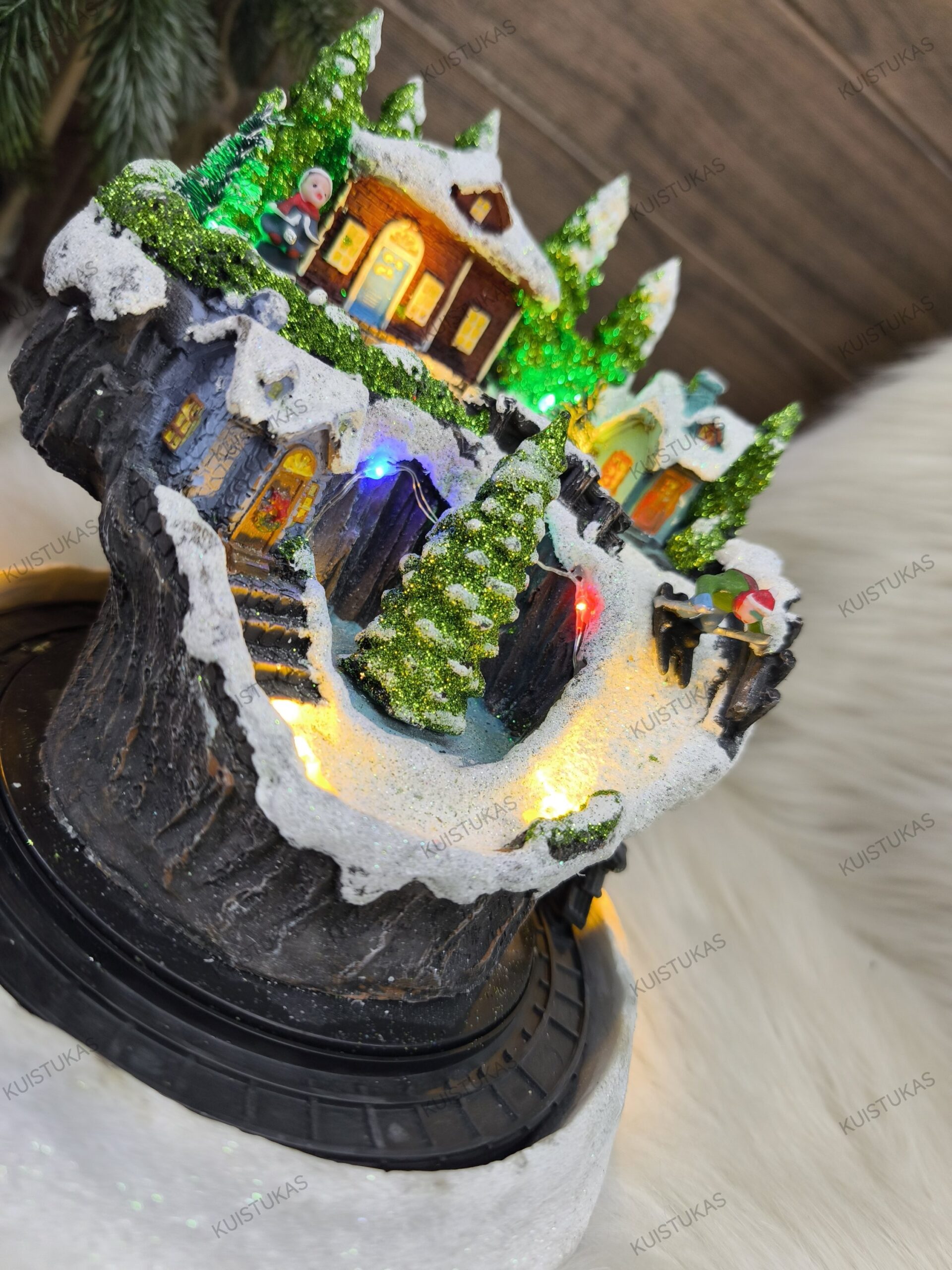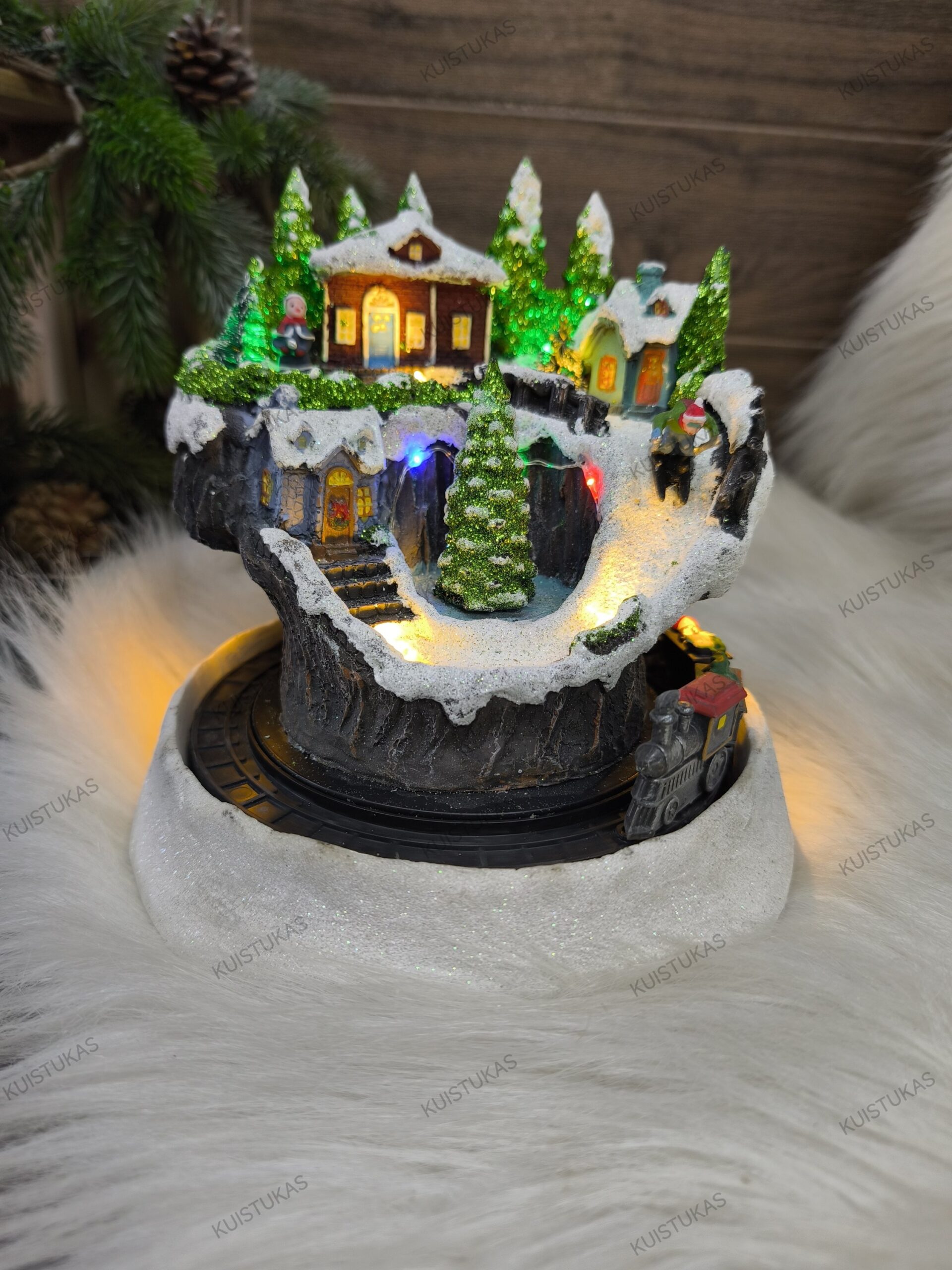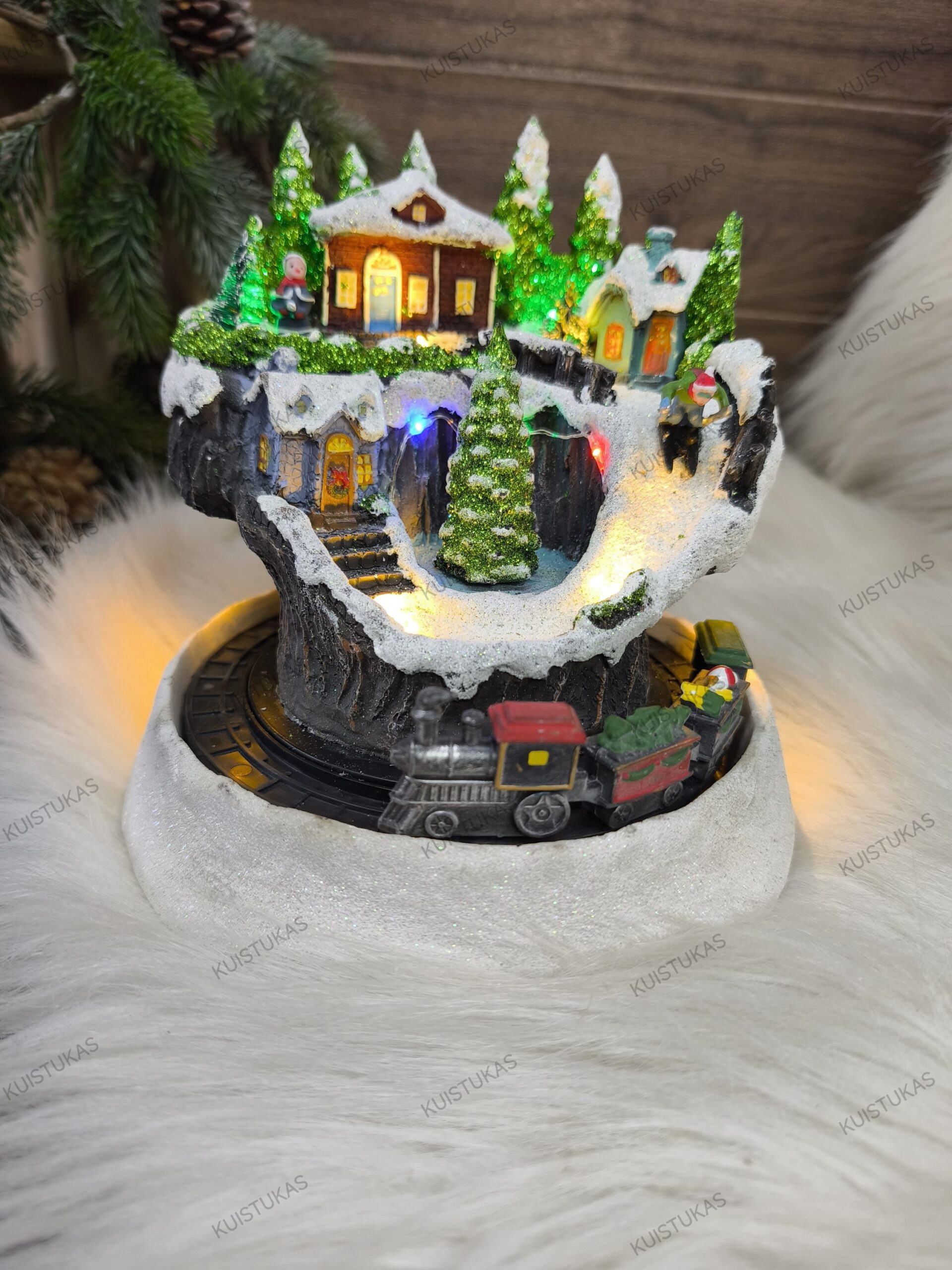 Ši dekoracija ypatinga tuo, kad joje įmontuotas traukinukas, kuris sukasi aplink miestelį, suteikdamas visam vaizdui gyvybingumo ir judesio.