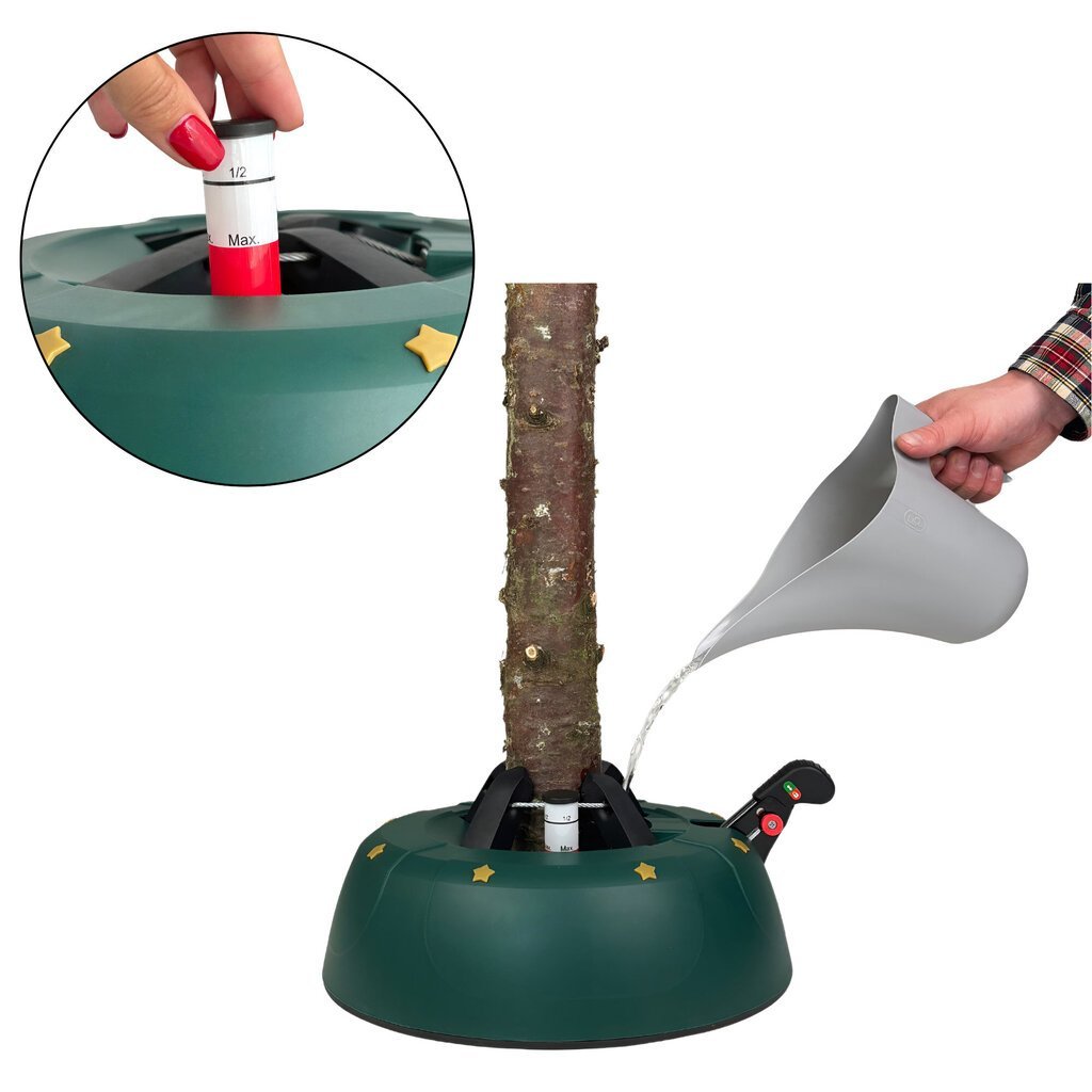 Vienos linijos plieninis užveržimo mechanizmas leidžia lengvai ir greitai pritvirtinti eglę, o vandens lygio indikatorius (plūdė) padeda išlaikyti visą švenčių laikotarpį.
