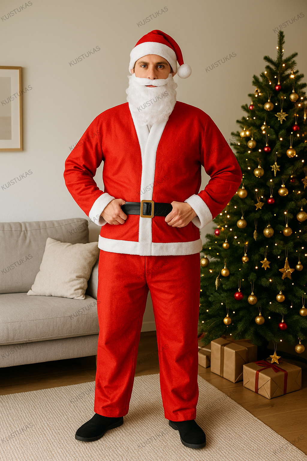 Kostiume numatytos visos būtinos detalės, kurios padeda sukurti tikro Kalėdų senelio įvaizdį – tai ne tik drabužiai, bet ir aksesuarai, užbaigiantys bendrą išvaizdą.