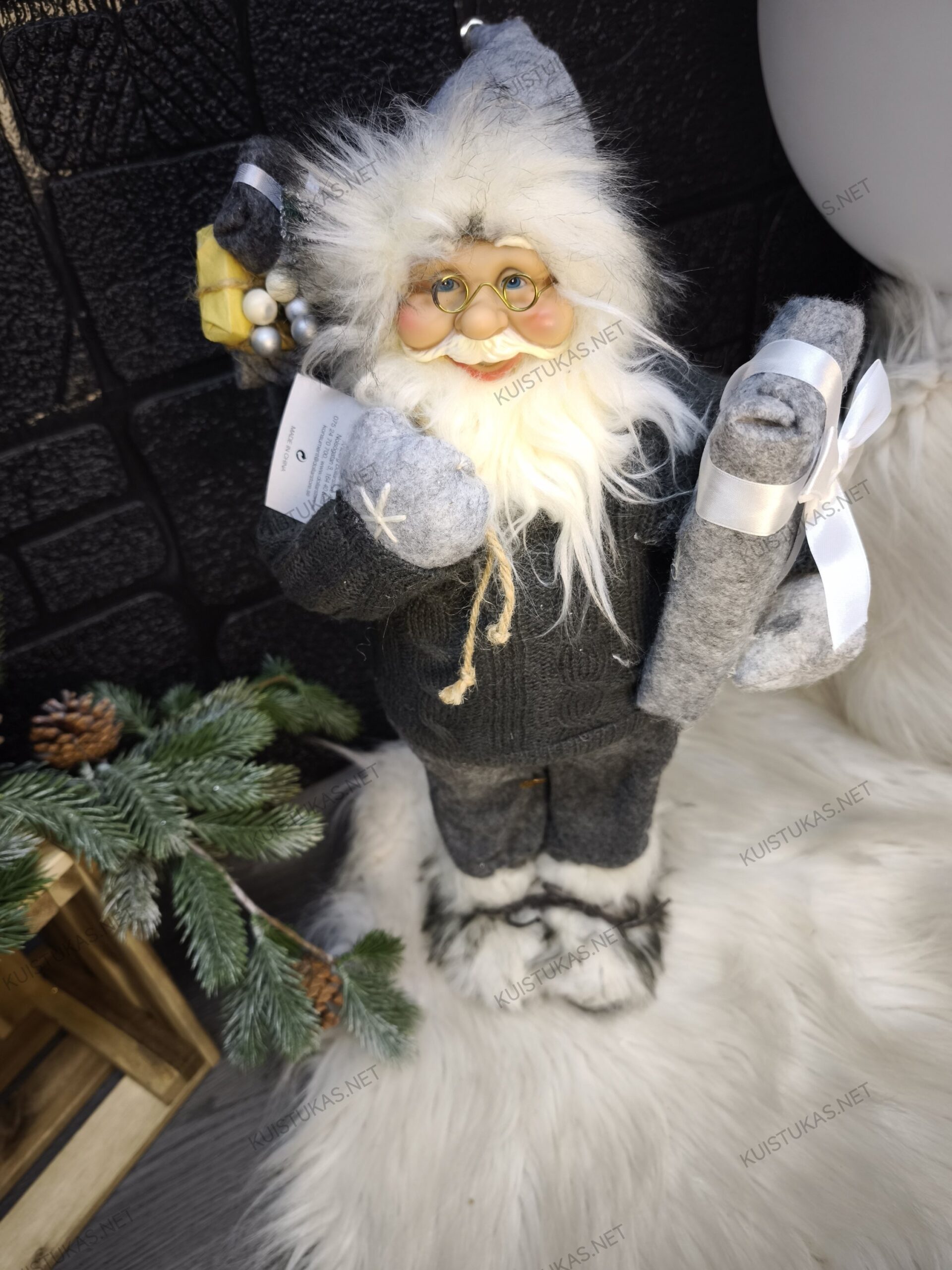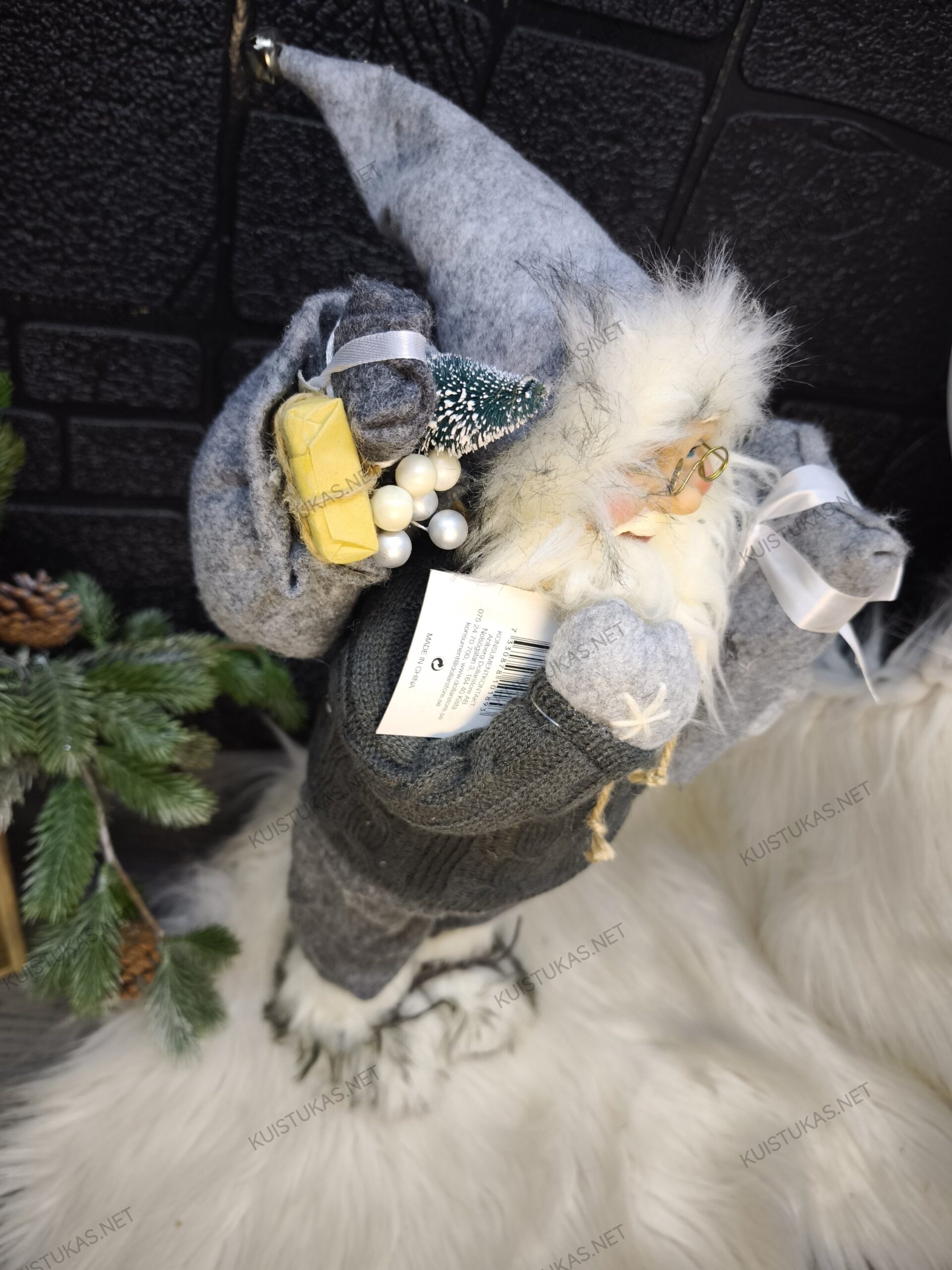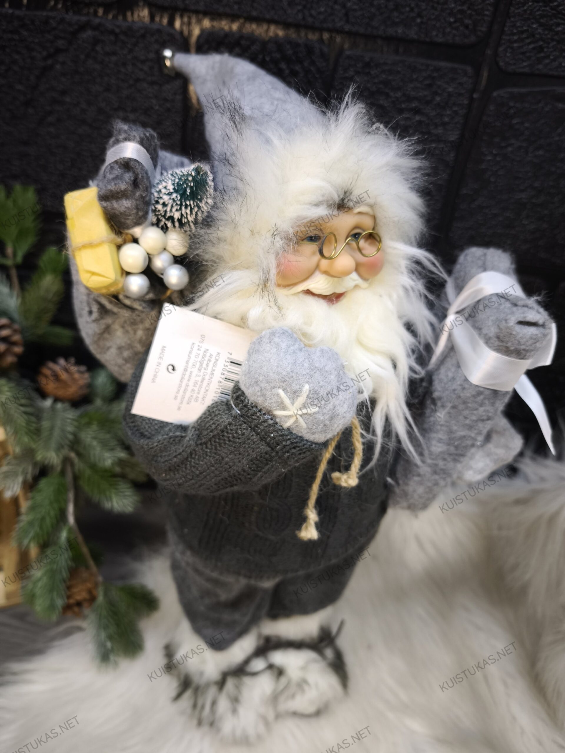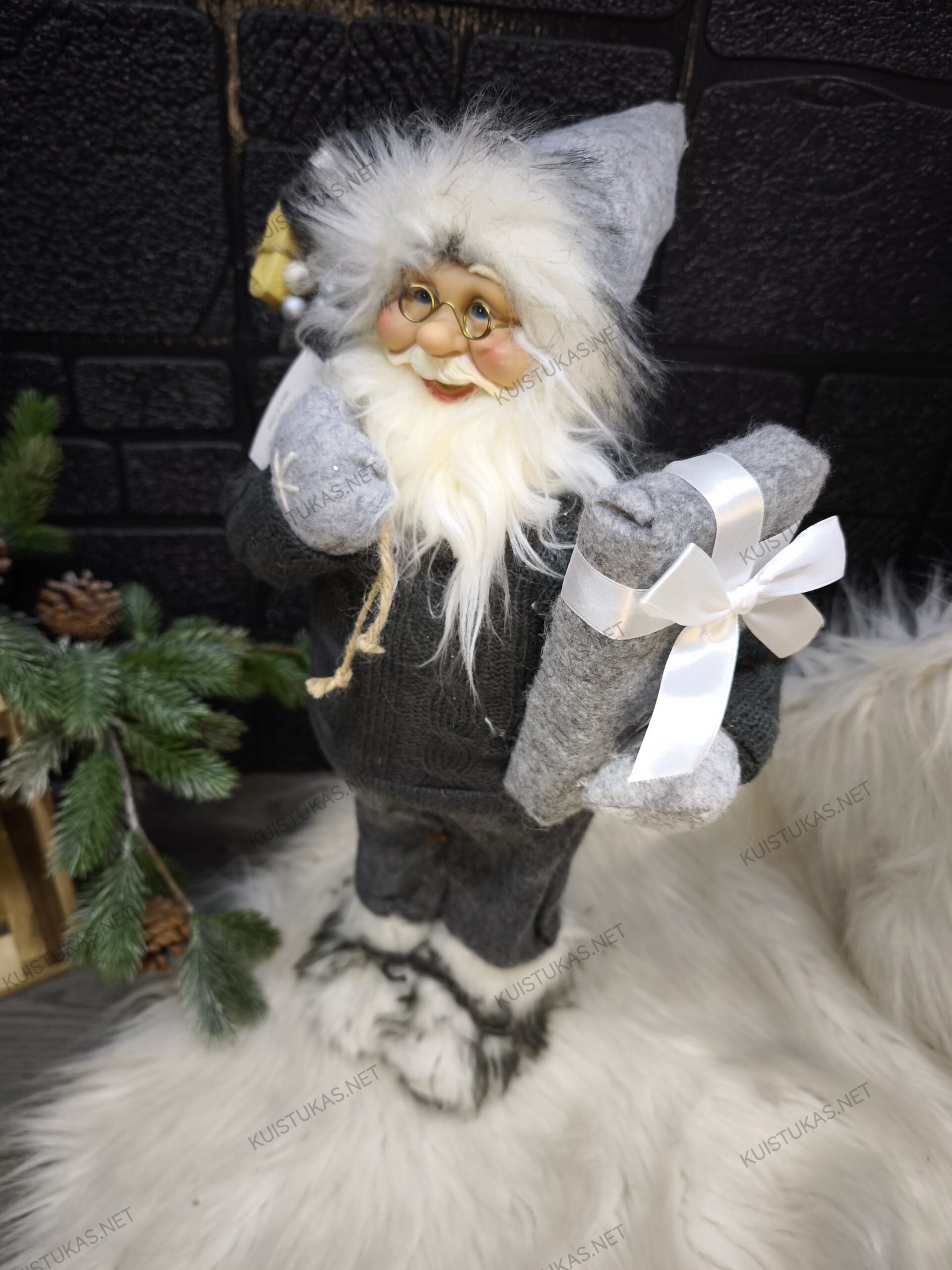 Stilingas, tinka Kalėdų senelis su pilka apranga ir dovanų maišu puikiai dera prie modernių, minimalistinių, klasikinių ar kaimiško stiliaus interjerų.