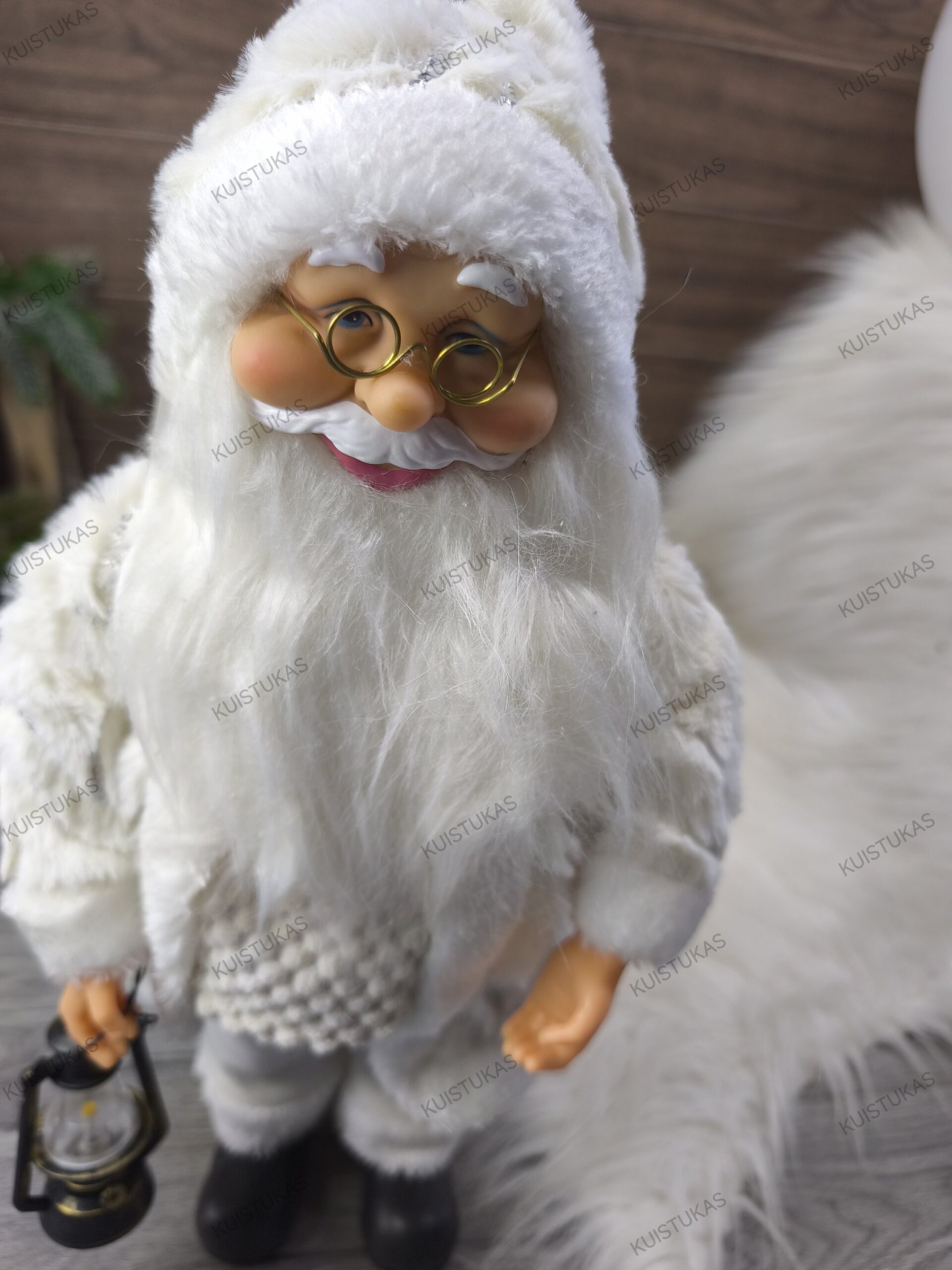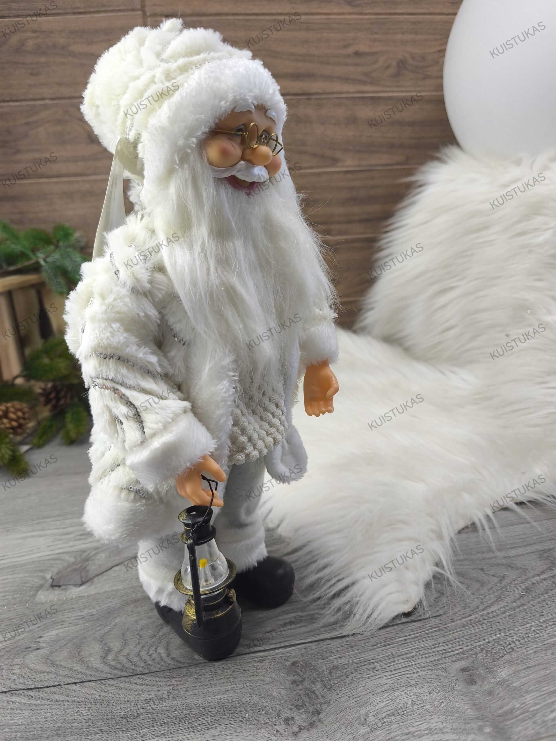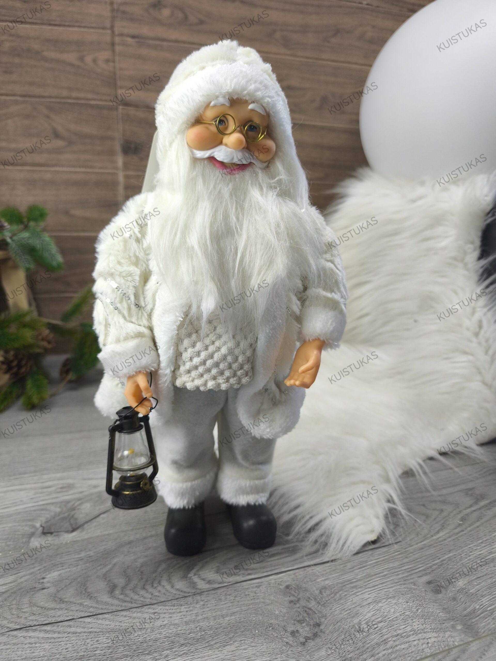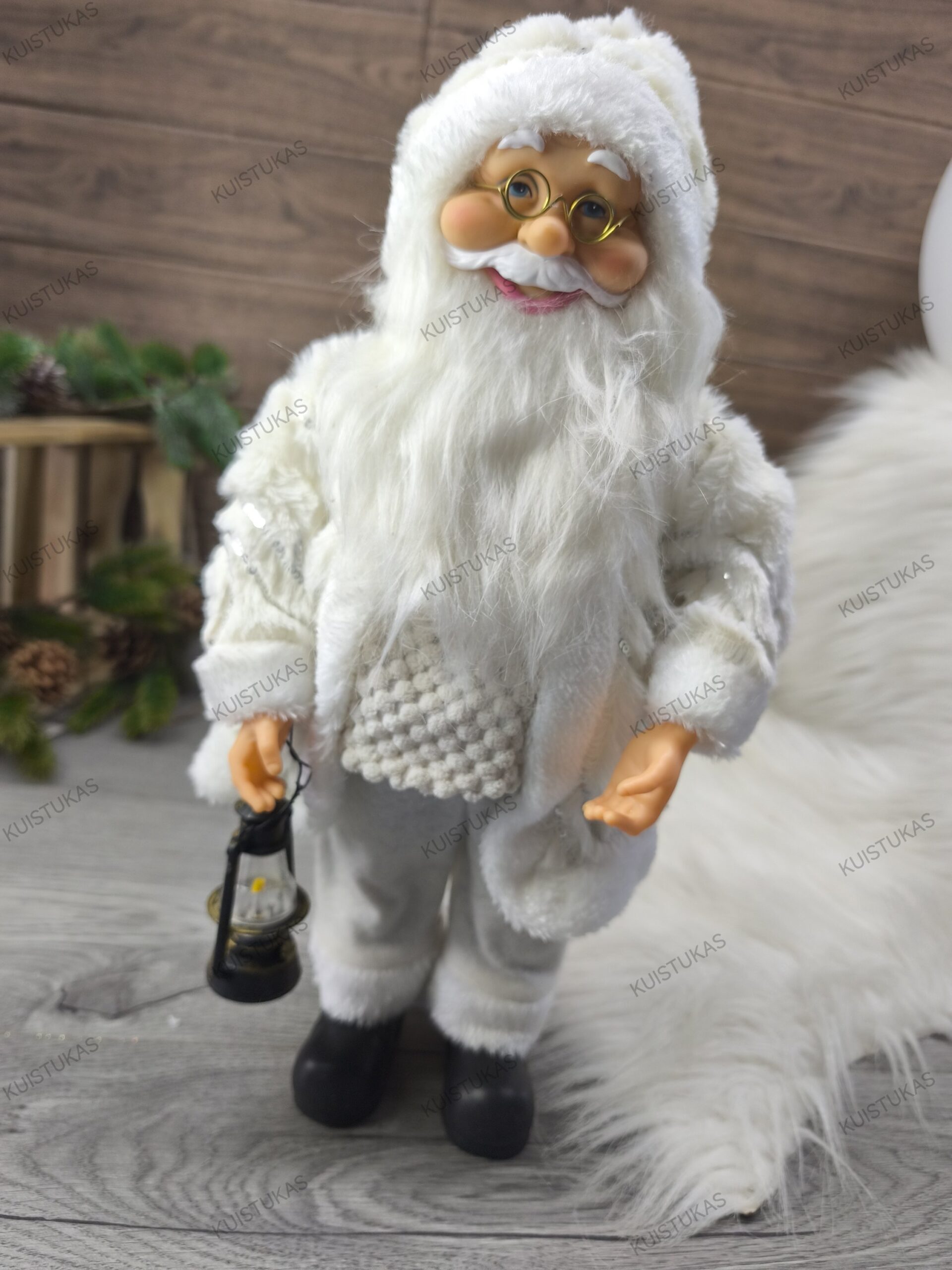 Jo apdarai pagaminti iš kokybiškų medžiagų, o kruopščiai detalizuota išvaizda – akiniai, ilga balta barzda, šiltas megztinis ir kailinukai – suteikia dekoracijai tikroviškumo.