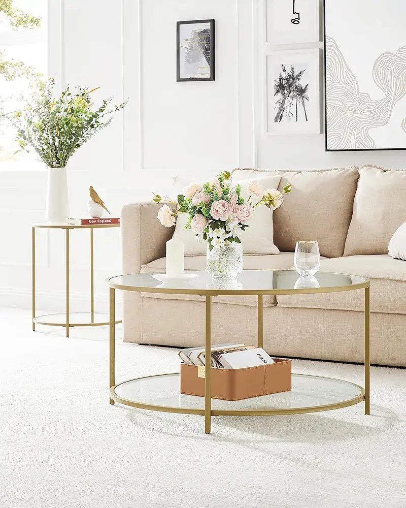 Du stikliniai paviršiai leidžia patogiai laikyti tiek dekoracijas, tiek kasdienius daiktus – knygas, žurnalus ar gėrimus.