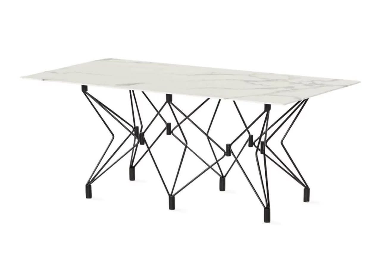 Tvirta metalinių kojų konstrukcija su subtiliai įmantriu dizainu užtikrina stalo stabilumą ir suteikia jam industrinio lengvumo pojūtį.