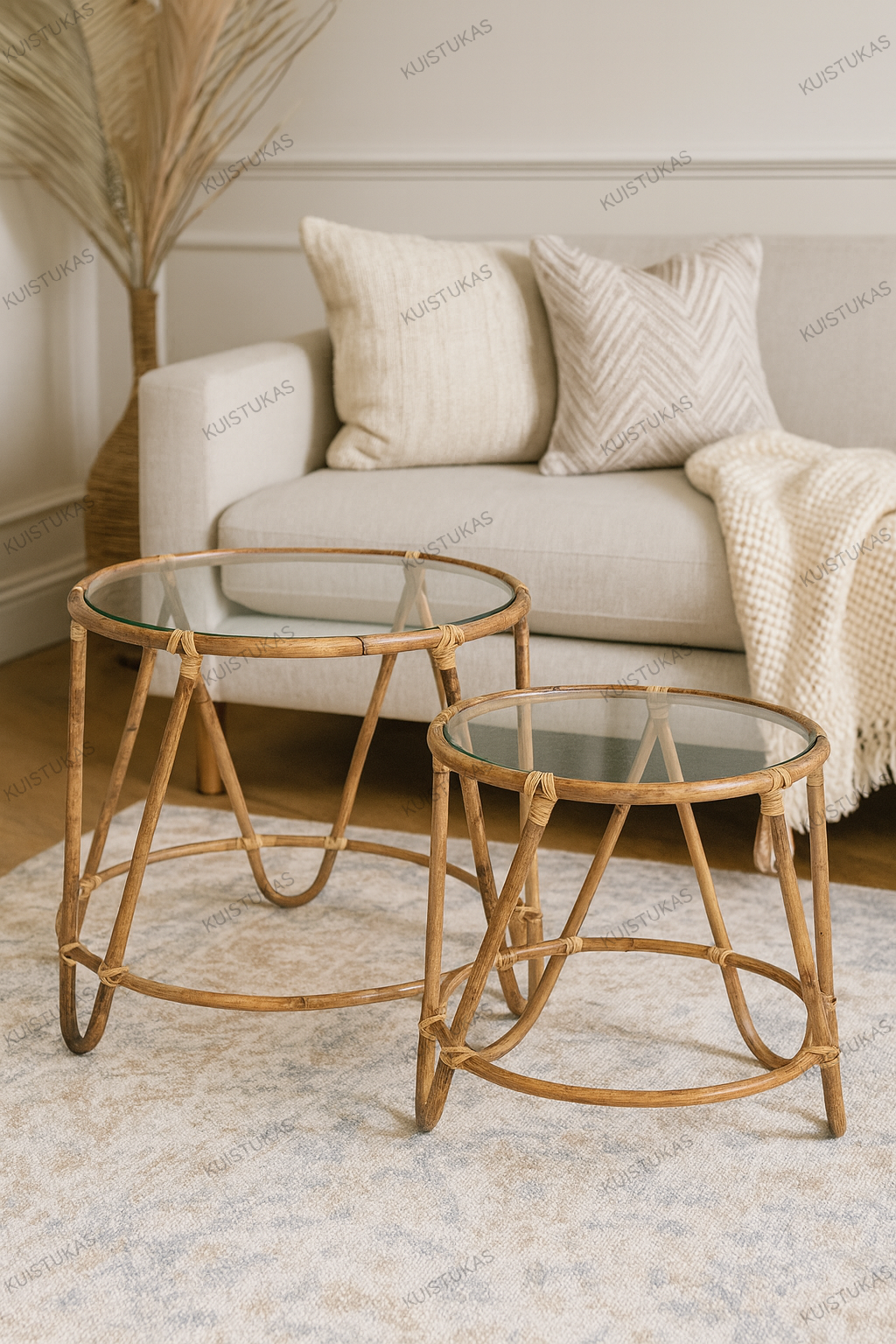 Ieškote stilingo ir praktiško sprendimo savo svetainei ar poilsio zonai? Kavos staliukų komplektas su stikliniais paviršiais ir natūralios rotango imitacijos konstrukcija – puikus pasirinkimas jaukiai ir šiuolaikiškai namų aplinkai.