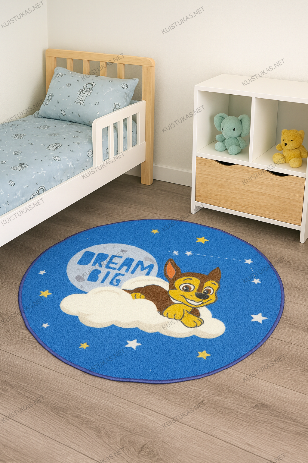 Ryškiai mėlynas fonas, žvaigždžių motyvai ir mylimas personažas Chase skatina kūrybiškumą, žaidimus ir jaukumą.