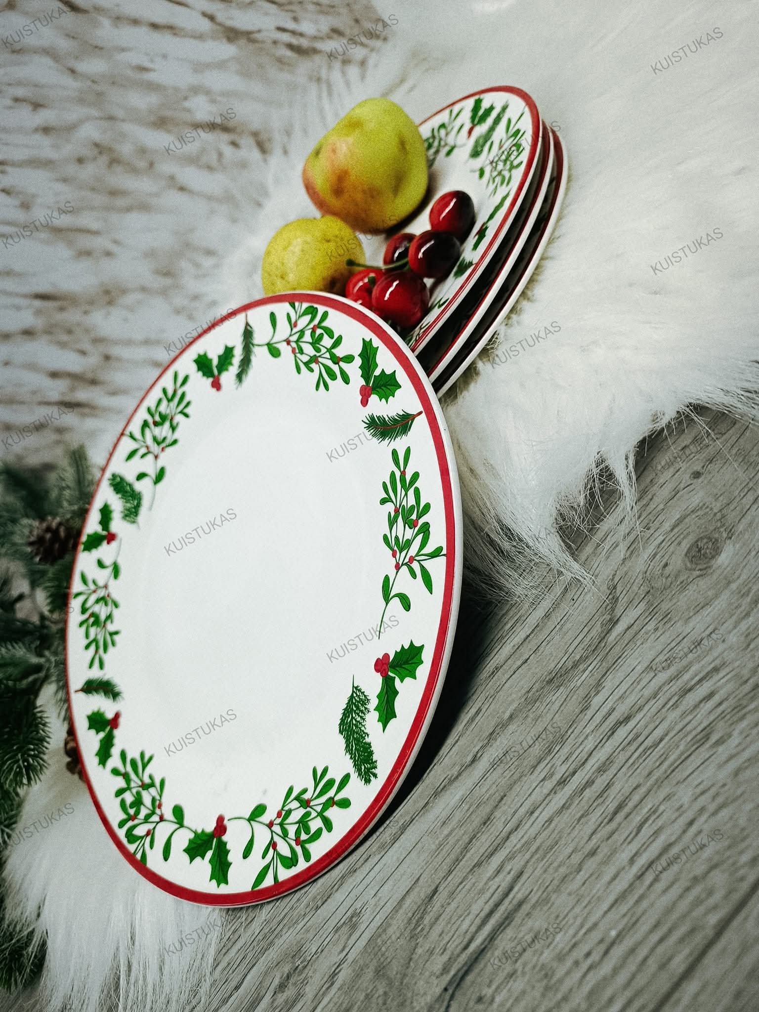 Komplektą sudaro 4 keraminės lėkštės, dekoruotos subtiliu šventiniu raštu – žalių šakelių ir raudonų uogų motyvais, įrėmintais raudoname apvade.