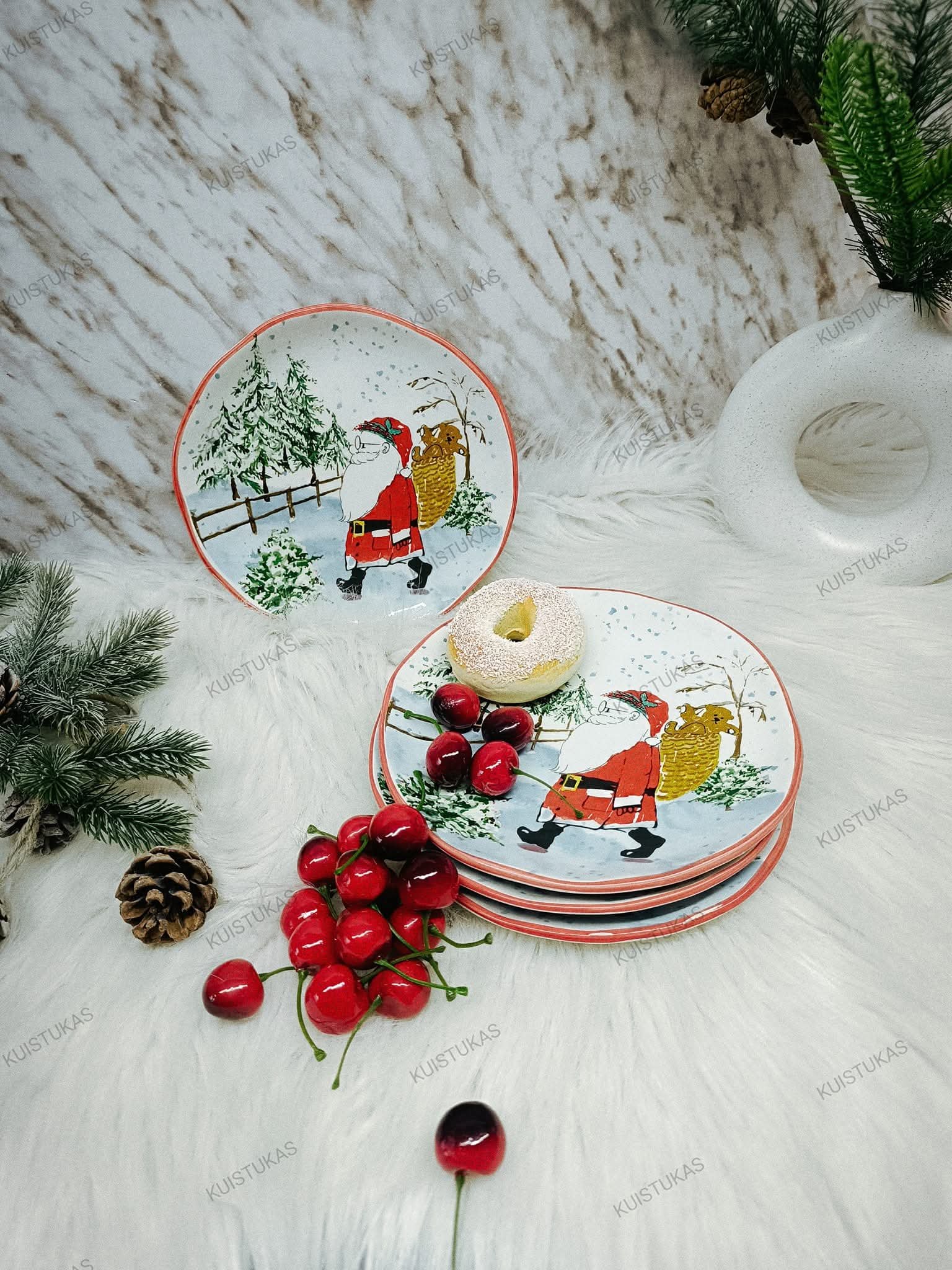 Komplektą sudaro 4 keraminės lėkštės, kurių kiekviena papuošta jaukiu piešiniu – Kalėdų Senelis žingsniuoja snieguotu mišku, nešdamas dovanų pintinę.