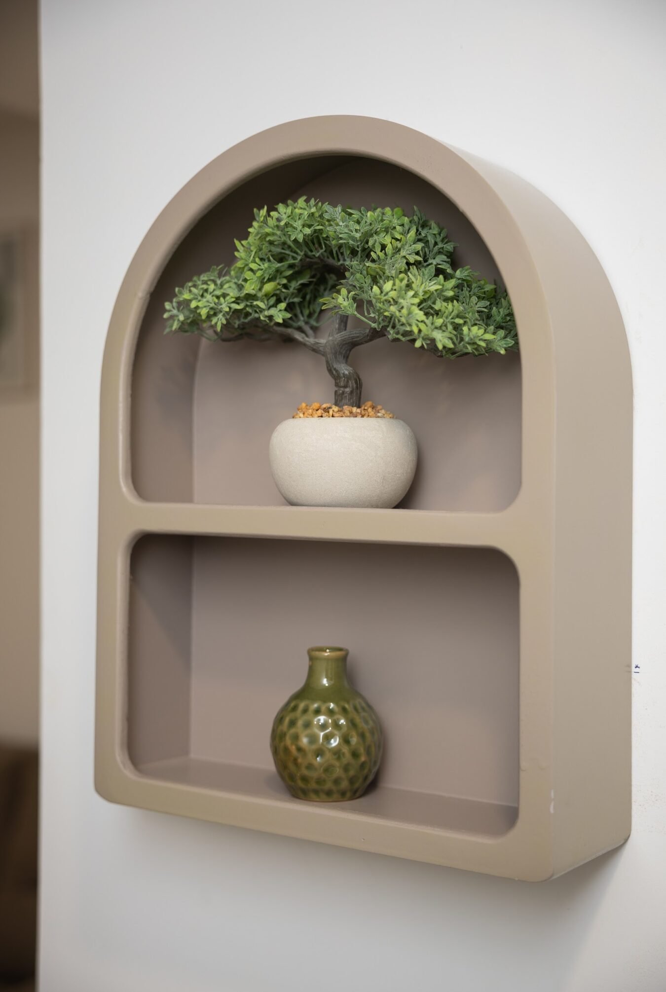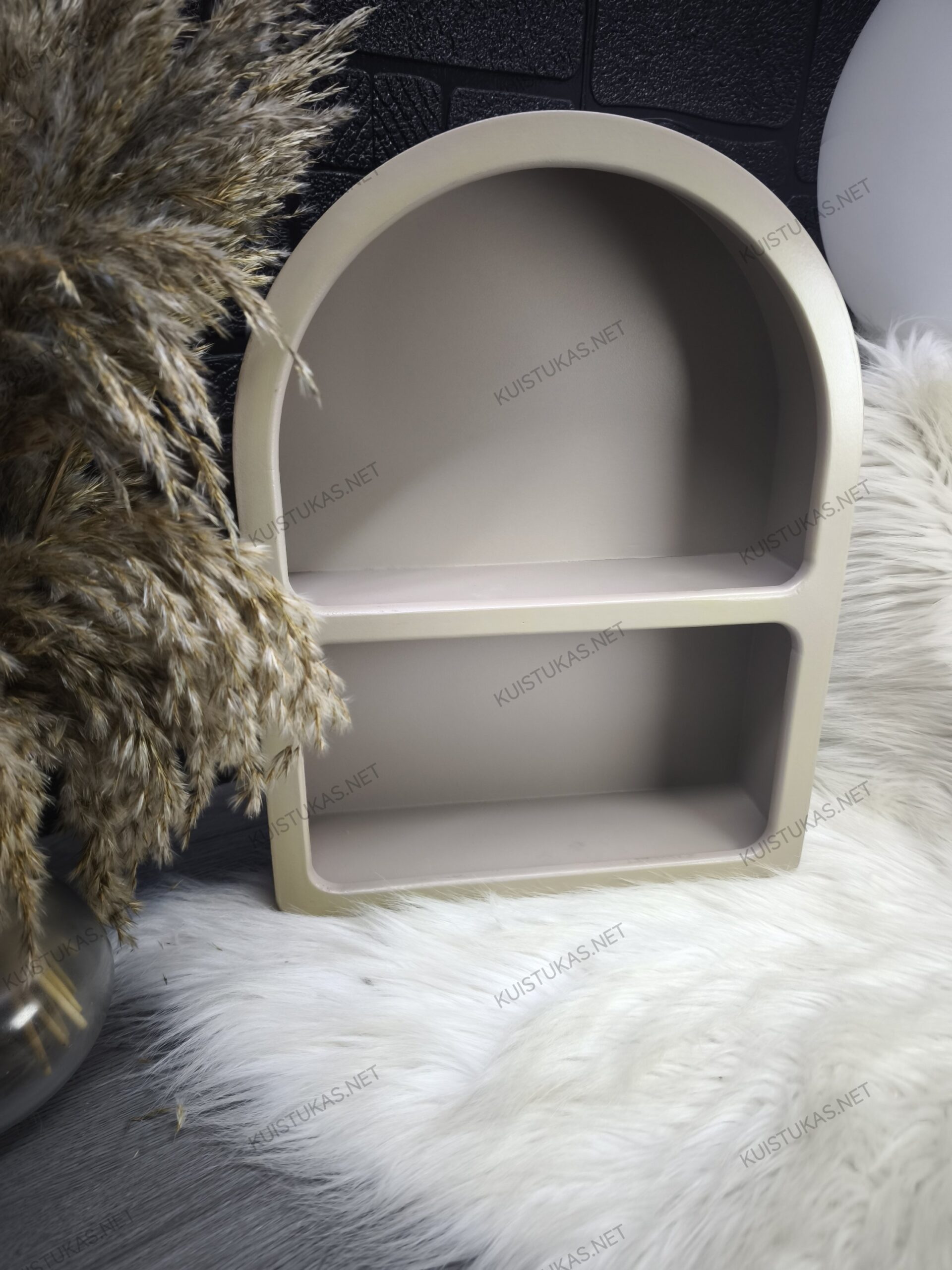 Ši dekoratyvinė sieninė lentyna išsiskiria švelnia arkos formos konstrukcija, kuri suteikia erdvei lengvumo, minkštumo ir vizualinio balanso.