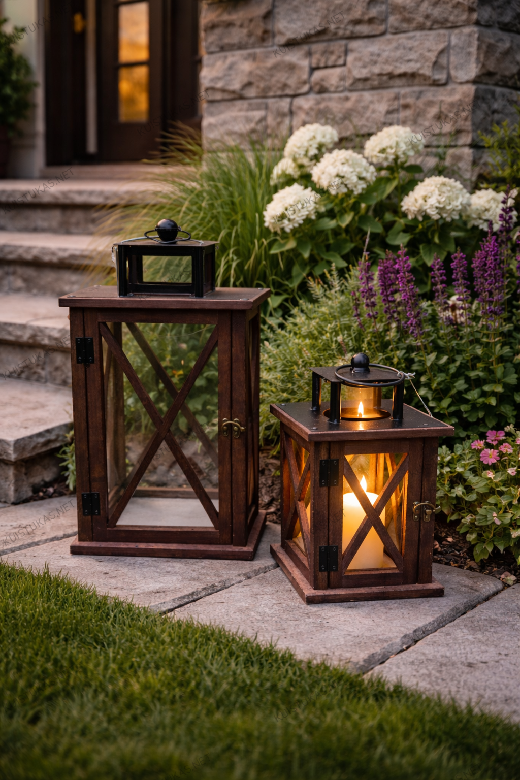 Rustic stiliaus medinių žibintų komplektas – šiltai atmosferai kieme, terasoje ar namuose.