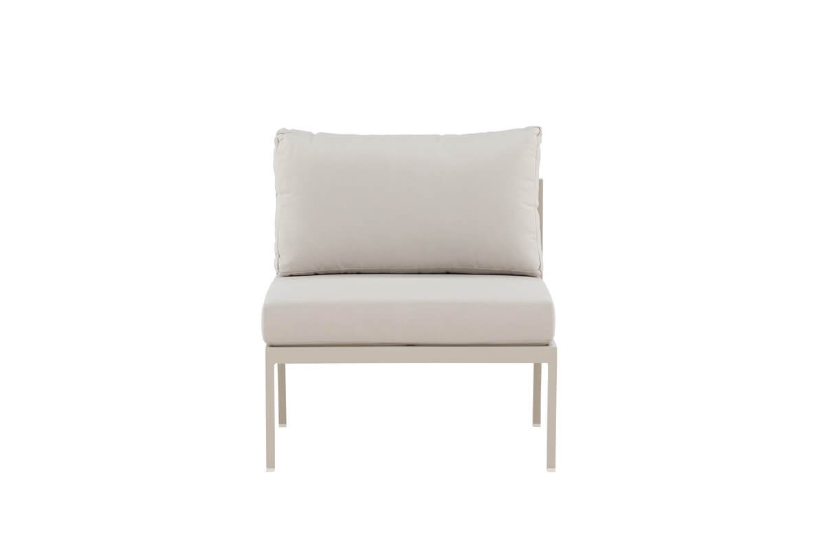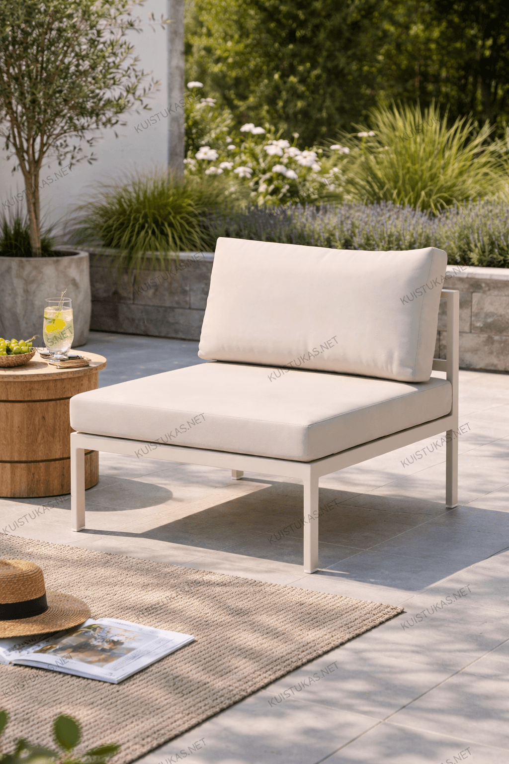 Minimalistinis dizainas ir švelnus smėlio spalvos audinys leidžia šiam foteliui lengvai derėti prie įvairių lauko interjero sprendimų.
